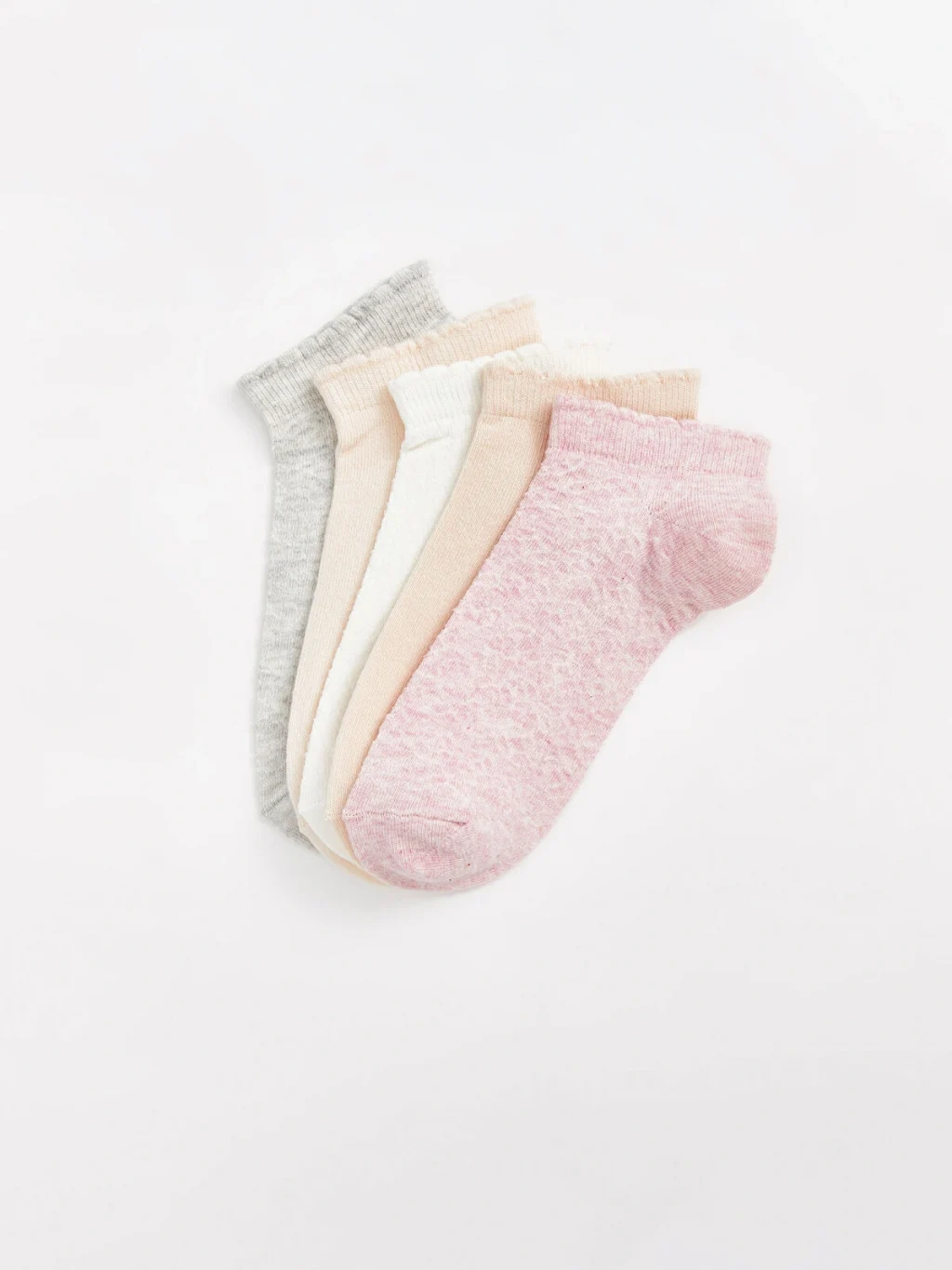 Pamuk karışımlı elyaftan üretilen patik çoraplar, yumuşak ve konforlu bir dokuya sahiptir. Düz, sade tasarımıyla doğal bir görünüm sunar ve 5 çift patik çoraptan oluşmaktadır.