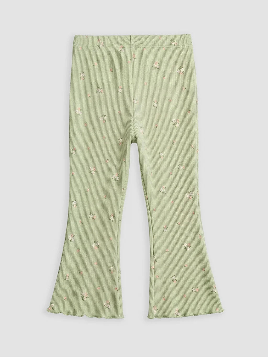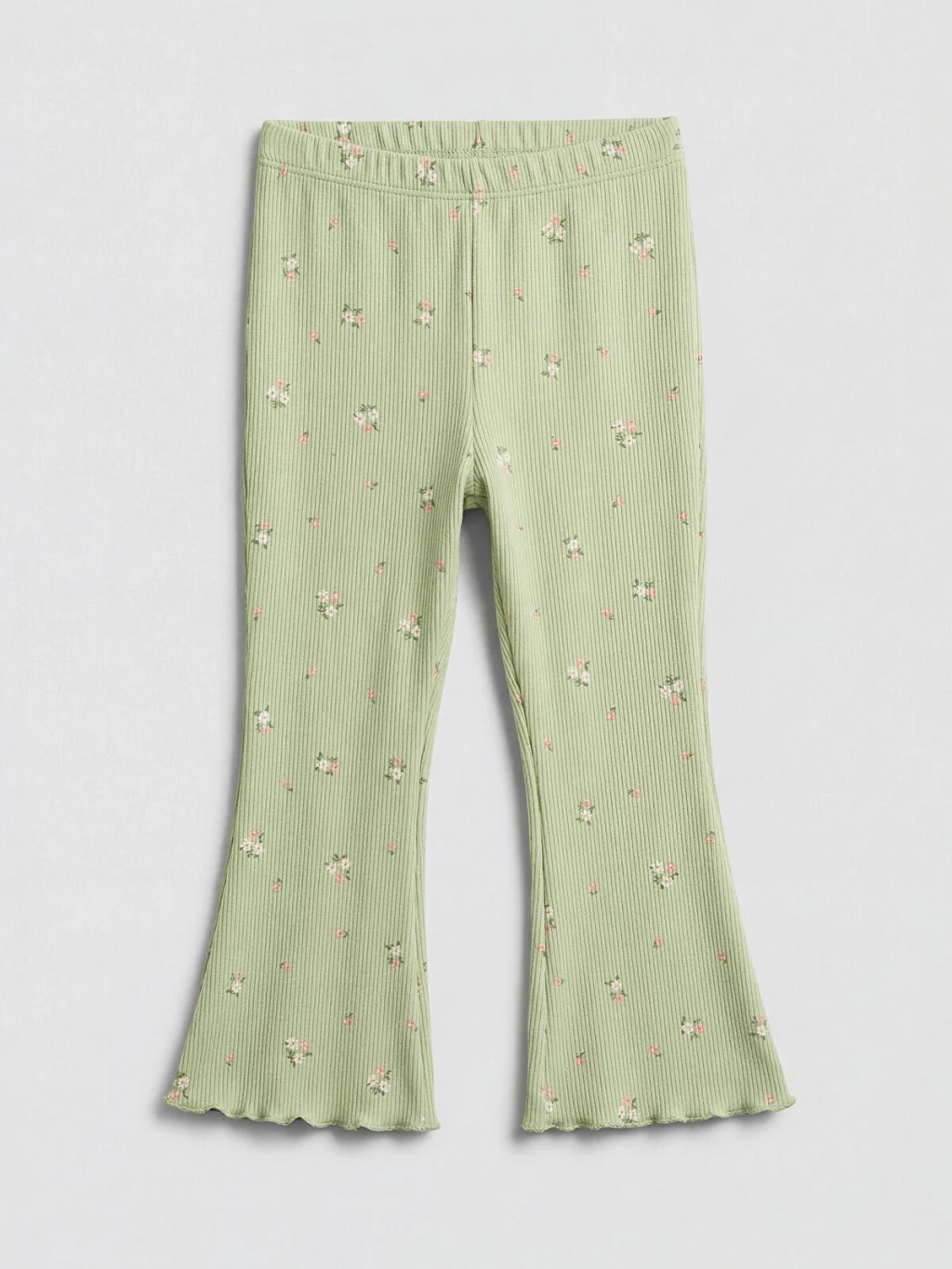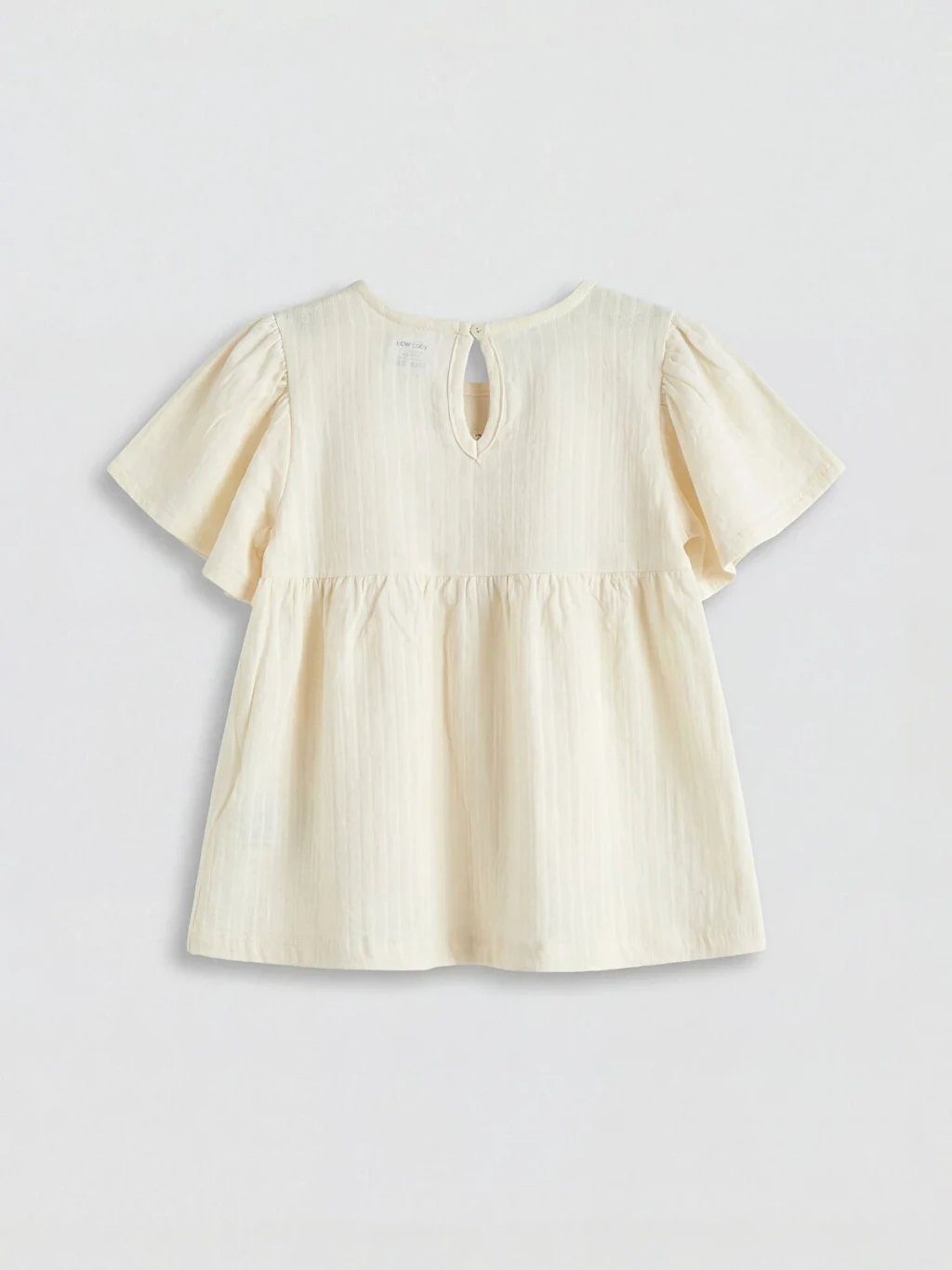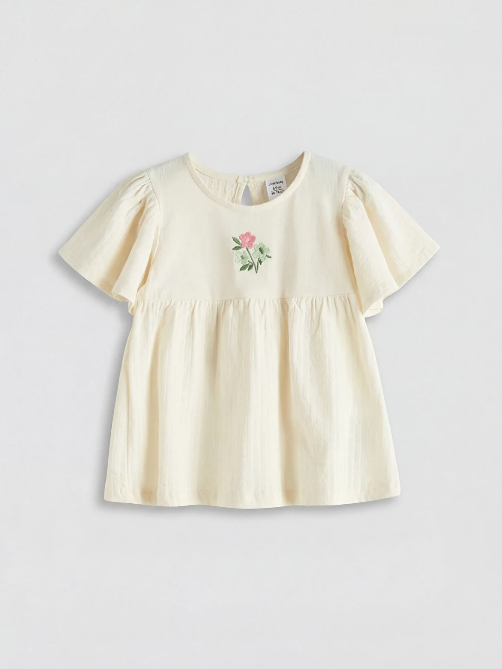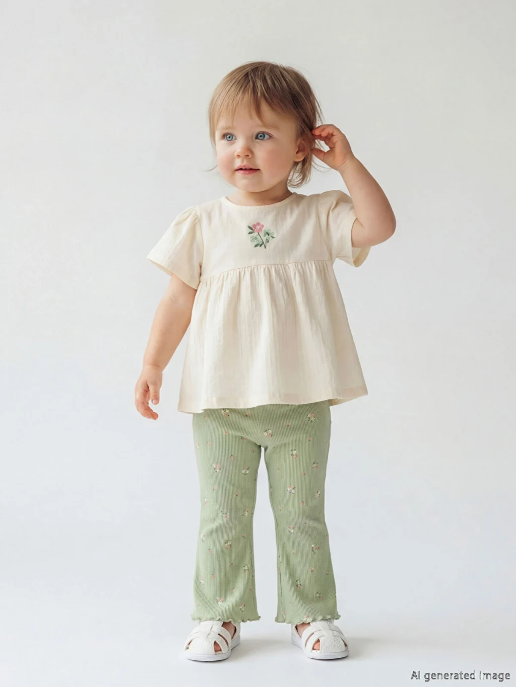 Kız bebek takım, bisiklet yaka, kısa volanlı kollu, nakış detaylı bluz ve desenli, İspanyol paça tayttan oluşur. Bluzun sırtı düğme kapamalıdır.