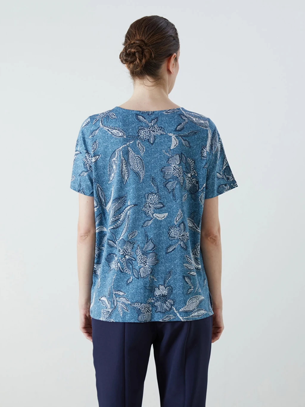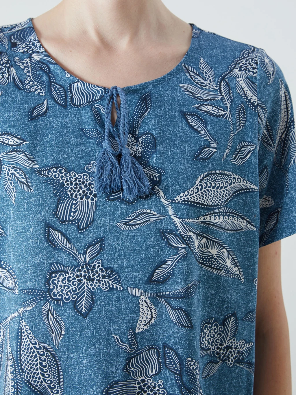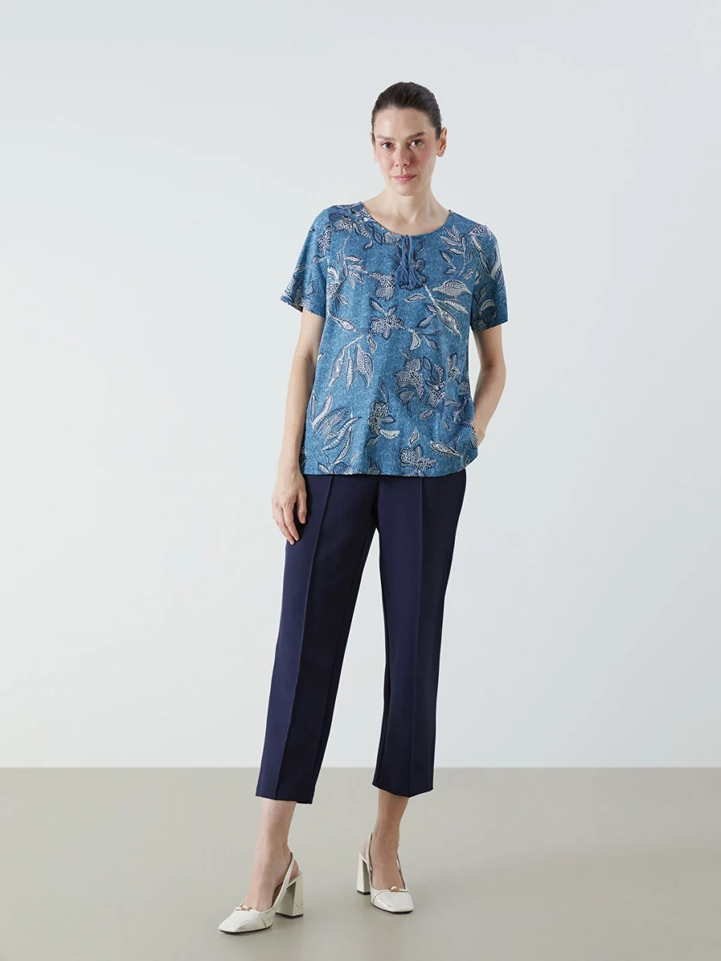 Bağlamalı yaka desenli kısa kollu kadın bluz, pamuklu kumaştan üretilmiştir. Yakası püsküllü ipli tasarıma sahiptir.