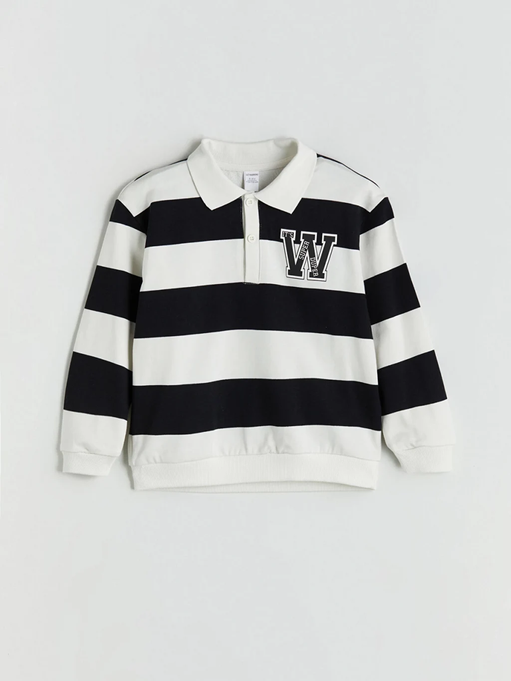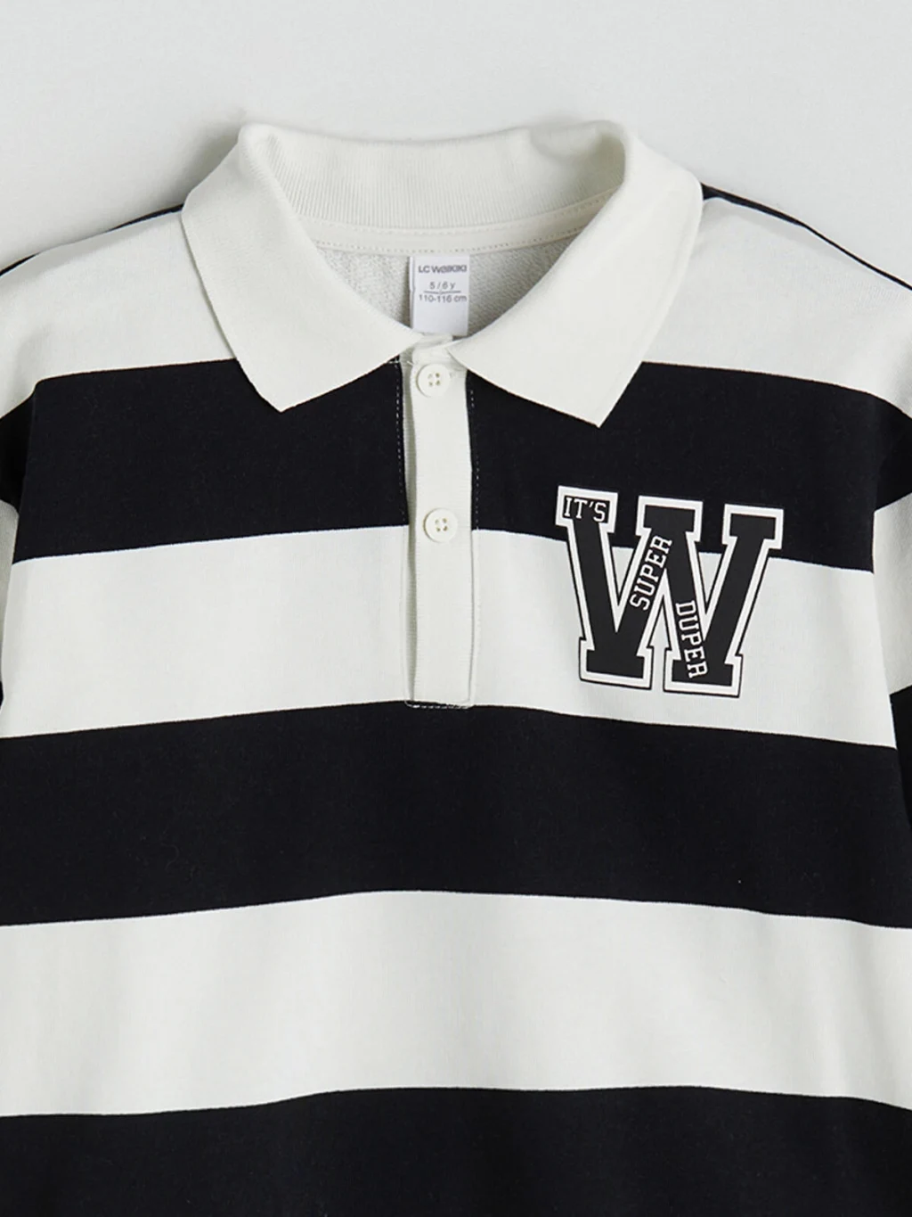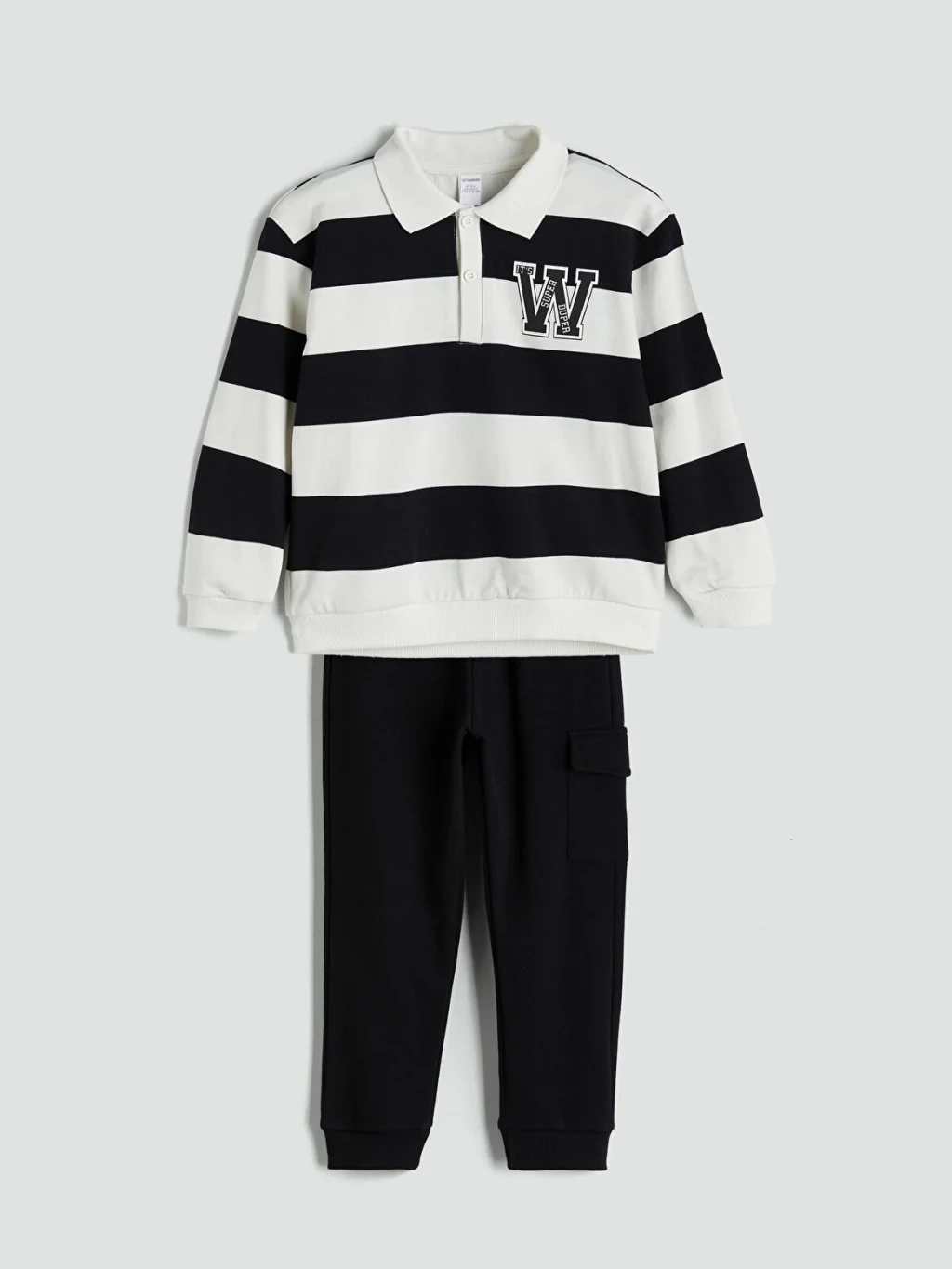 Erkek çocuk takım, polo yaka çizgili sweatshirt ve kargo eşofman altından oluşur. 3 İplik kumaştan üretilmiştir.