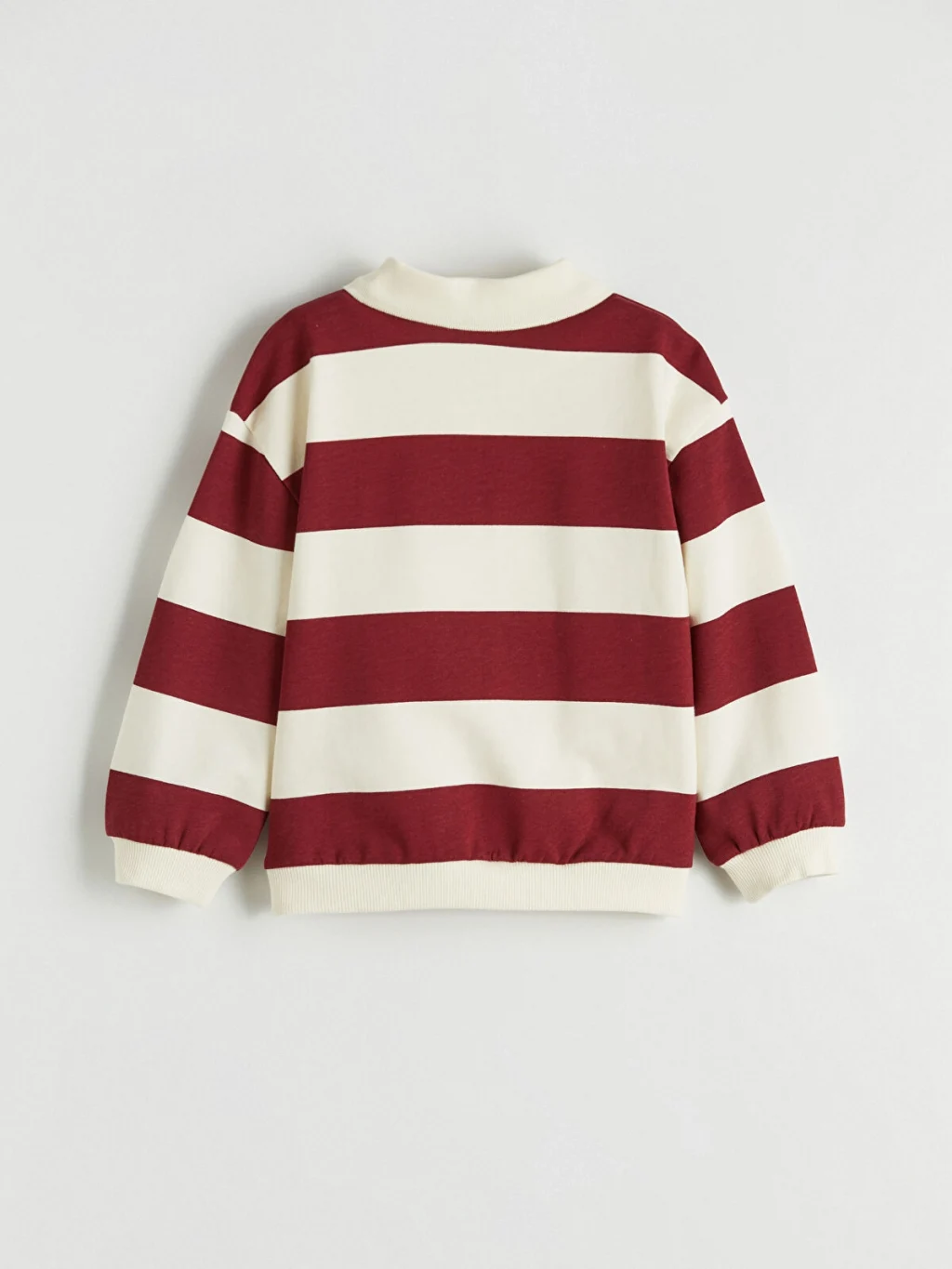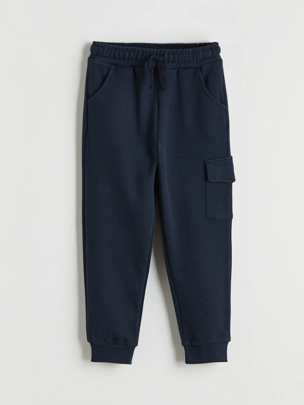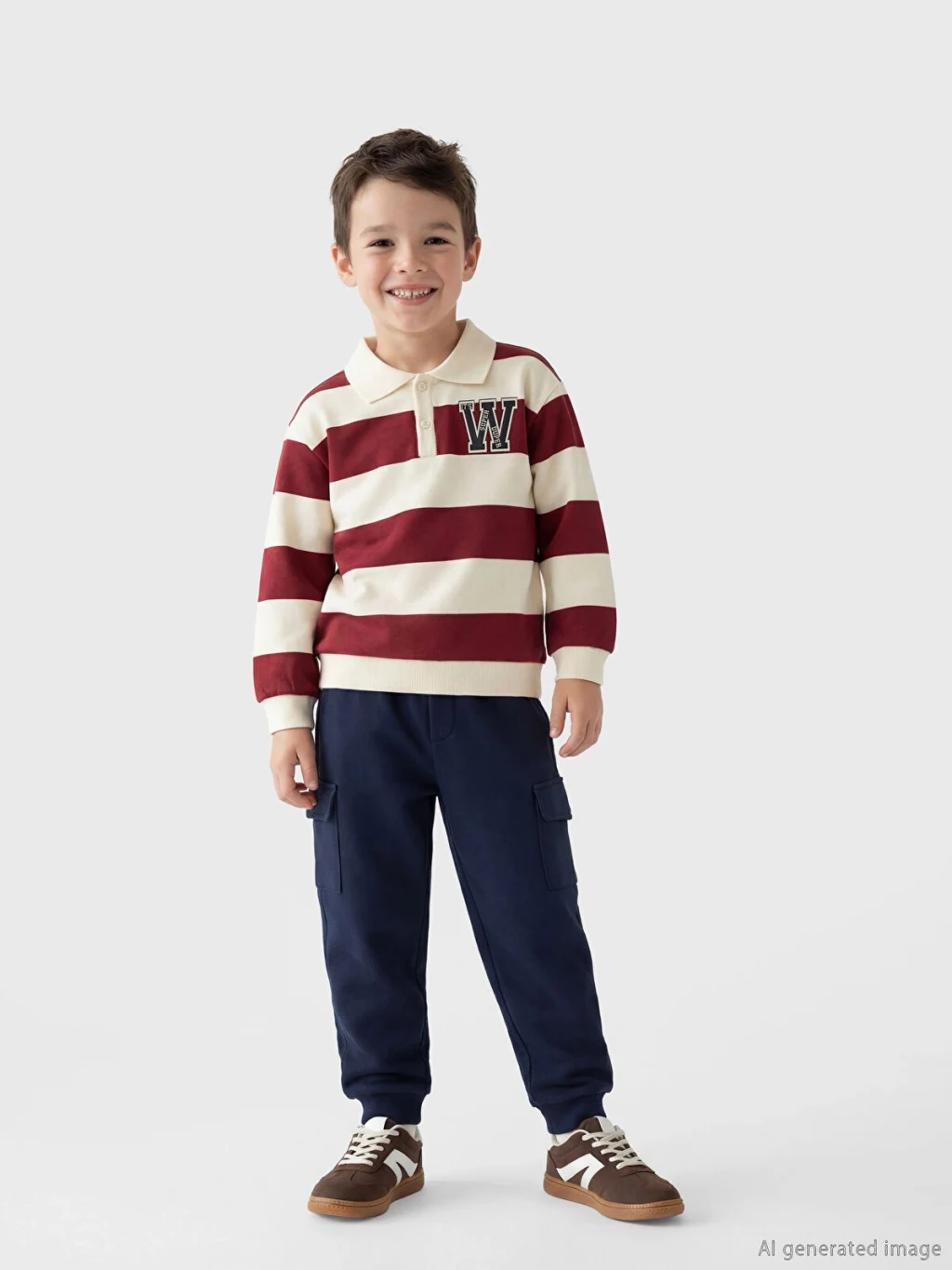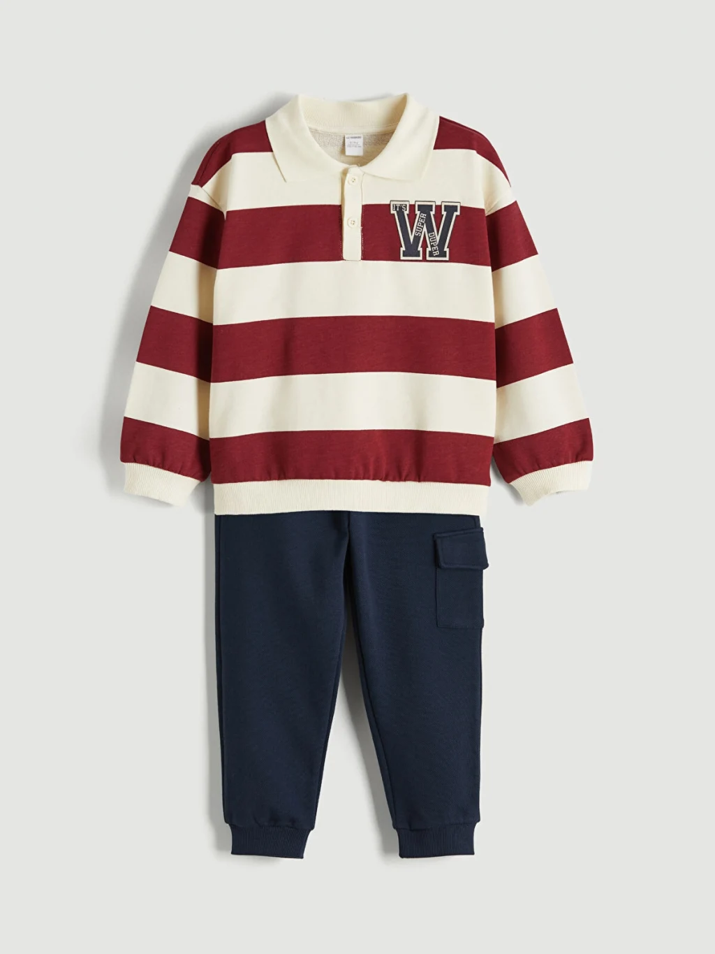 Erkek çocuk takım, polo yakalı, uzun kollu, düğme kapamalı sweatshirt ve beli lastikli, kargo cepli, paçaları lastikli eşofman alttan oluşur.