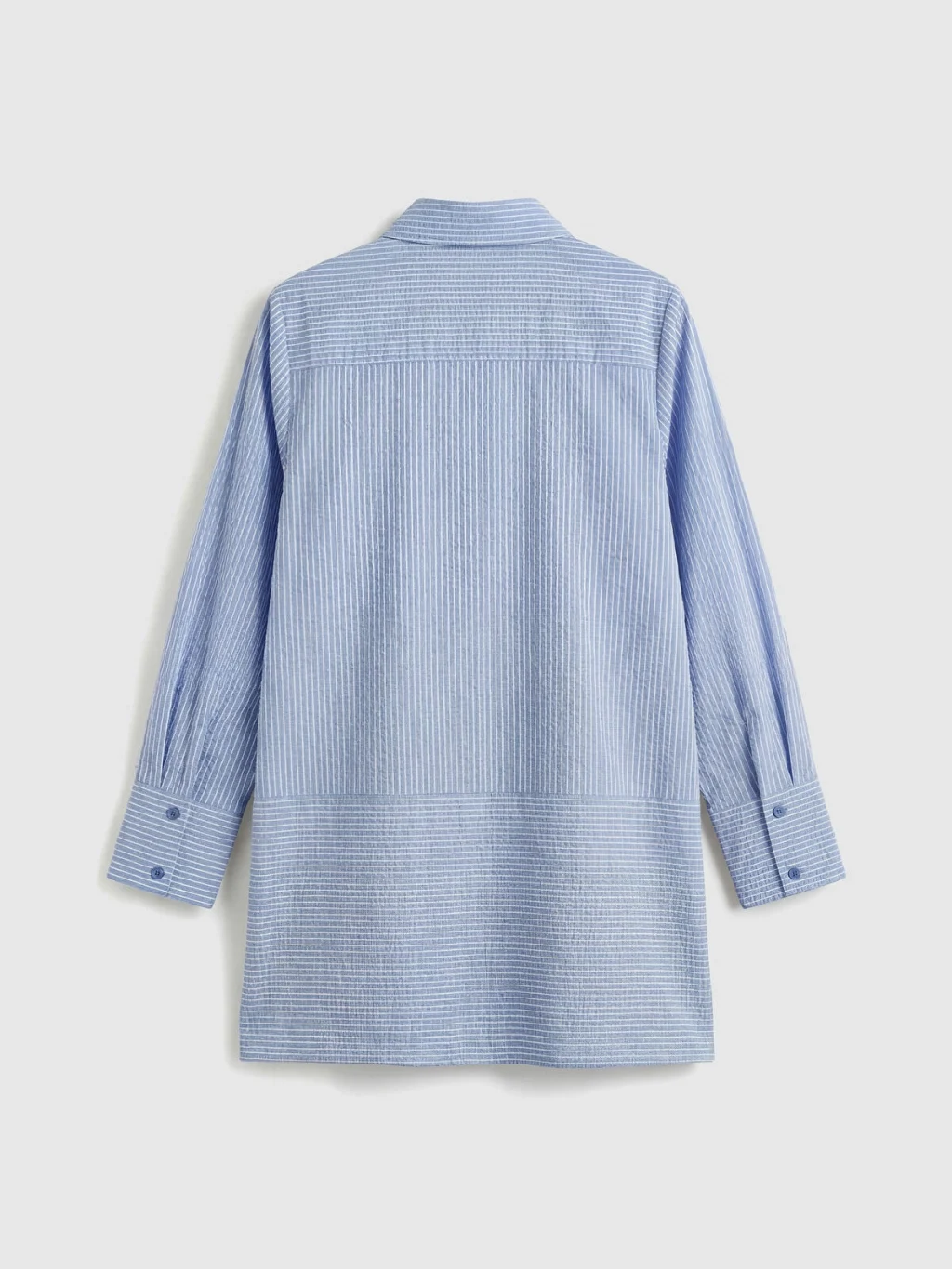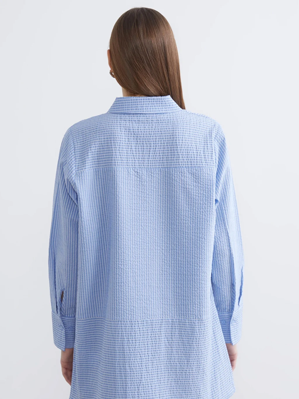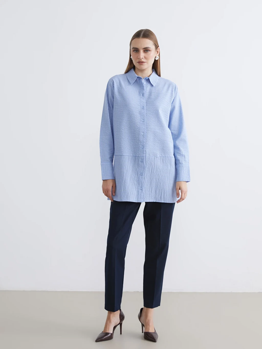 Gömlek yakalı ve uzun kollu kadın gömlek tunik, dokulu kumaştan üretilmiştir ve önden düğme kapamalıdır.