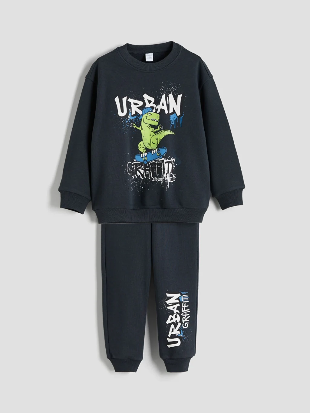 Erkek çocuk takım, bilekleri ve alt kısmı ribanalı tasarıma sahiptir. 3 iplik kumaştan üretilmiştir.
