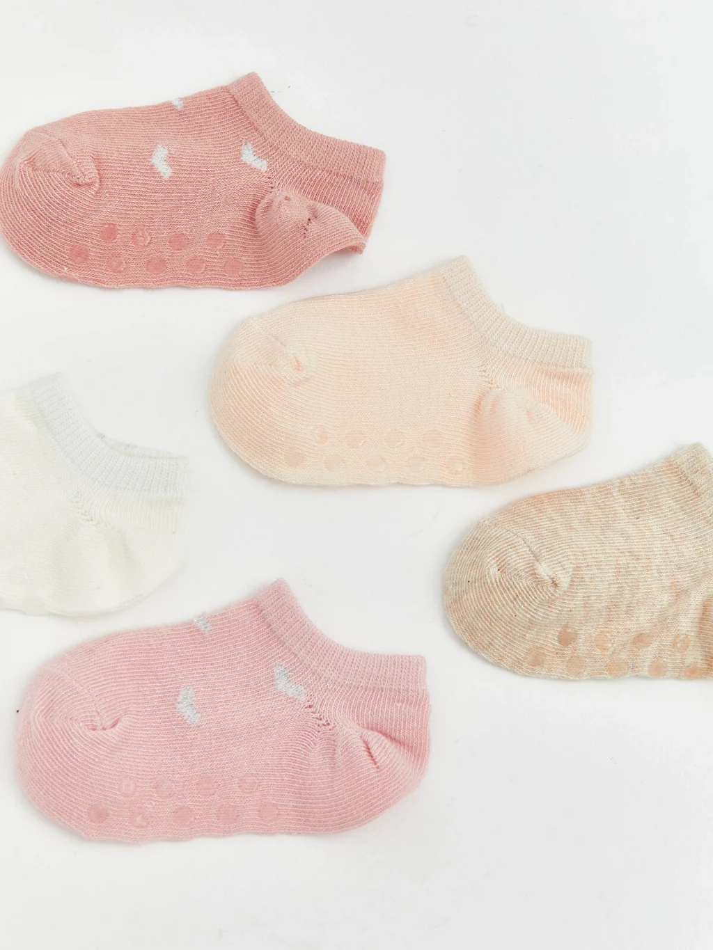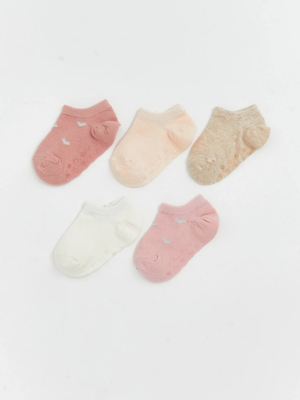 Kaydırmaz tabanlı kız bebek patik çorap seti beş çiftten oluşur, bazı çoraplar kalp desenlidir.
