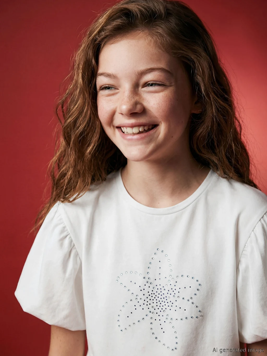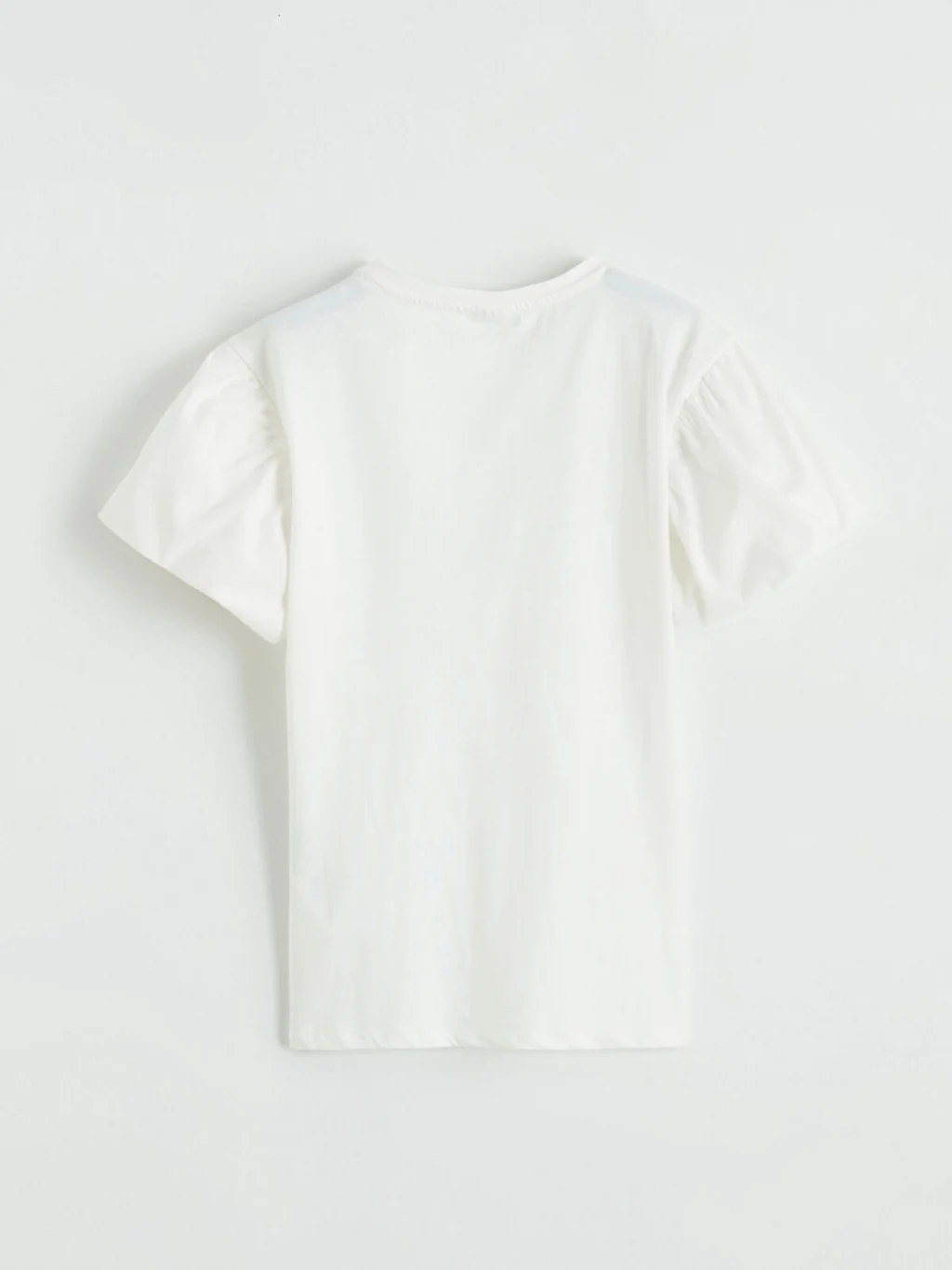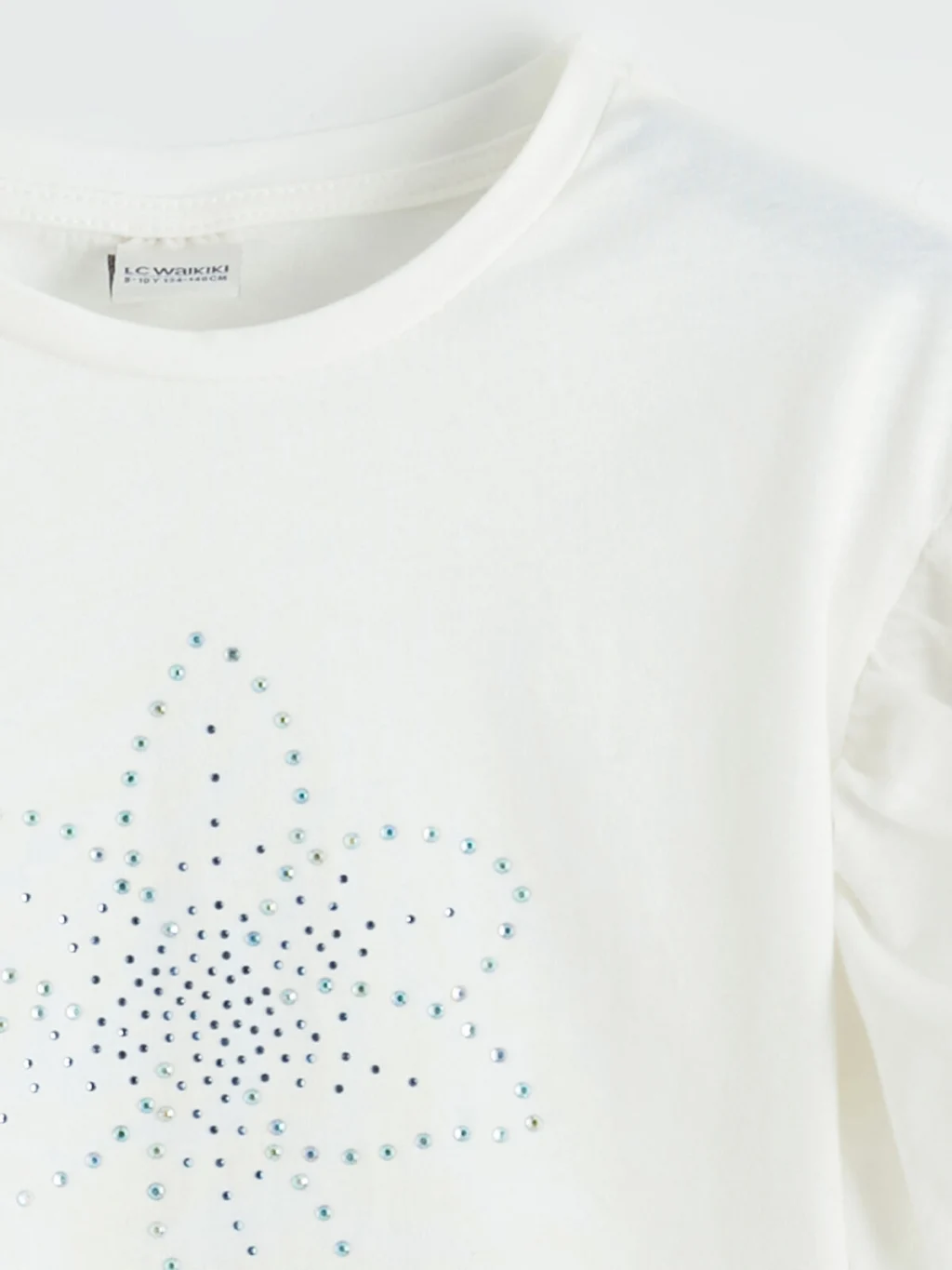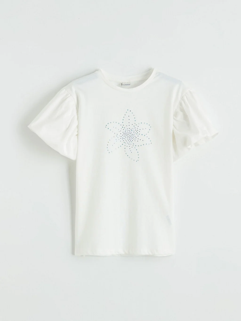 Kız çocuk tişört, %100 pamuk penye kumaştan üretilmiştir. Bisiklet yakalı, kısa volanlı kollu ve önü taş işlemeli çiçek desenlidir.