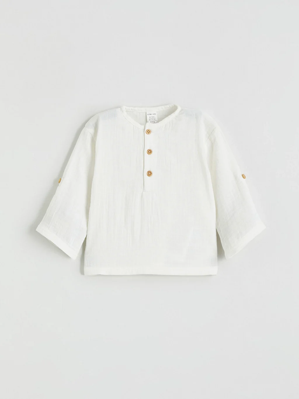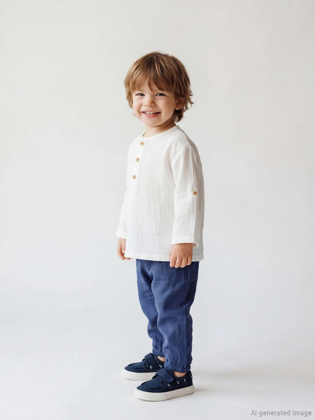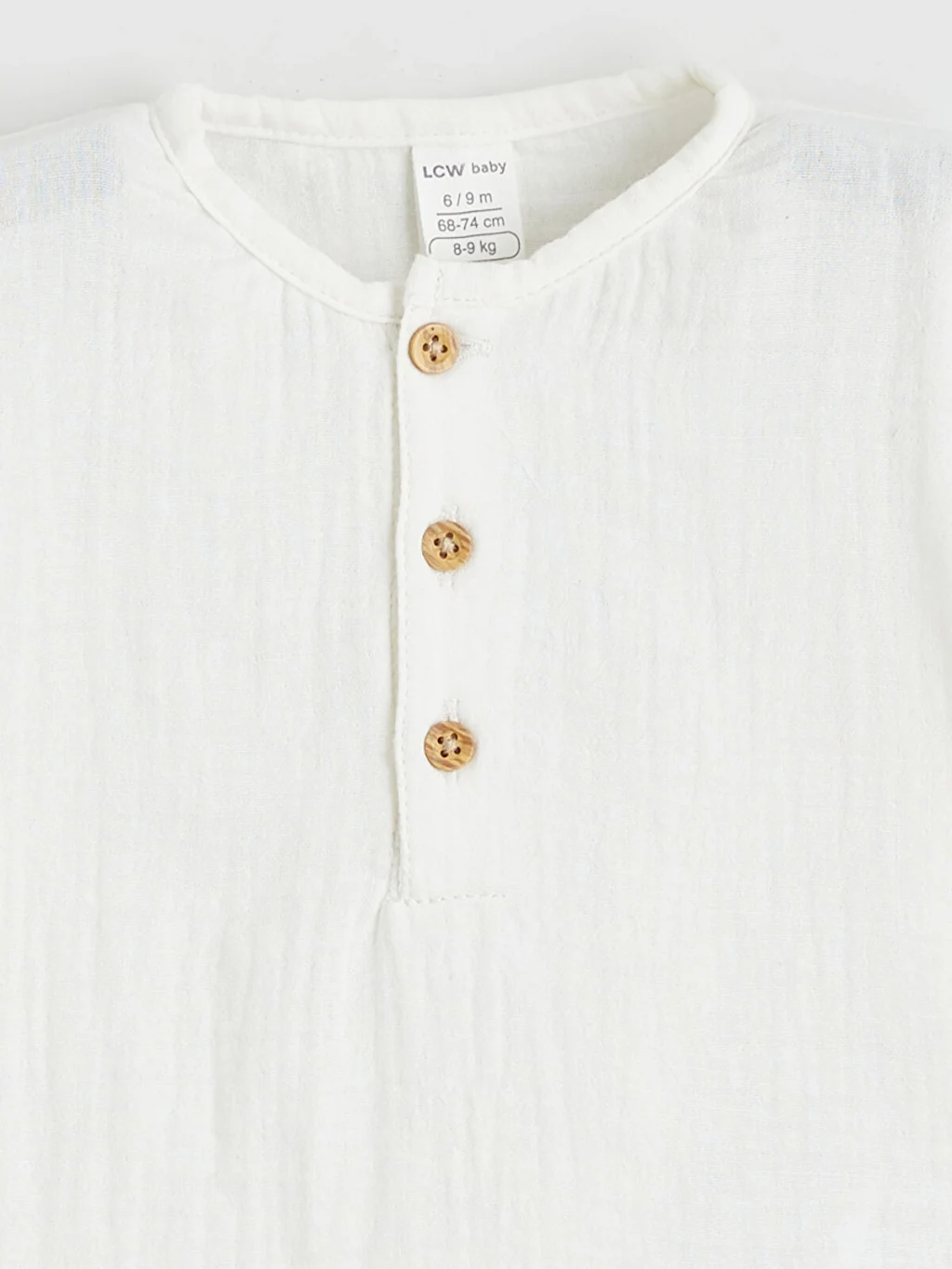 %100 pamuklu müslin kumaştan üretilen erkek bebek takım, hakim yaka, uzun kollu, düğme kapamalı gömlek ve paçası lastikli pantolondan oluşur.