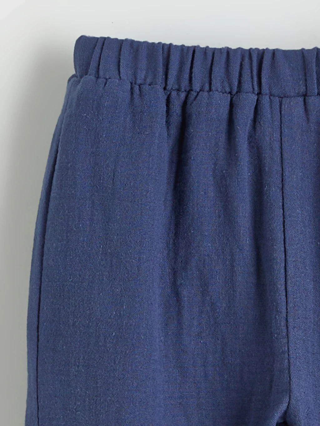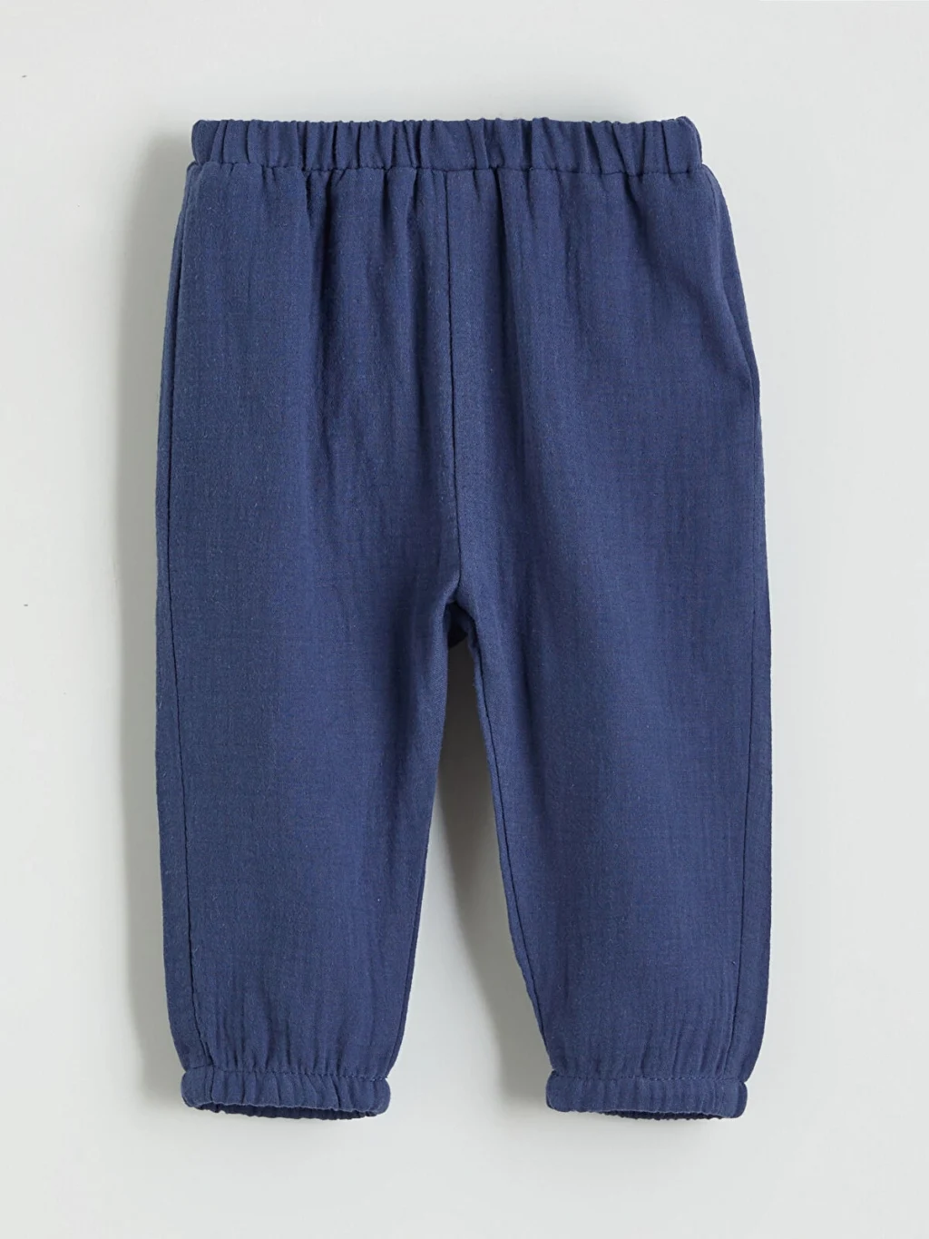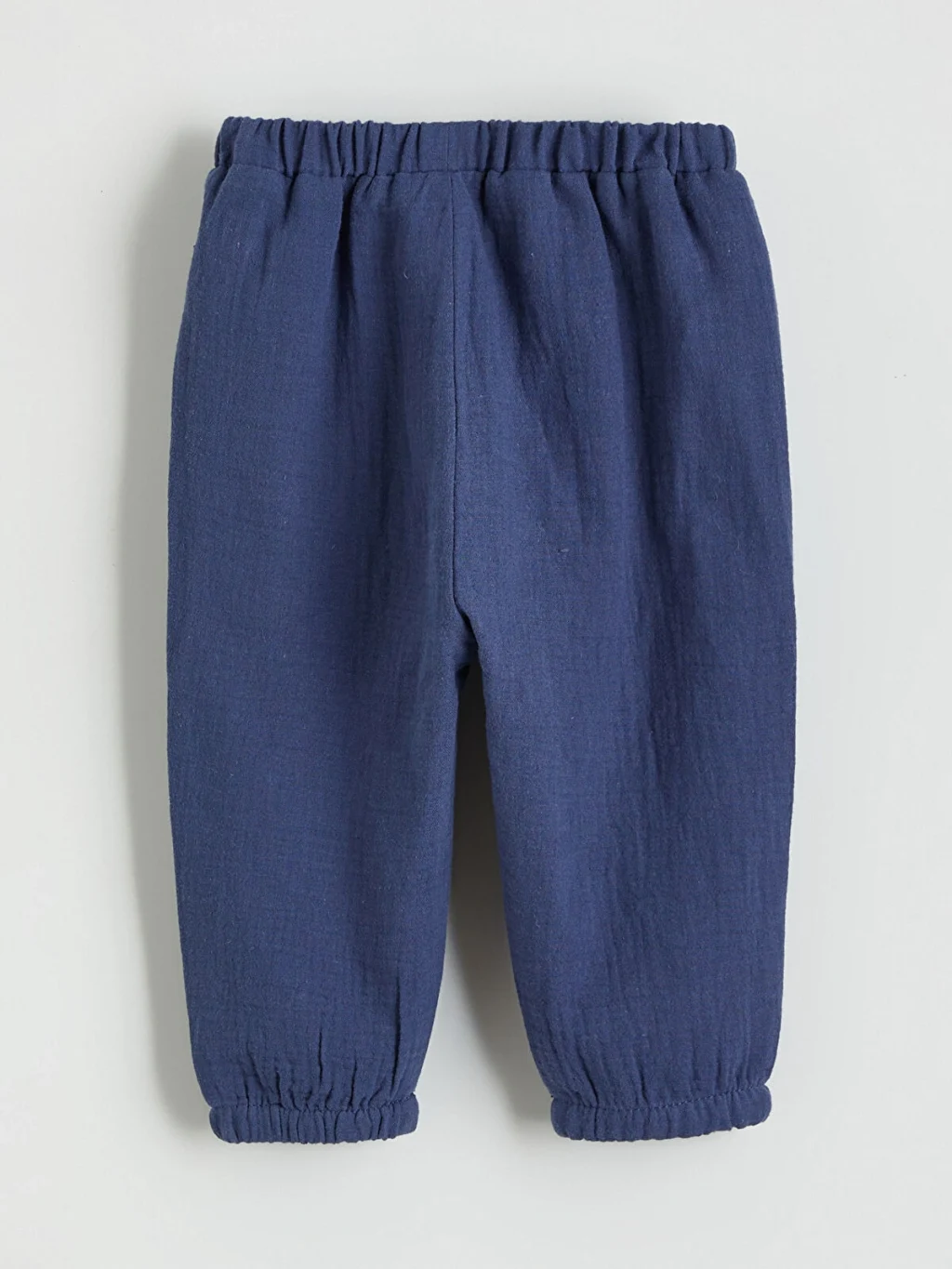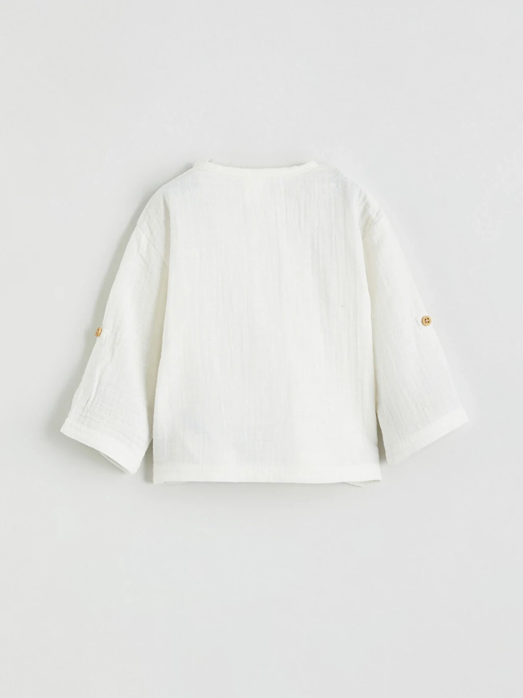 %100 pamuklu müslin kumaştan üretilen erkek bebek takım, hakim yaka, uzun kollu, düğme kapamalı gömlek ve paçası lastikli pantolondan oluşur.