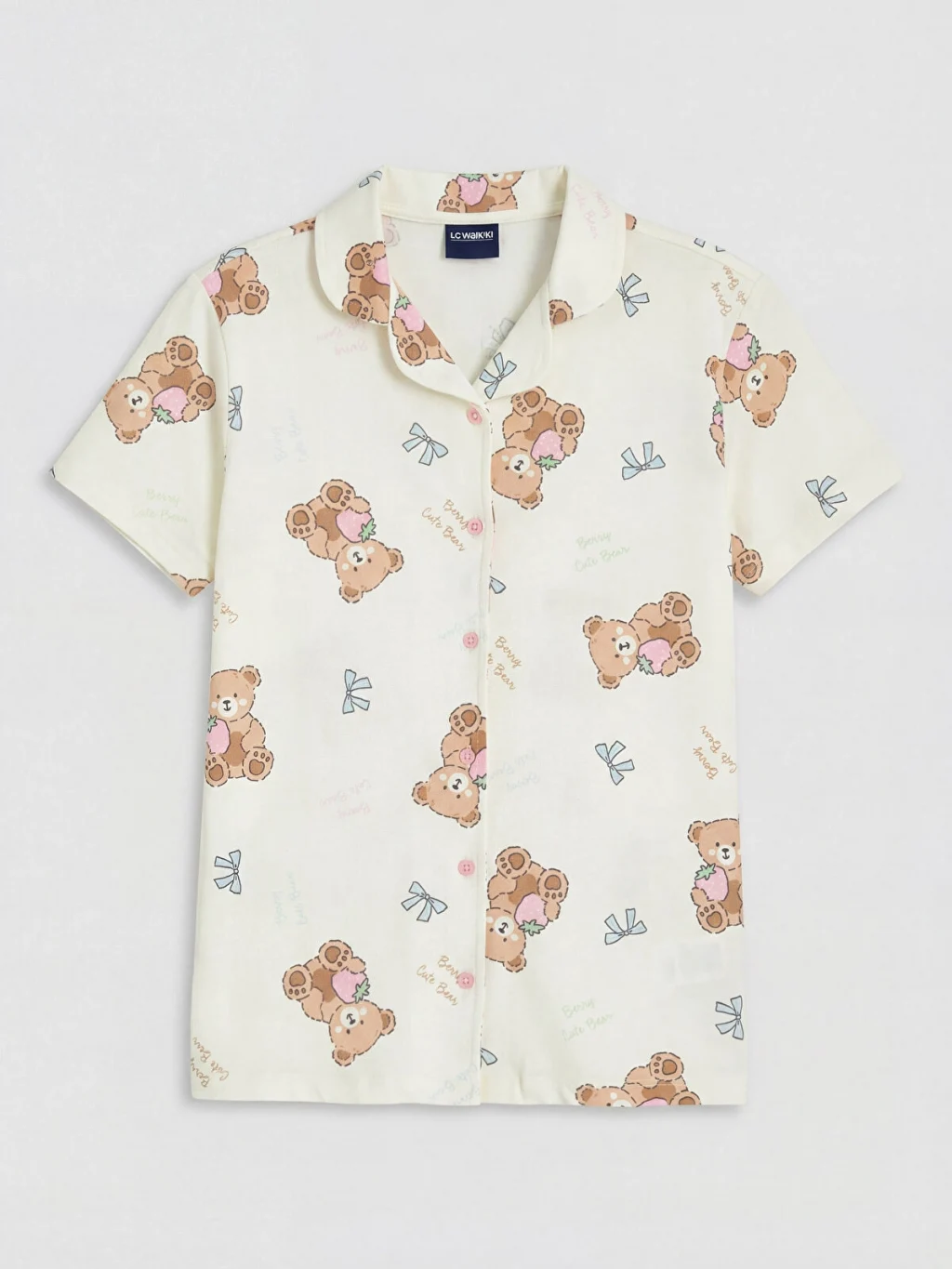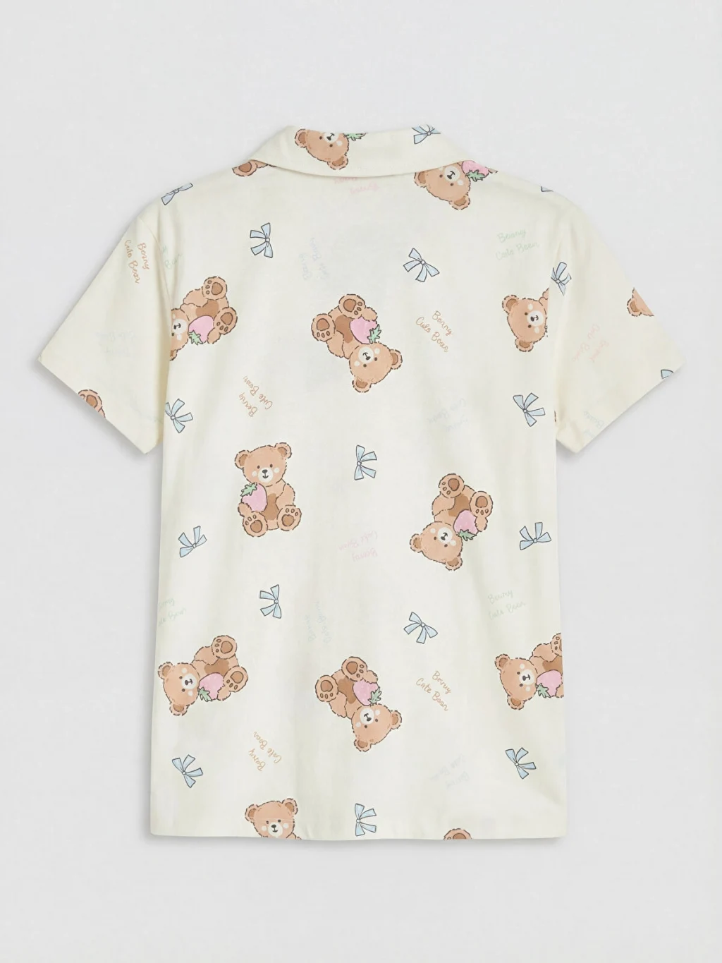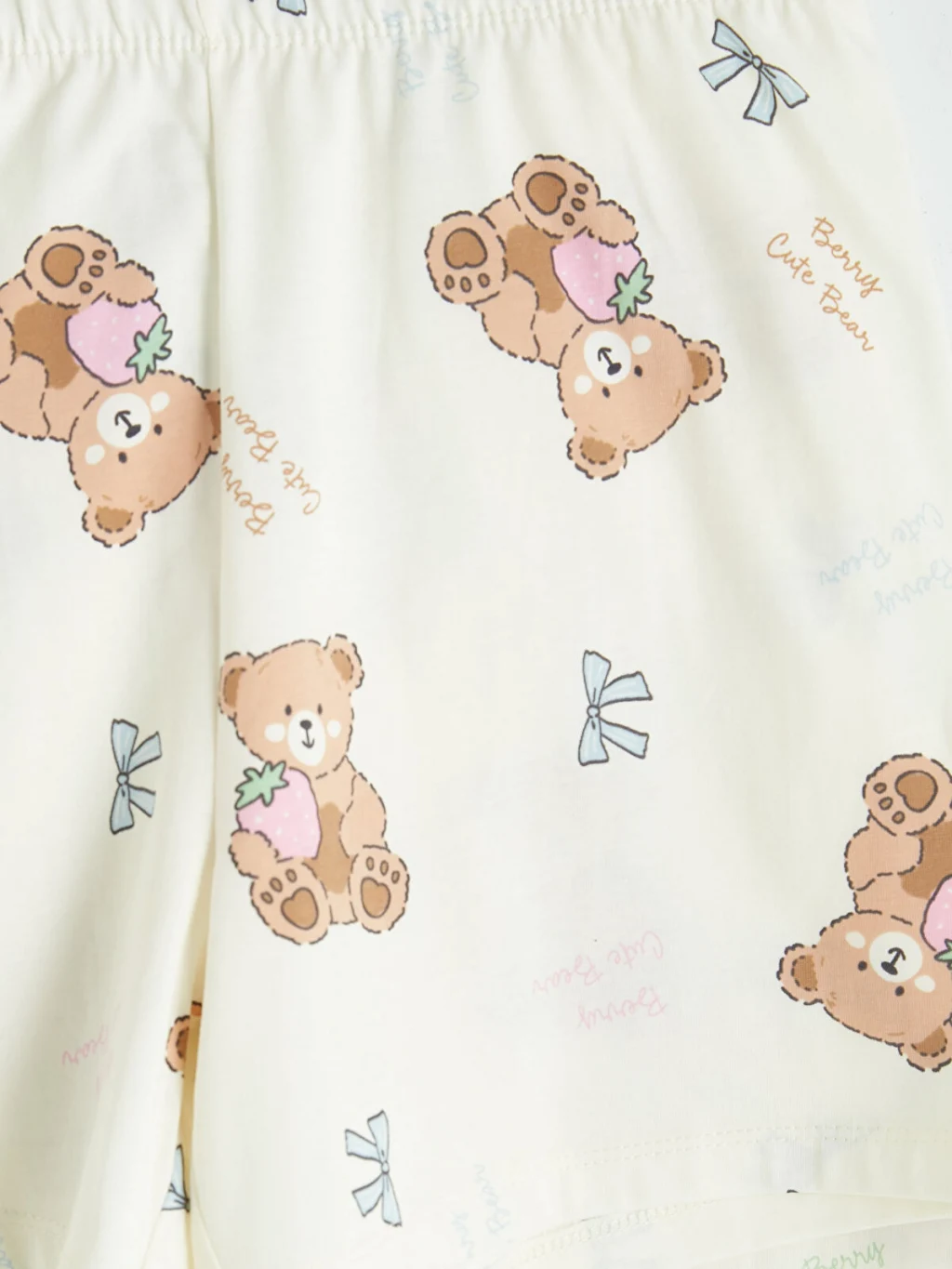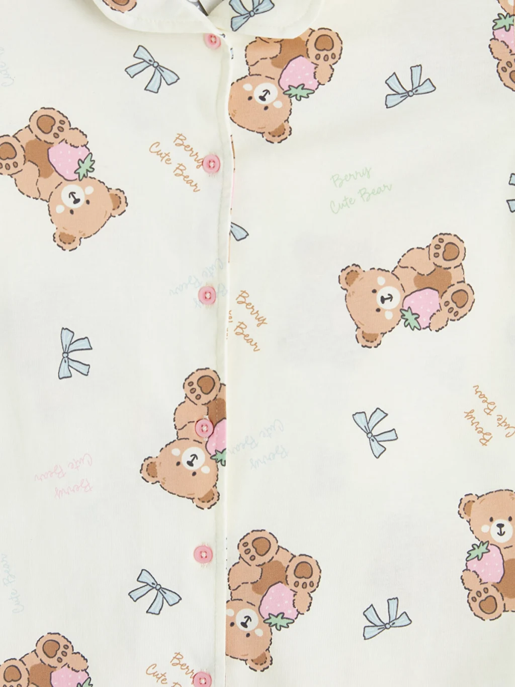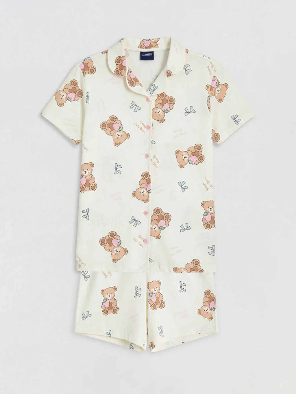 Gömlek yakalı ve kısa kollu, düğme kapamalı desenli üst ile desenli şorttan oluşan kız çocuk pijama takımı, %100 Pamuk kumaştan üretilmiştir.
