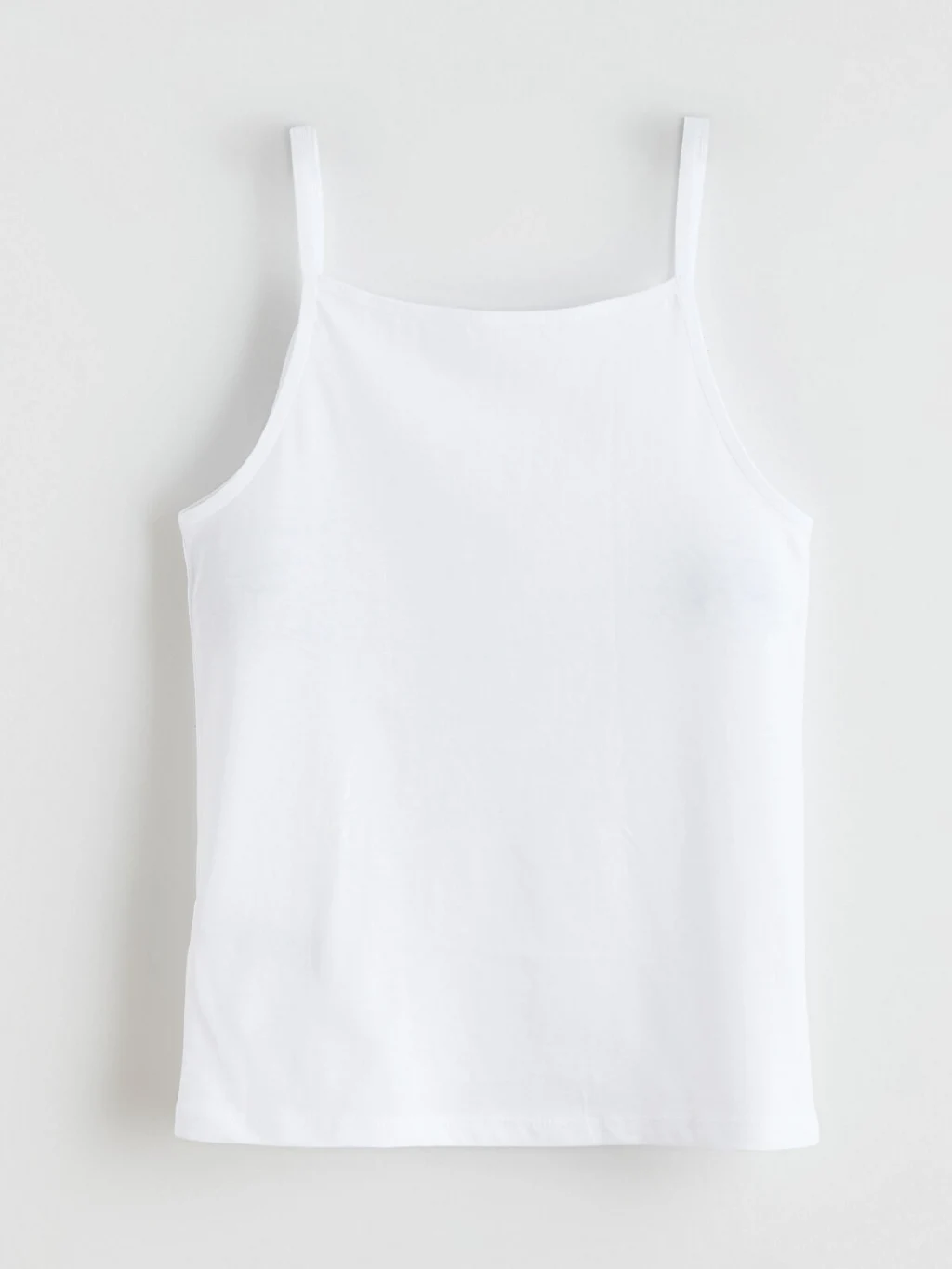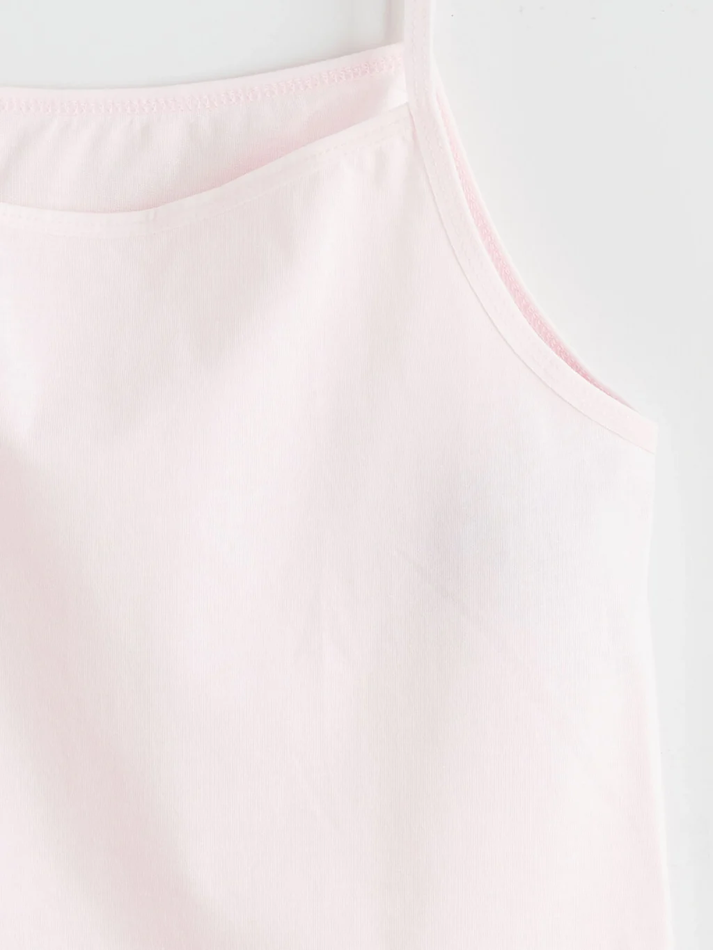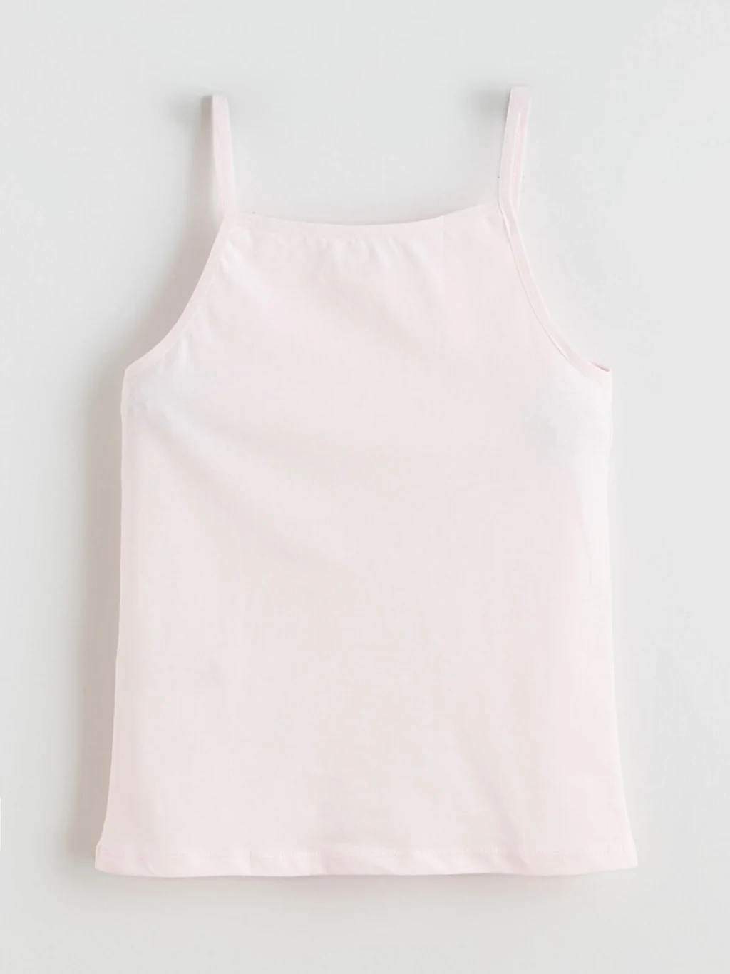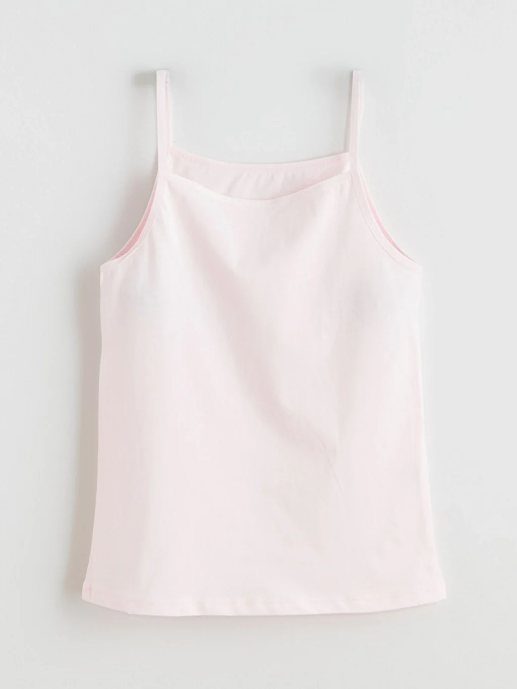 Kare yakalı ve ince askılı kız çocuk iç giyim atlet, %100 pamuklu penye kumaştan üretilmiştir.