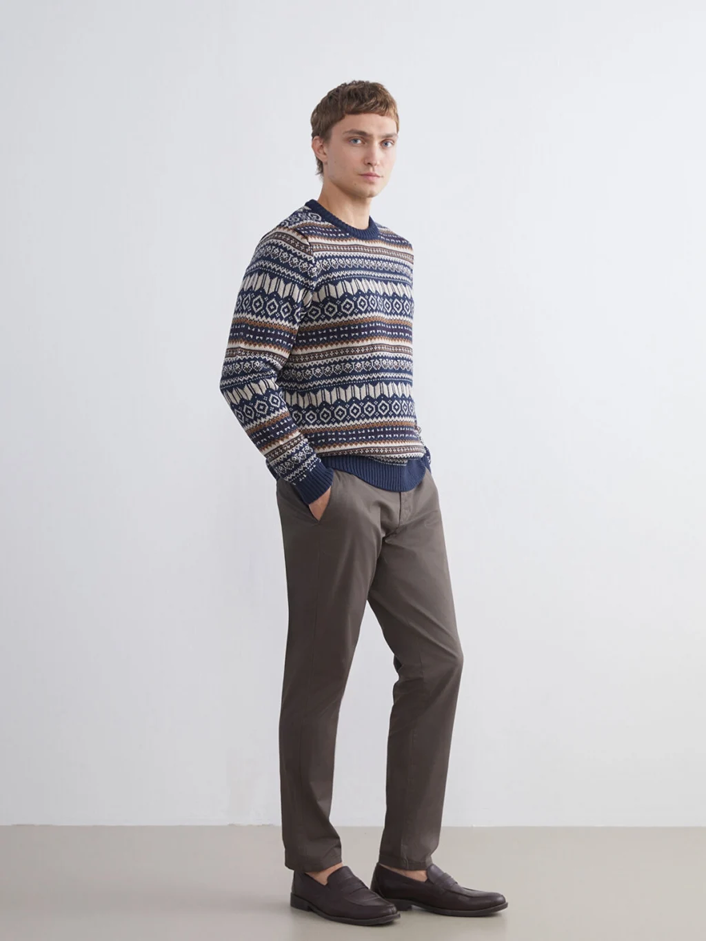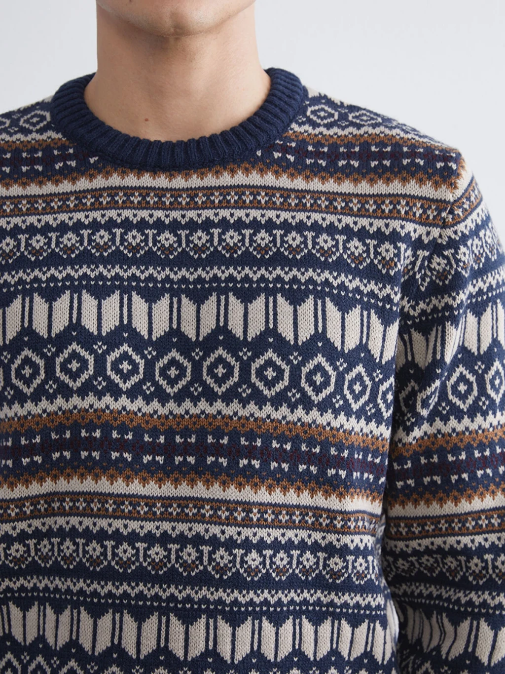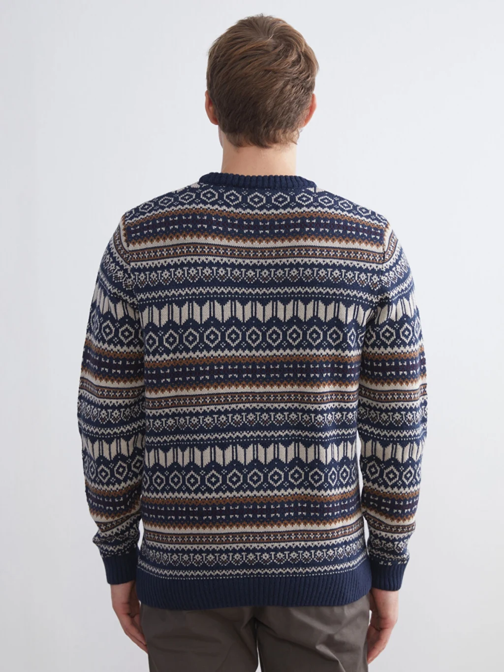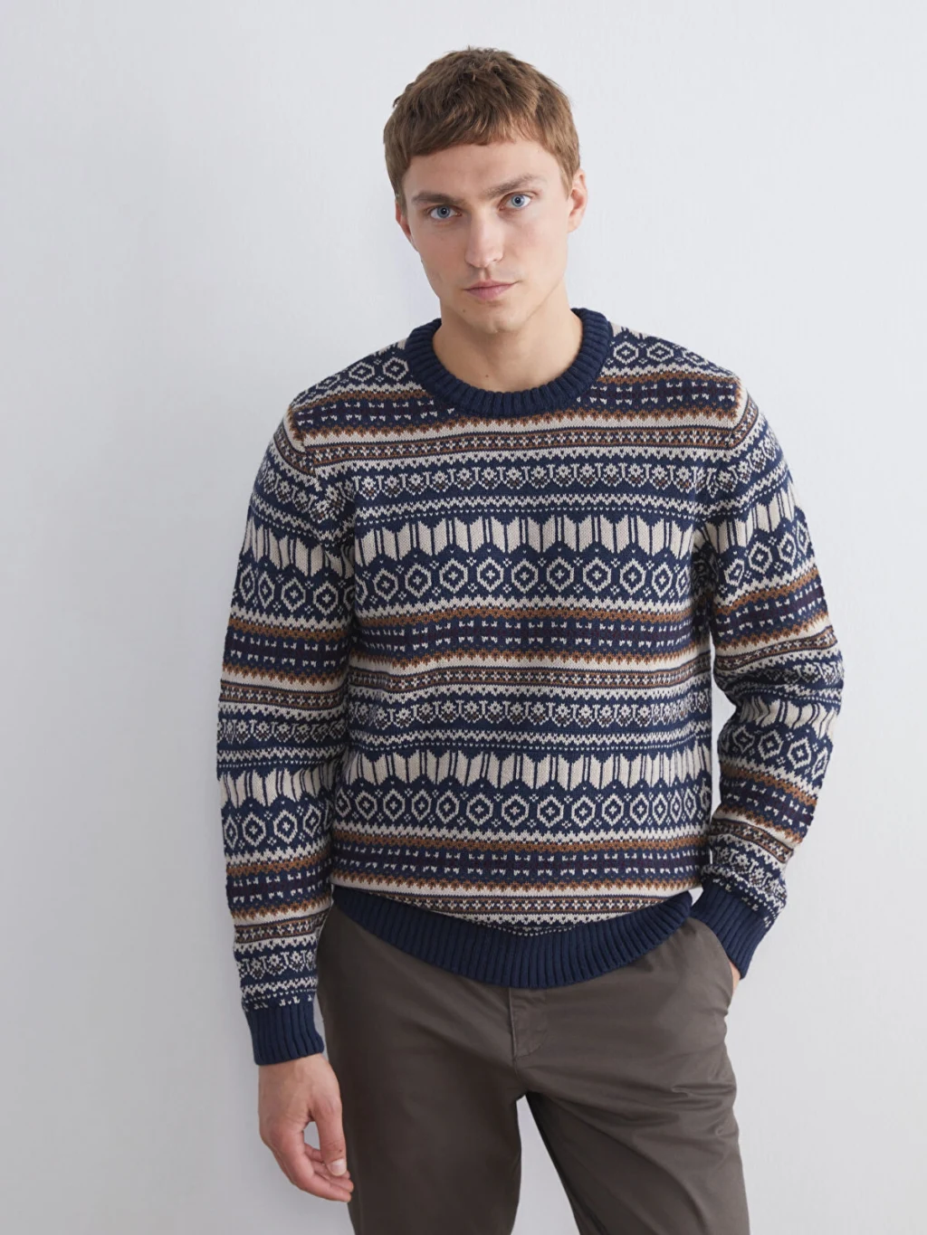 Bisiklet yaka, uzun kollu ve geometrik desenli erkek kazak, orta kalınlıkta triko kumaştan üretilmiştir; yaka, kol ucu ve etek ucu ribanalıdır.