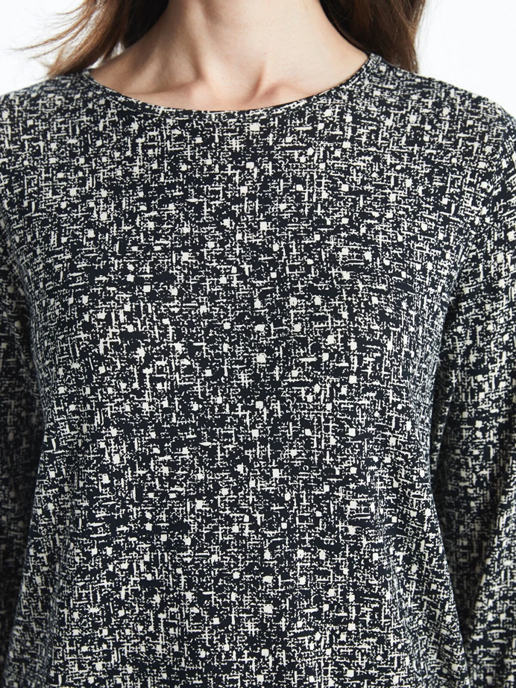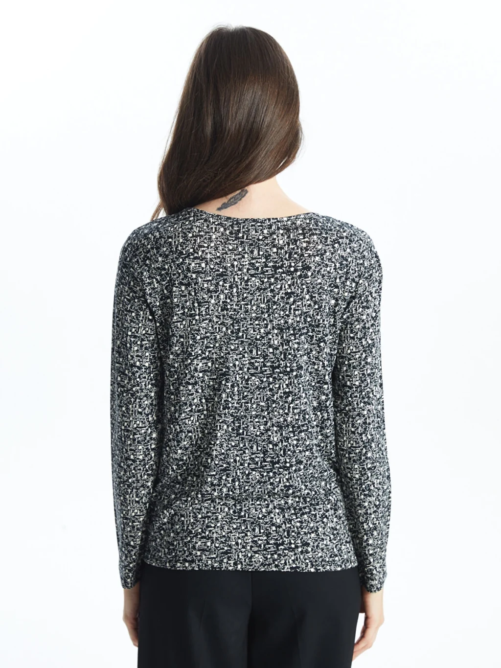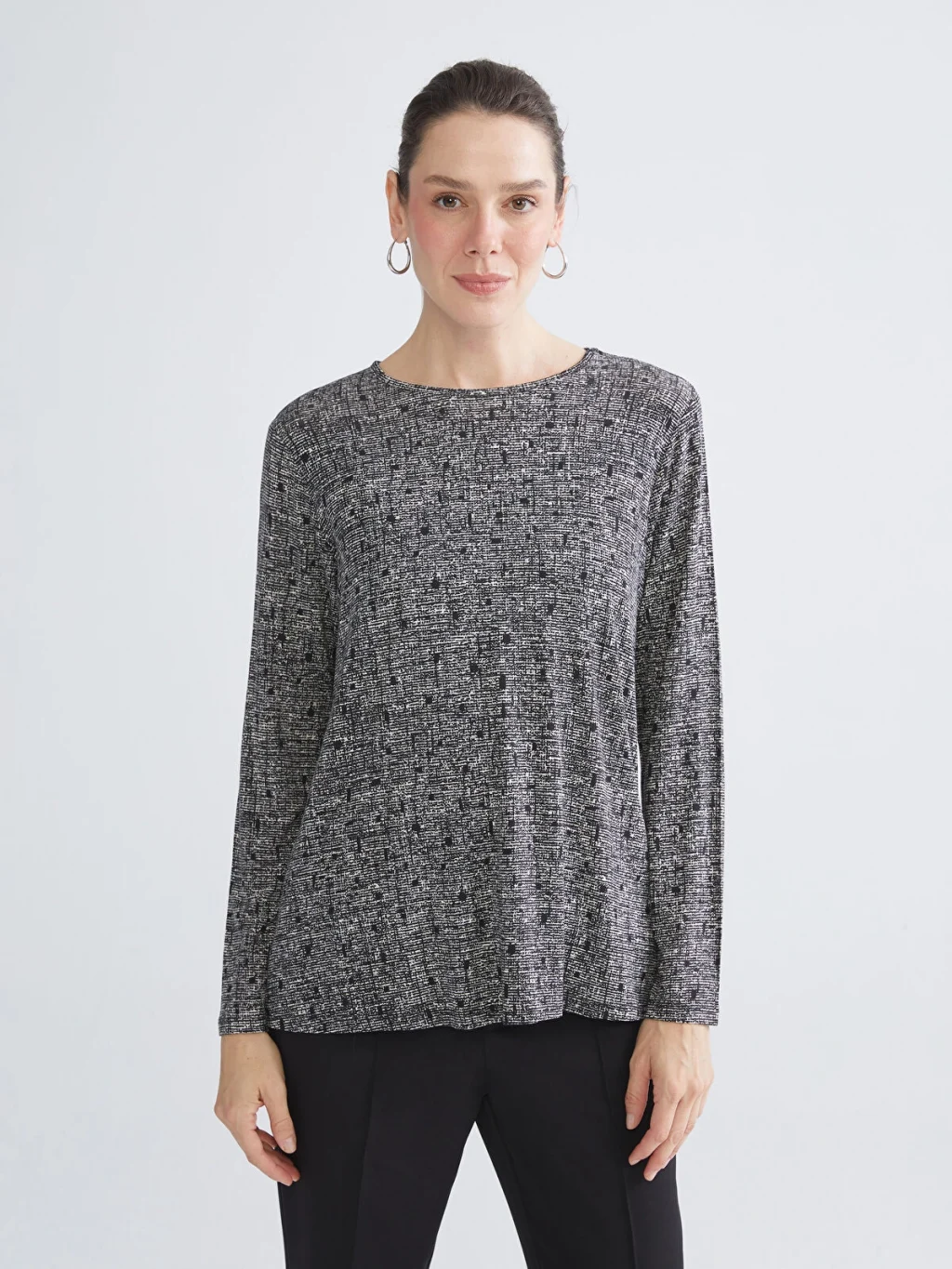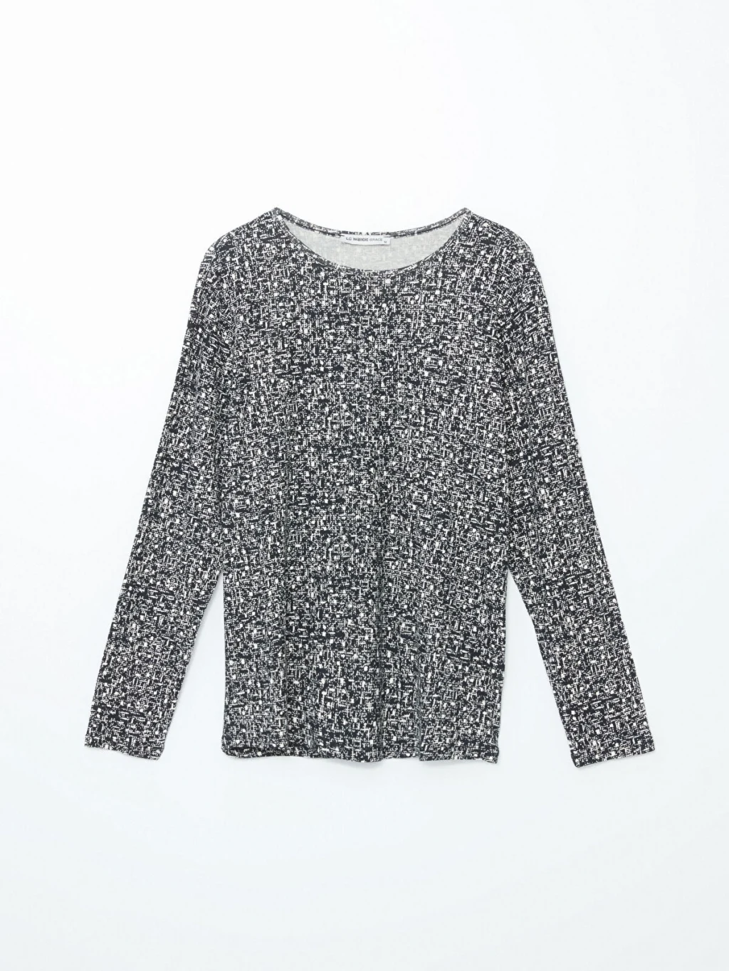 Penye kumaştan üretilen, bisiklet yakalı ve uzun kollu kadın bluz, tamamı desenli bir tasarıma sahiptir.