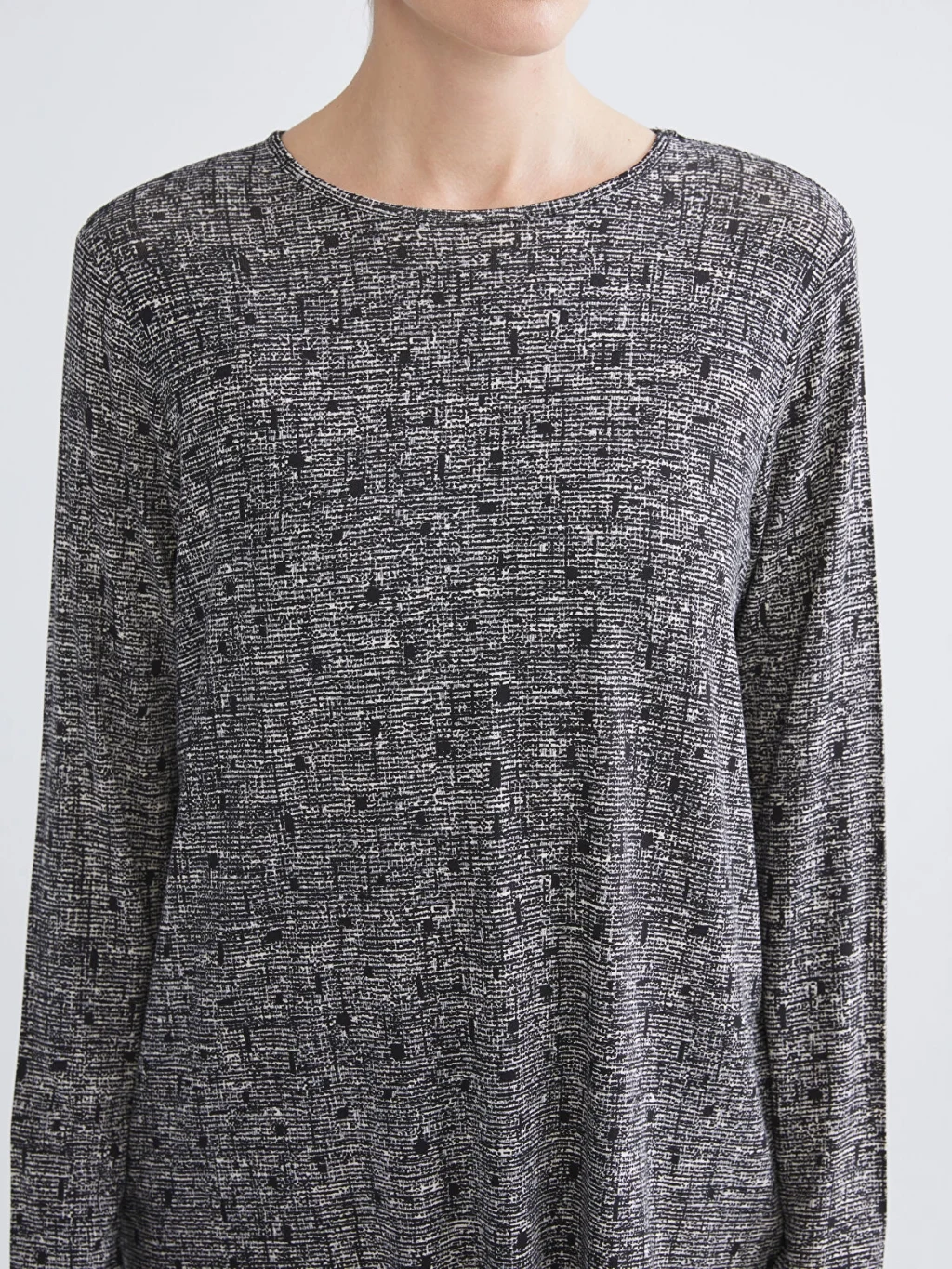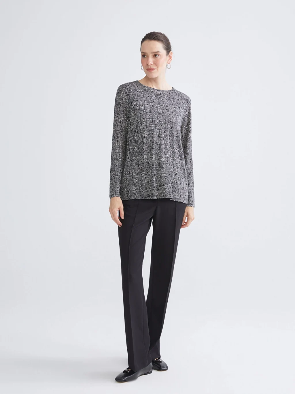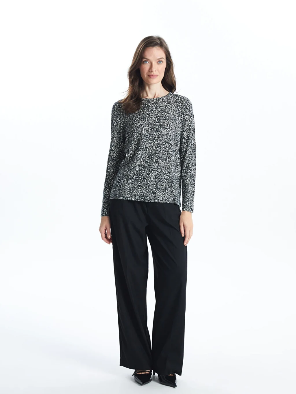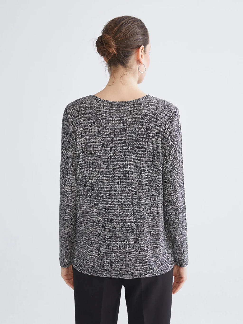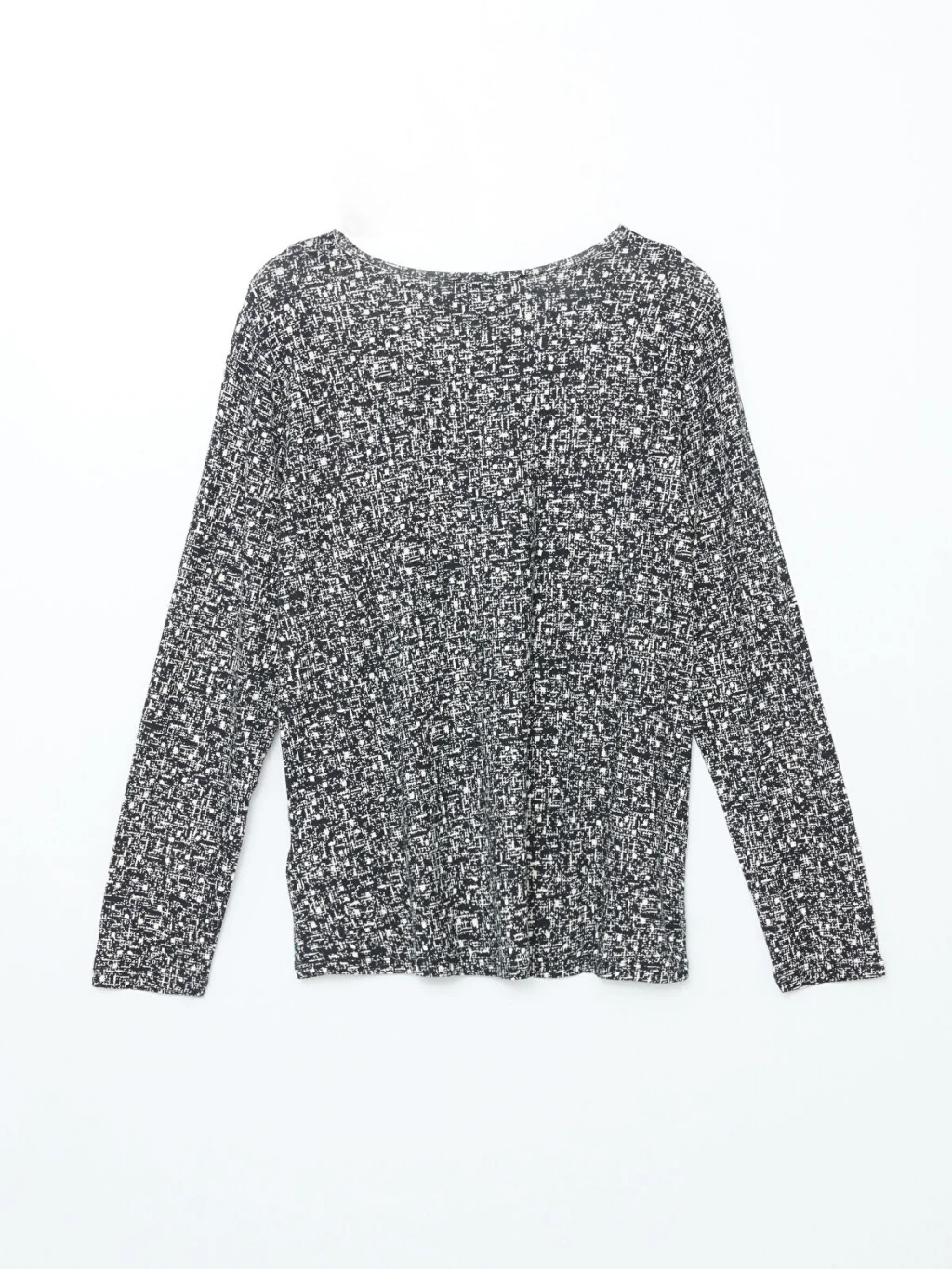 Penye kumaştan üretilen, bisiklet yakalı ve uzun kollu kadın bluz, tamamı desenli bir tasarıma sahiptir.