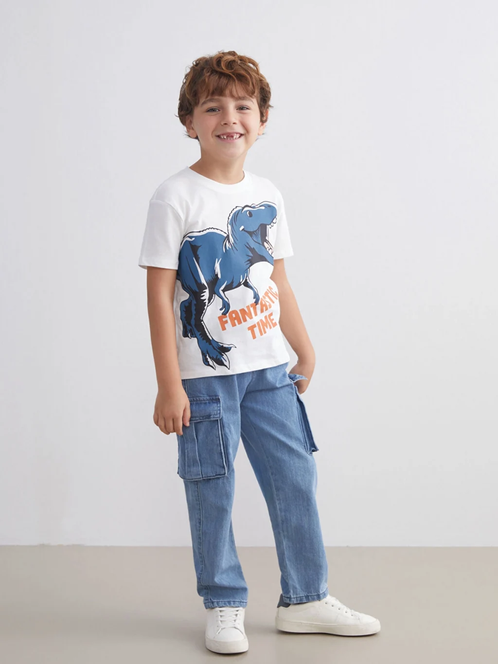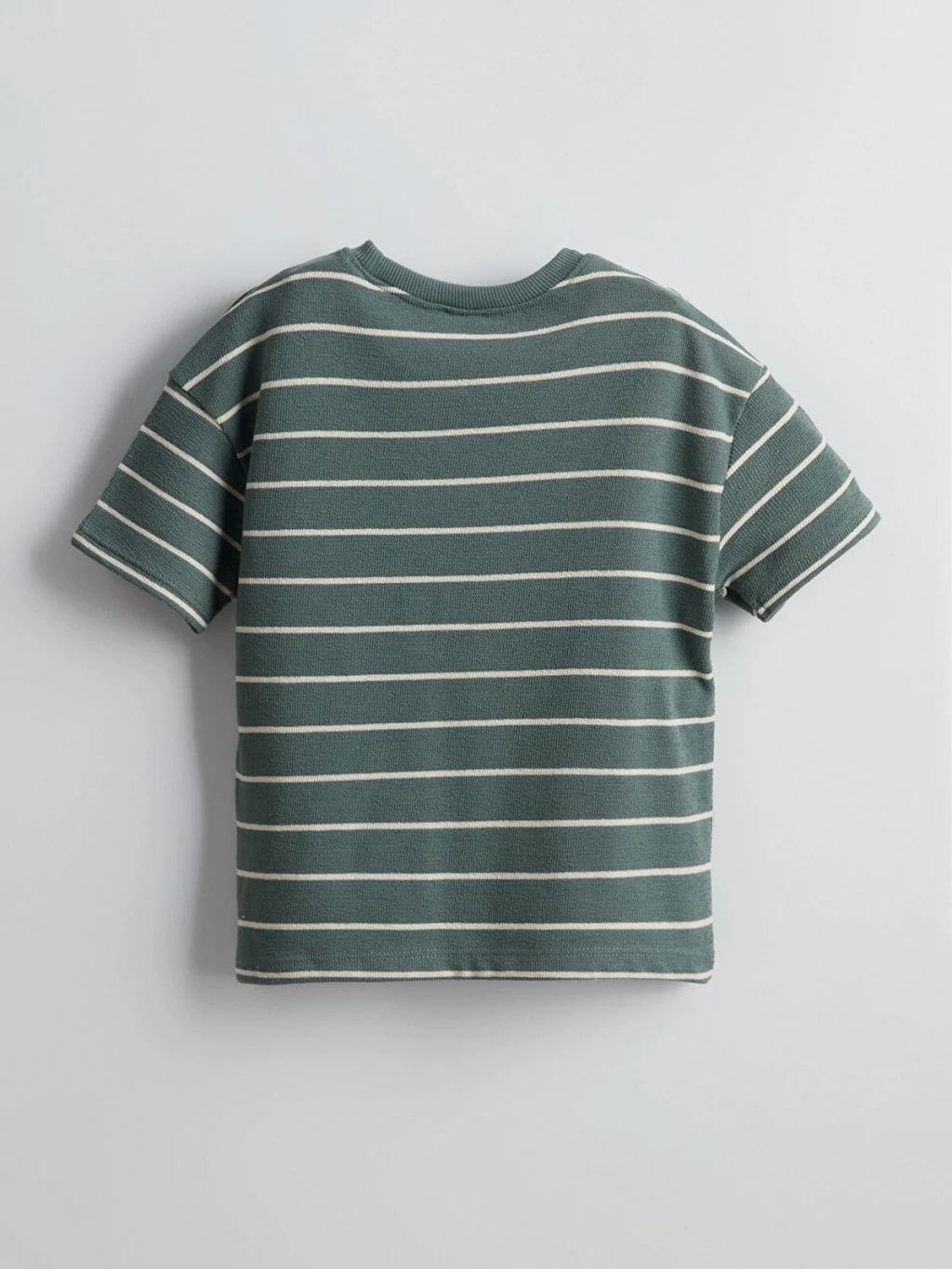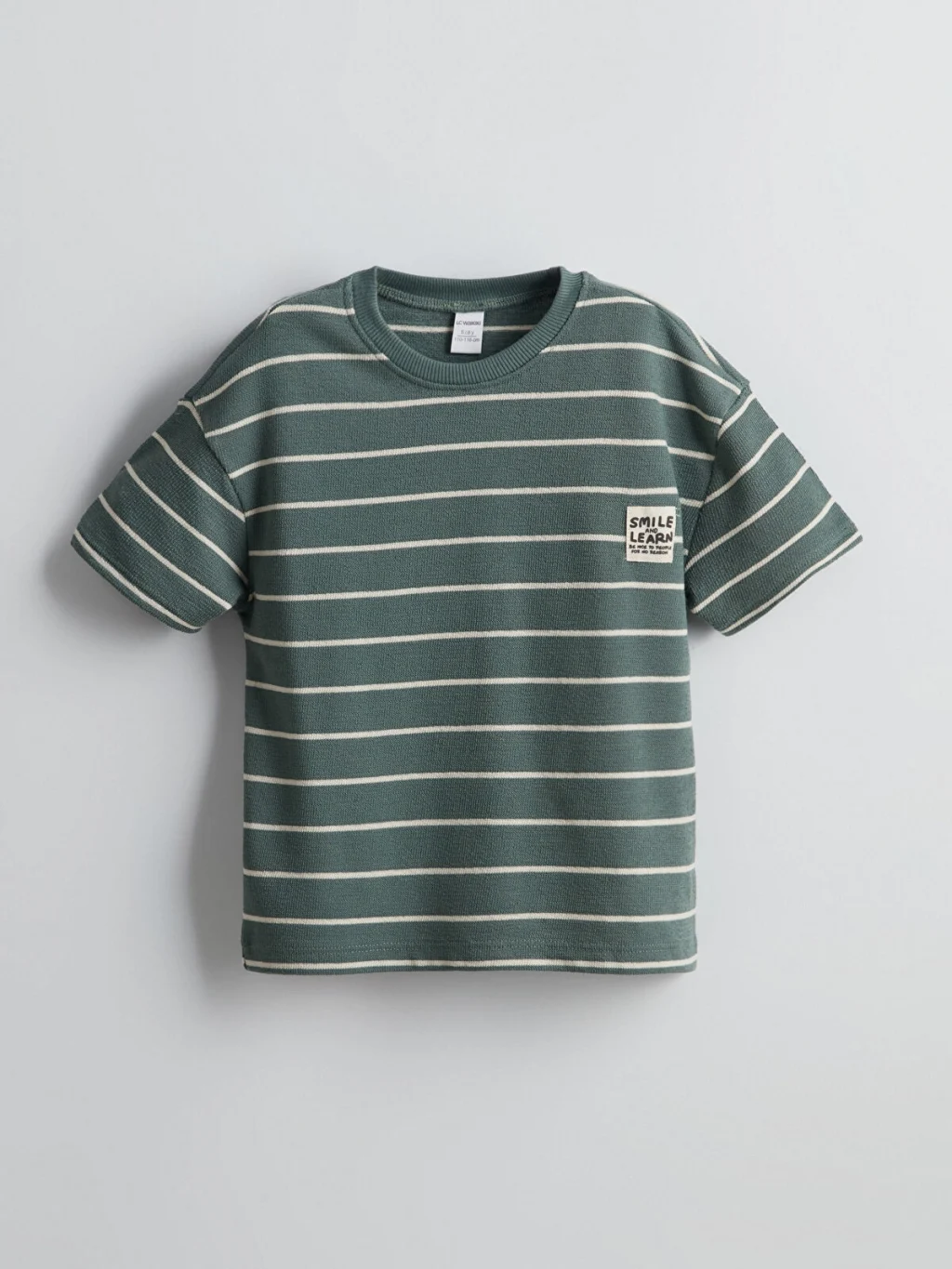 Standart kalıp, bisiklet yaka ve kısa kollu erkek çocuk tişört, çizgili desene ve göğüs kısmında etiket detayına sahiptir.