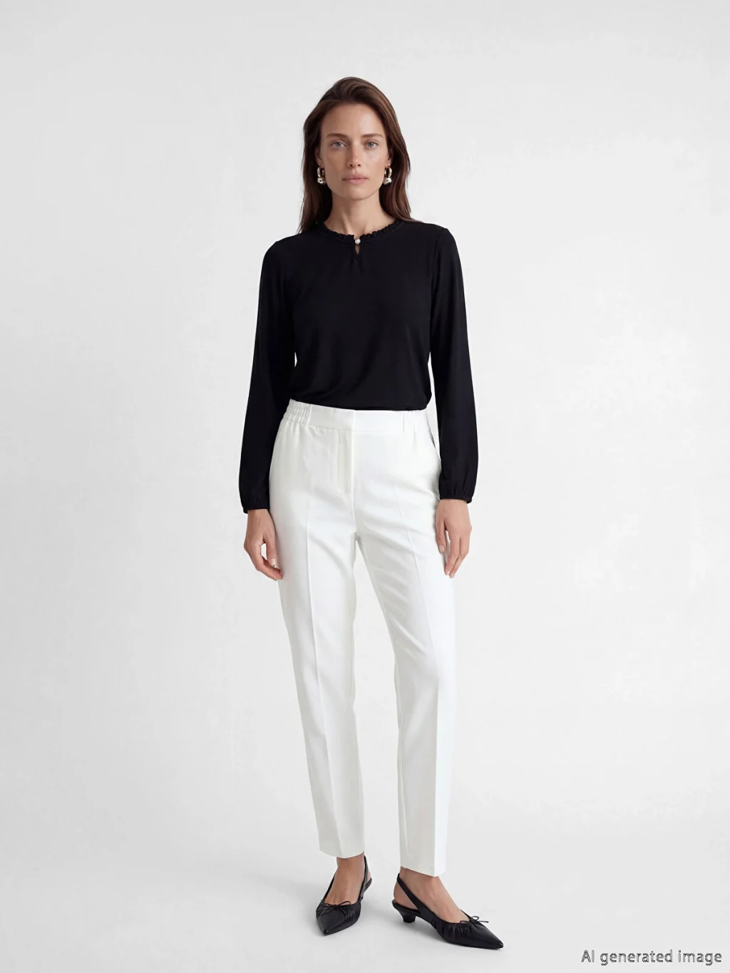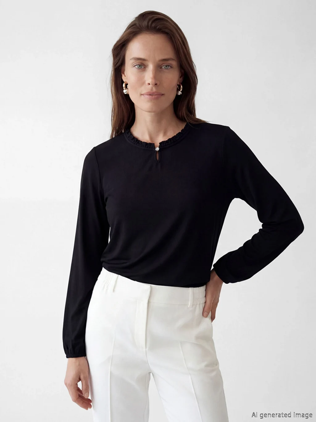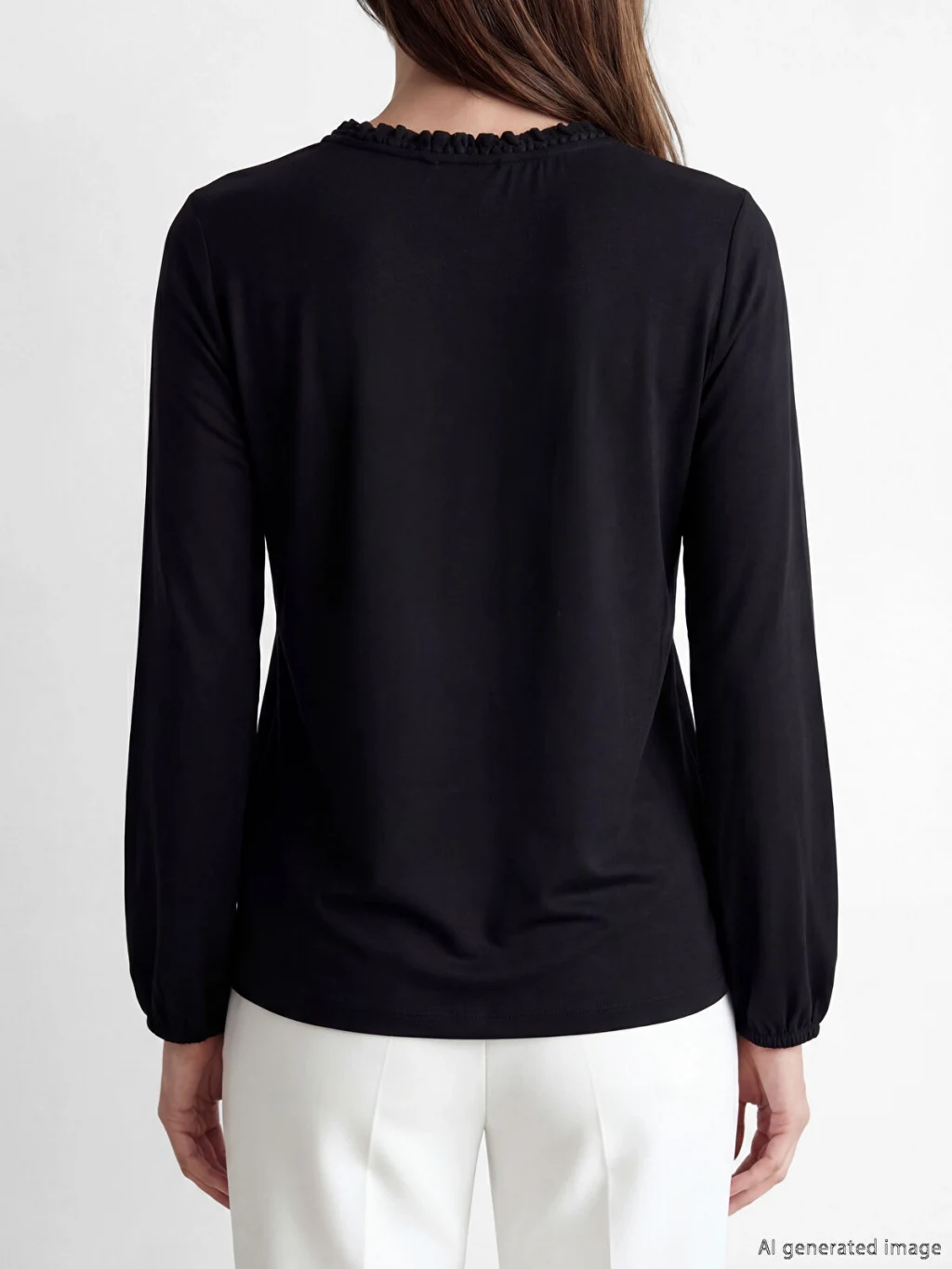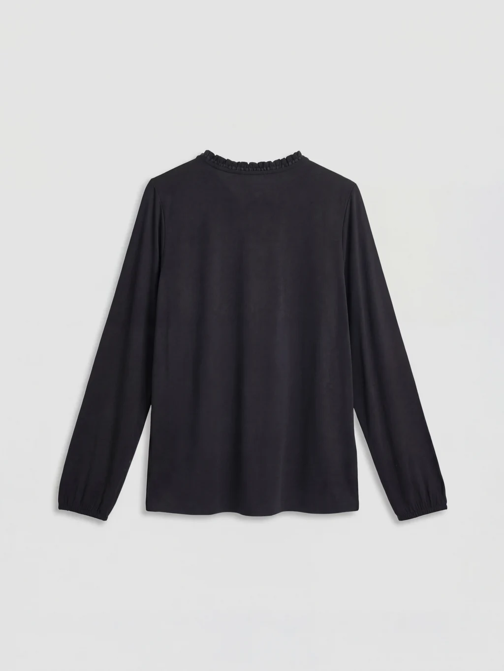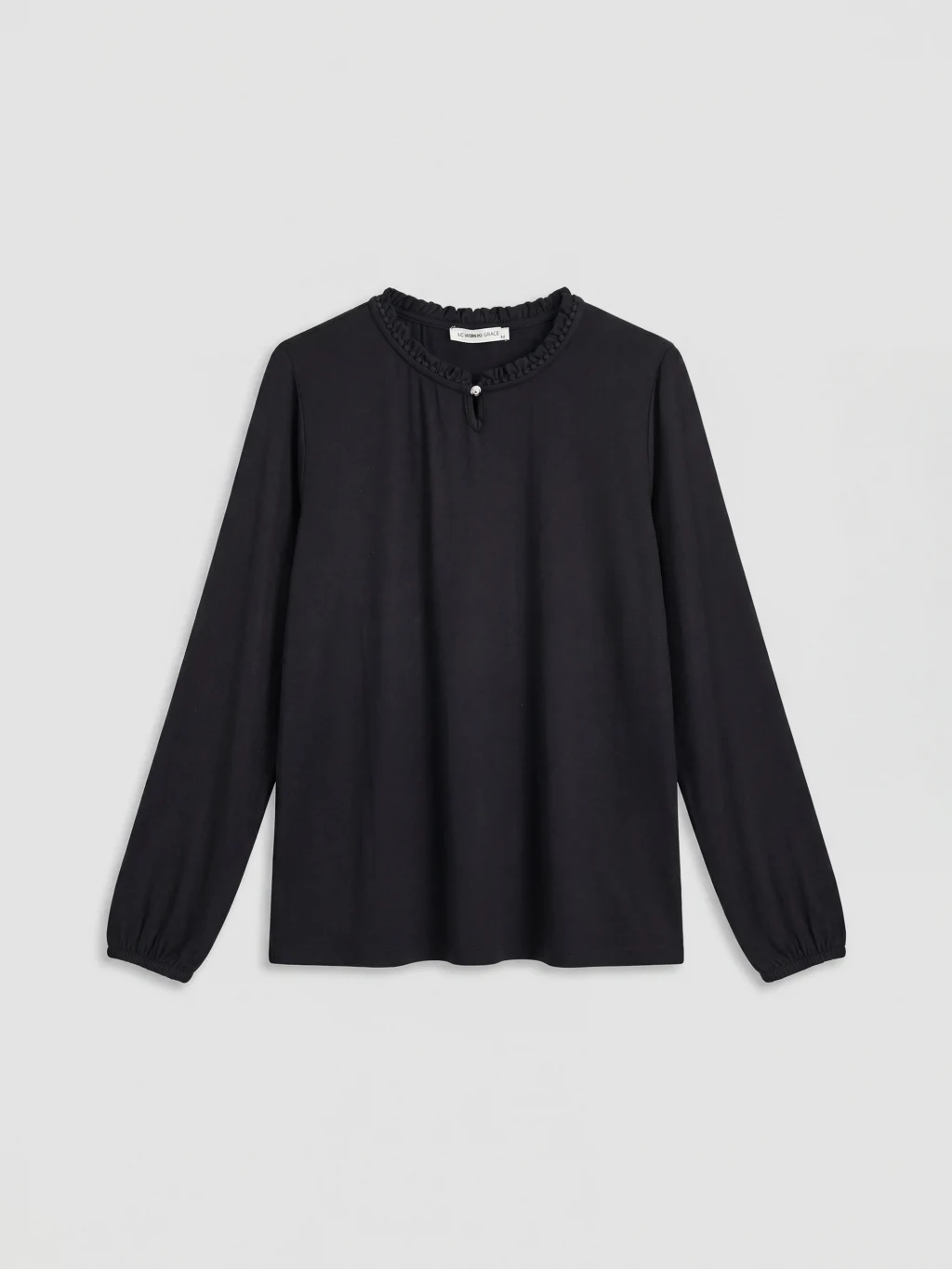 Fırfır detaylı yakası ve tek düğme kapamalı dekoltesi bulunan kadın bluz, uzun kolludur ve kol uçları büzgülüdür.