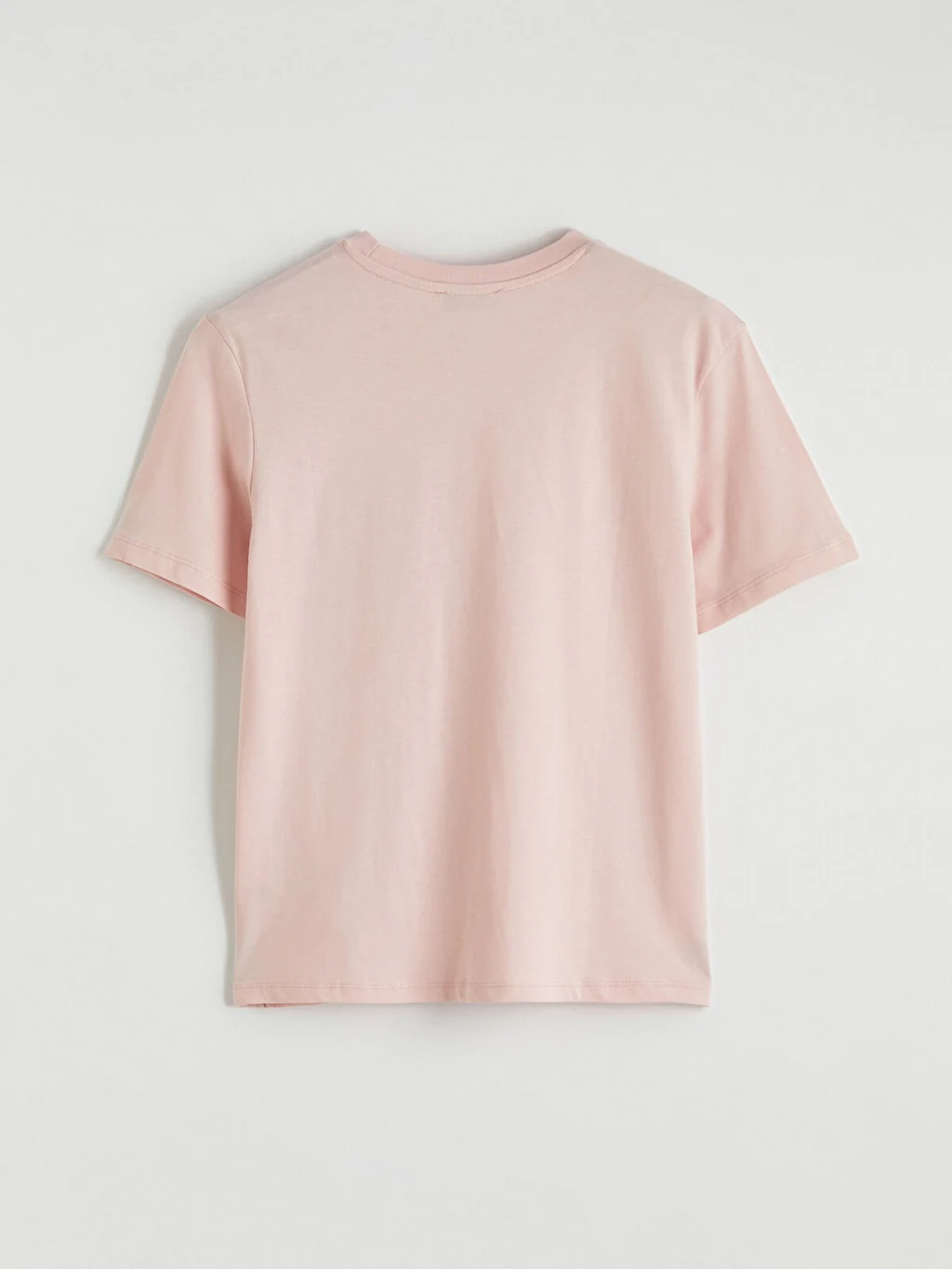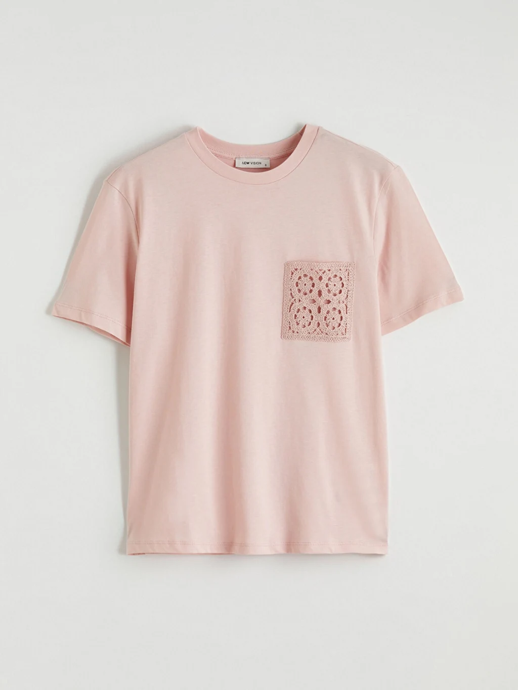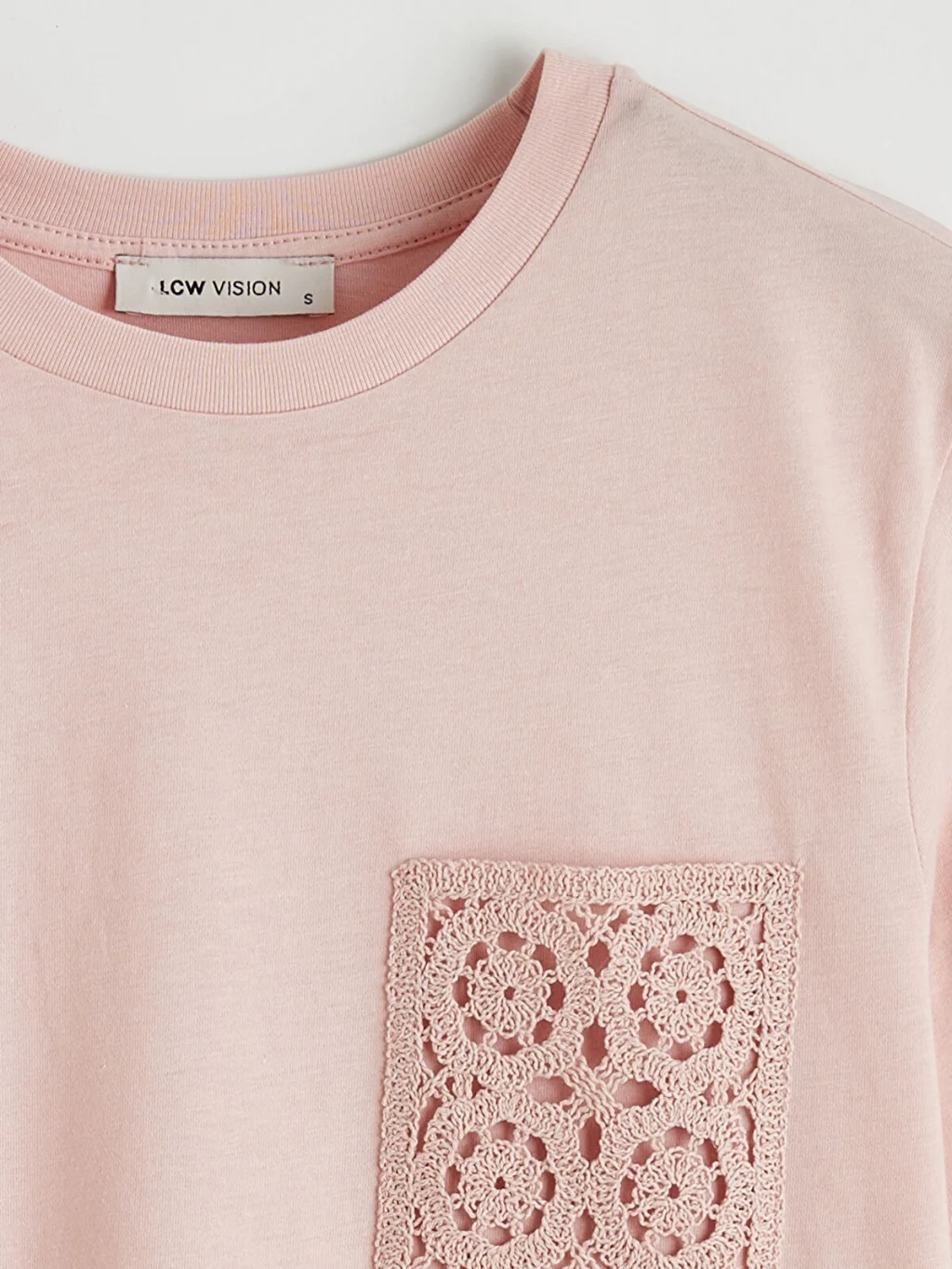 Bisiklet yaka ve kısa kollu kadın tişört, %100 pamuklu kumaştan üretilmiştir ve nakışlı cep detayına sahiptir.