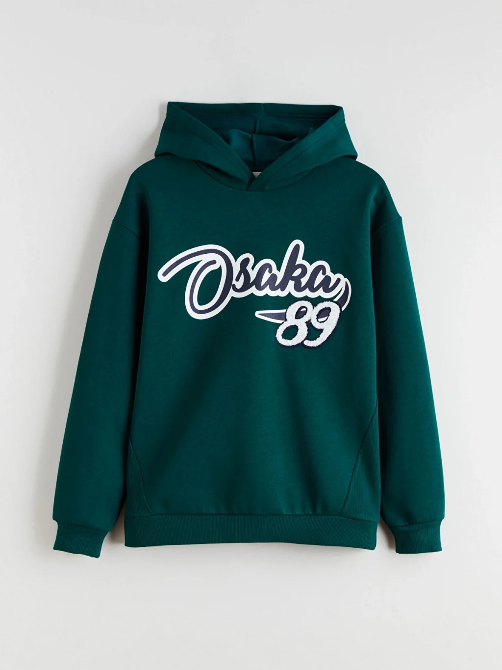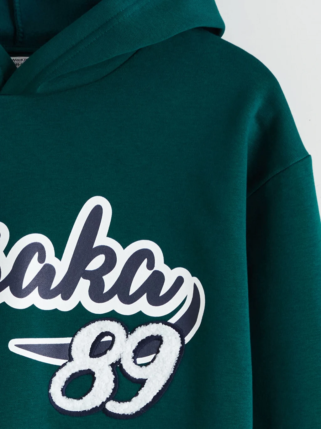 Kapüşonlu ve uzun kollu erkek çocuk sweatshirt, kalın 3 iplik şardonlu kumaştan üretilmiştir. Önü yazı nakışlıdır, kol ve etek ucu ribanalıdır.