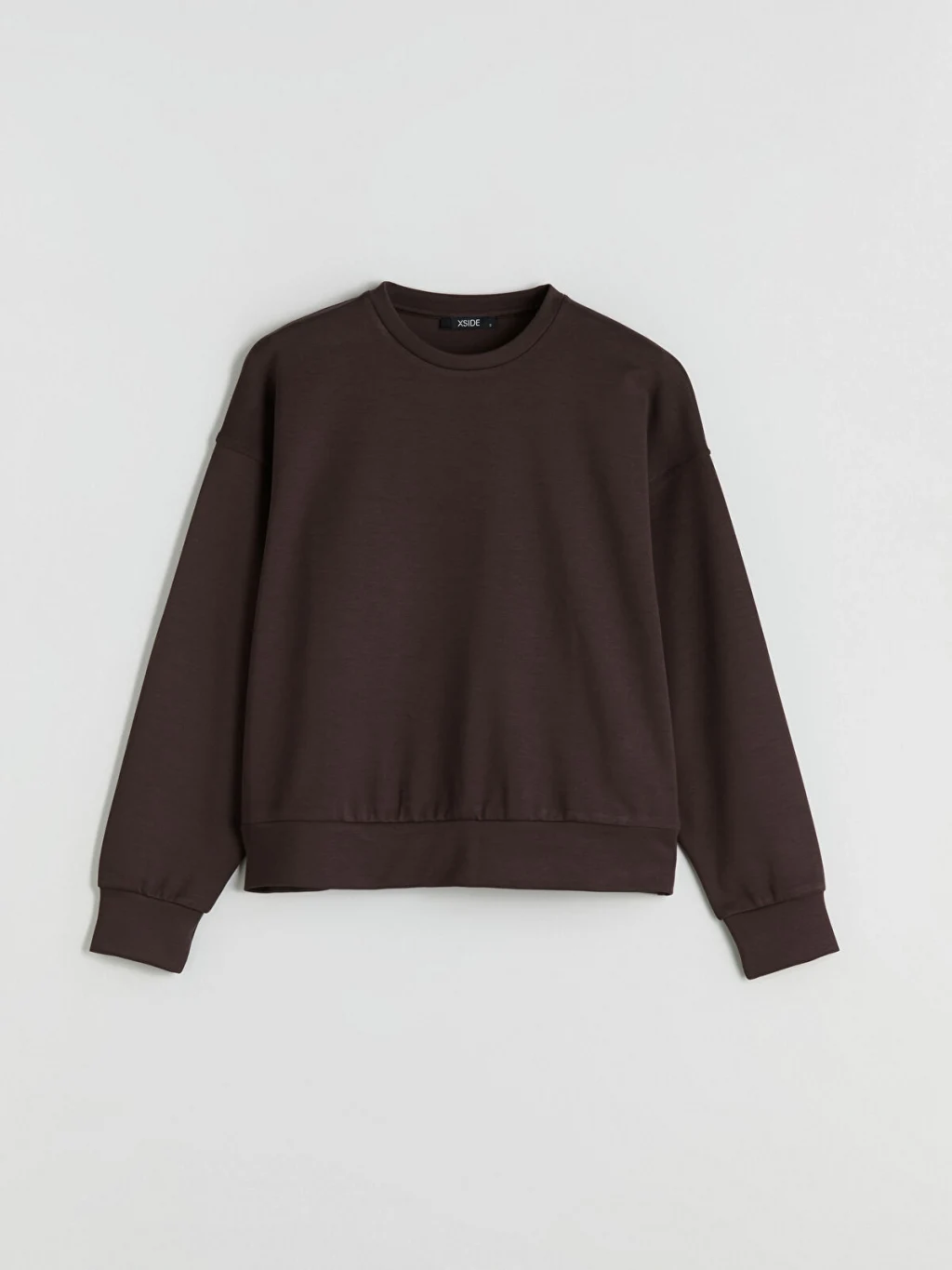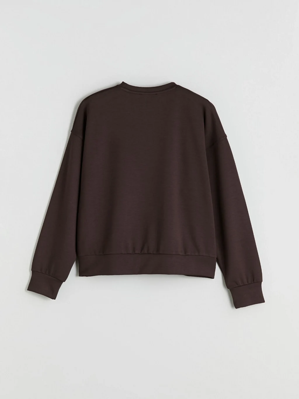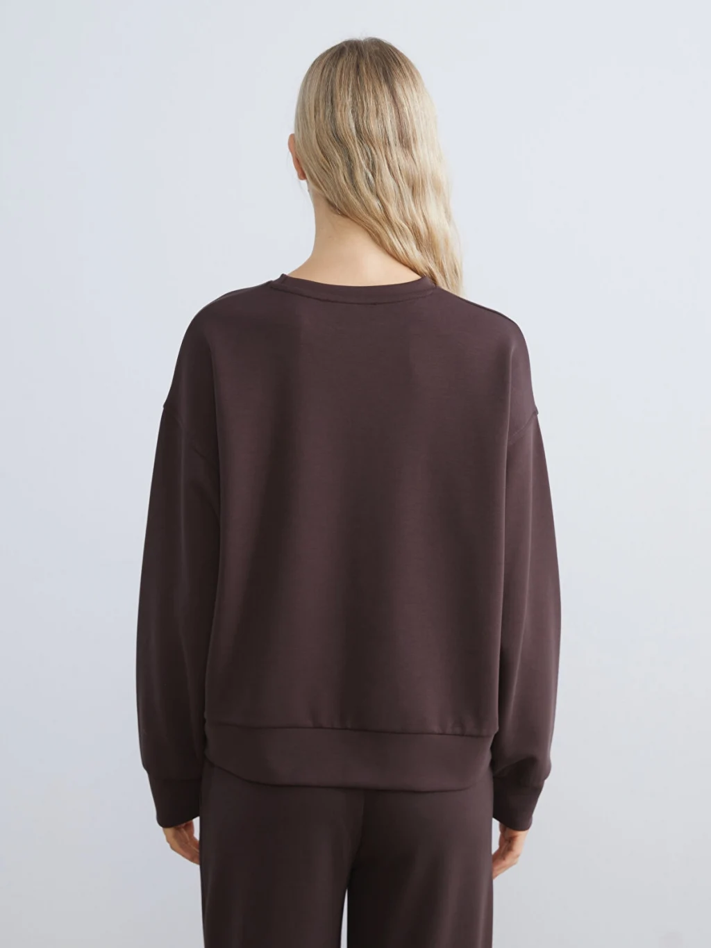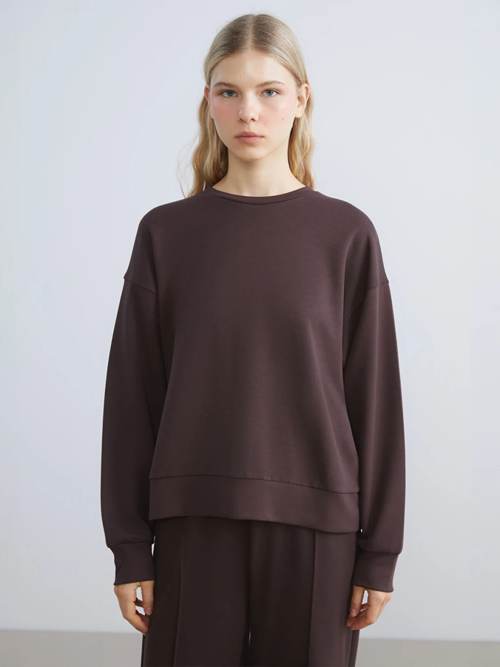 Bisiklet yaka kadın sweatshirt, interlok kumaştan üretilmiştir. Bilekleri ve alt kısmı ribanalıdır.