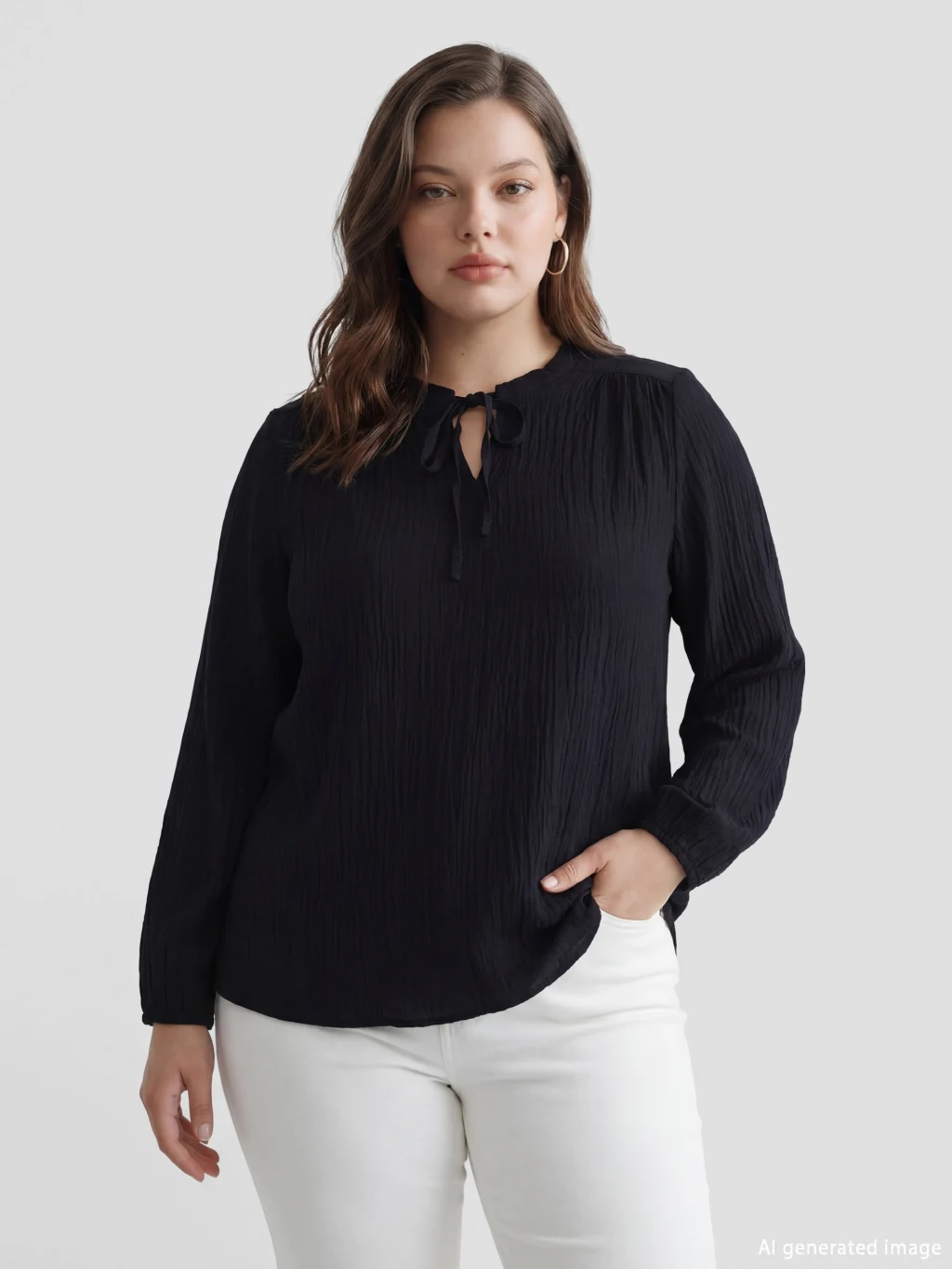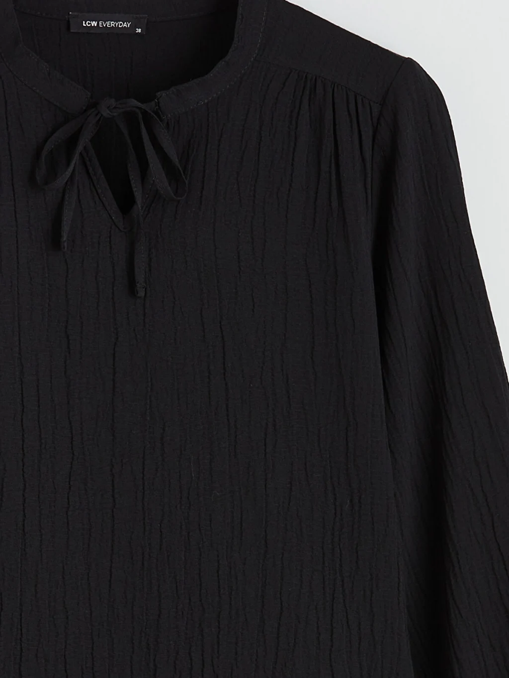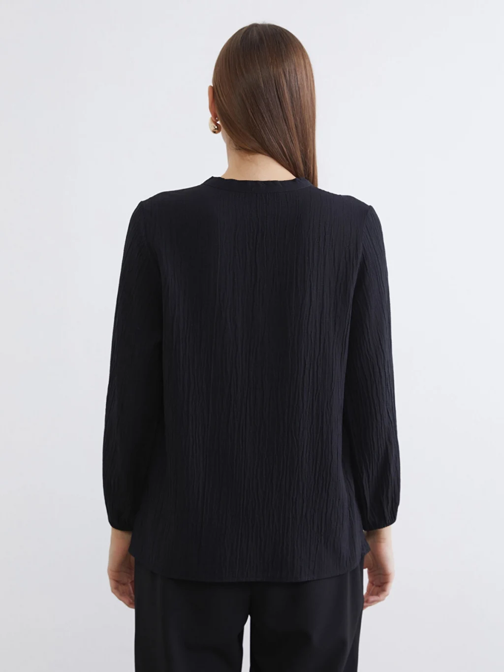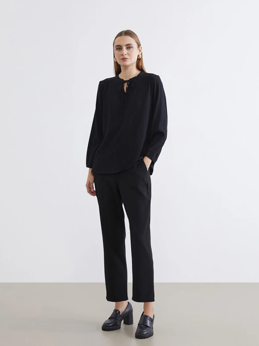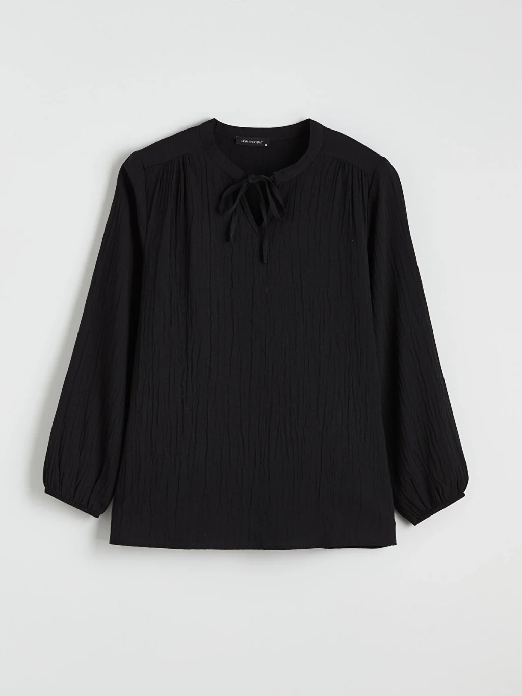 Uzun kollu, yakası bağlama detaylı kadın bluz. Robadan büzgülü tasarıma sahiptir ve kol uçları lastiklidir.