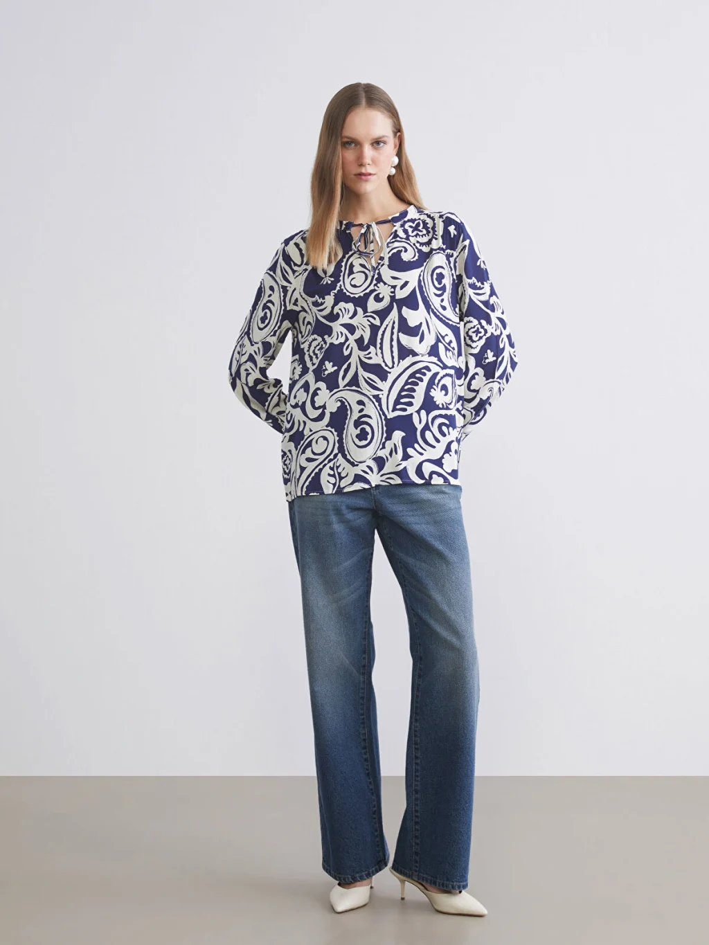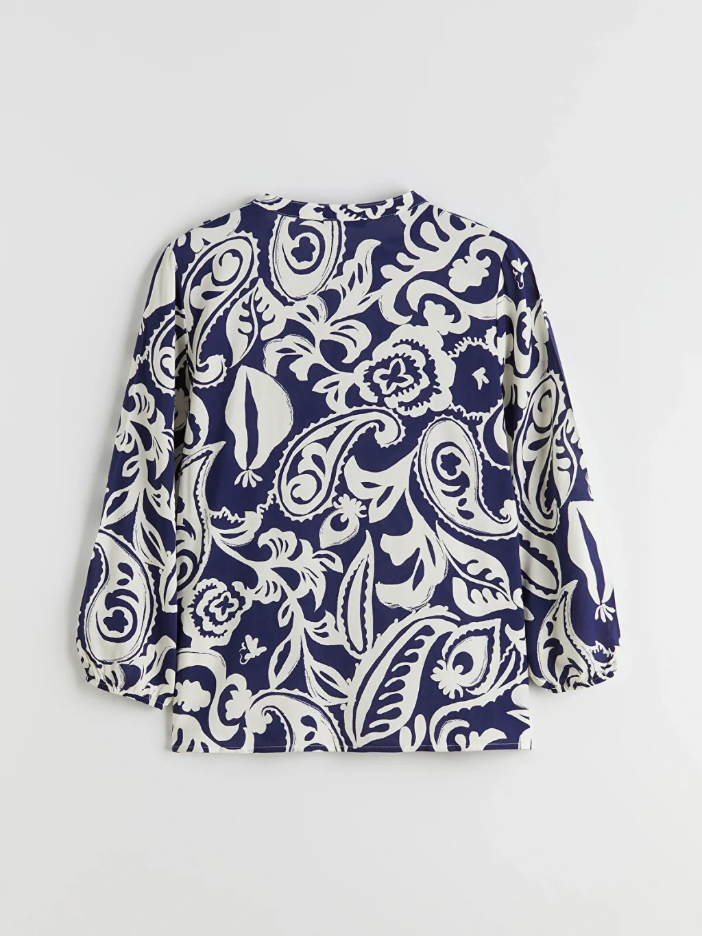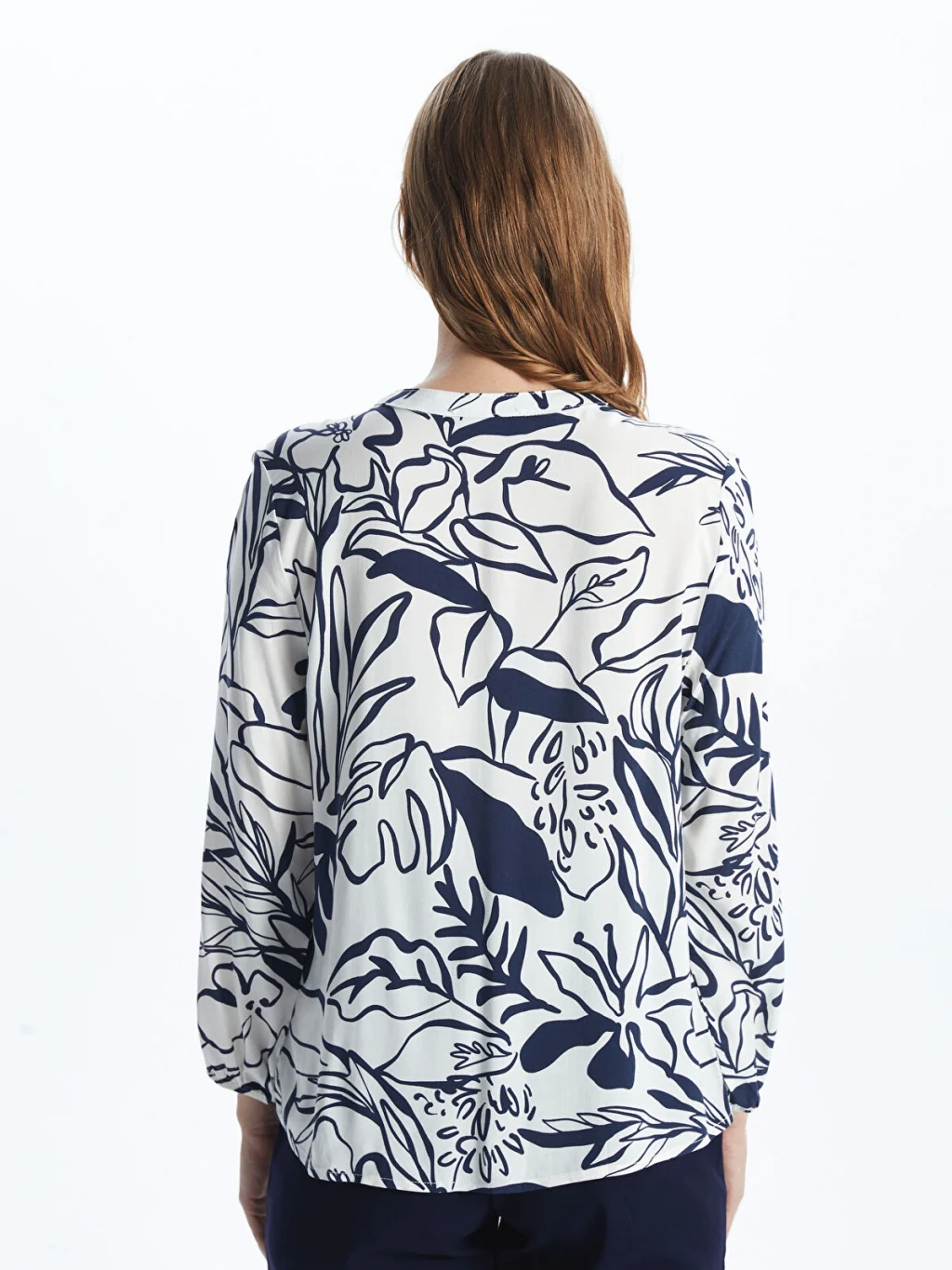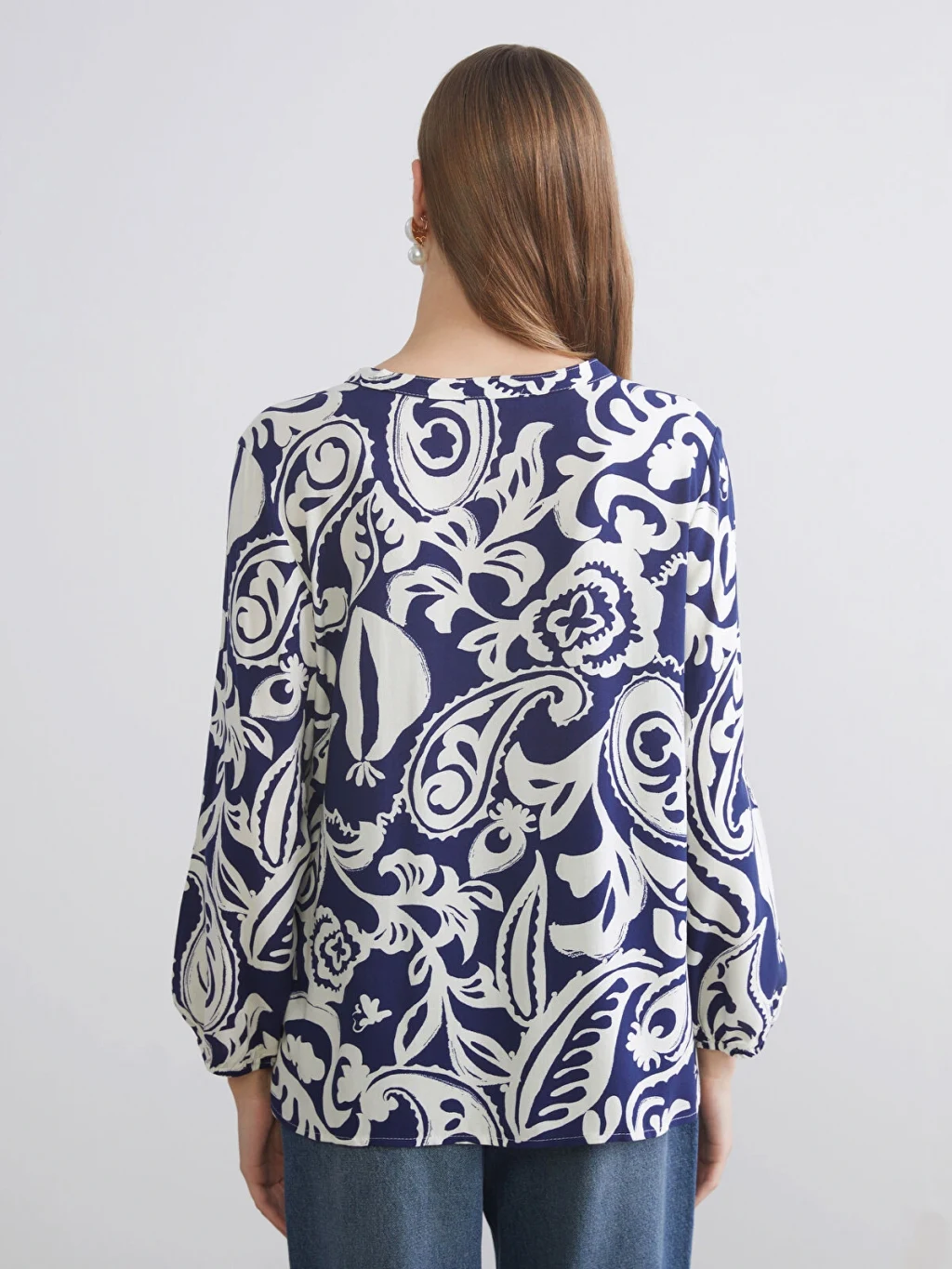 Desenli viskon kumaştan üretilen kadın bluz, V yaka kesimli hakim yakalıdır. Önü düğme kapamalıdır ve üç çeyrek boy kolları lastik manşetlidir.