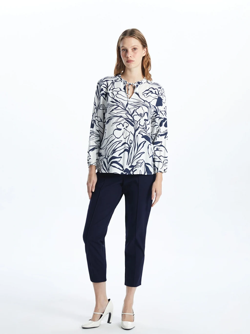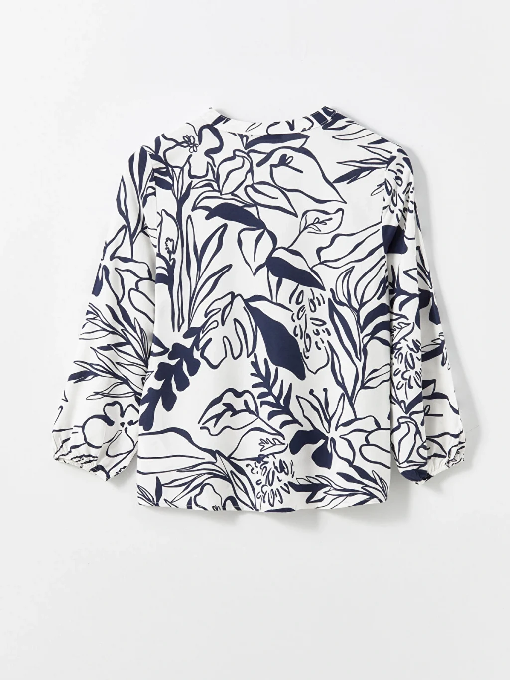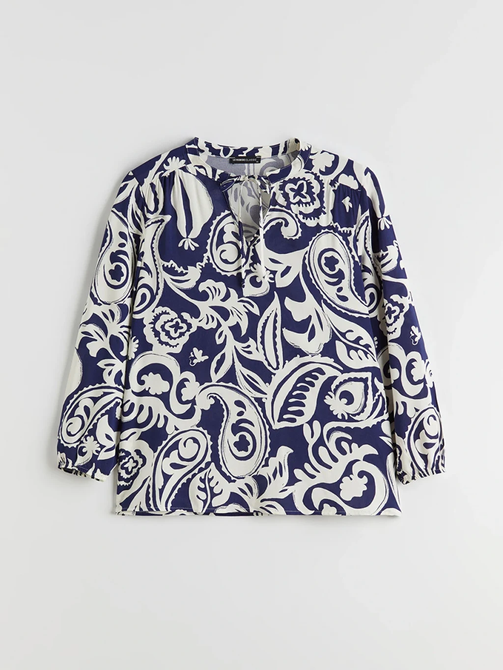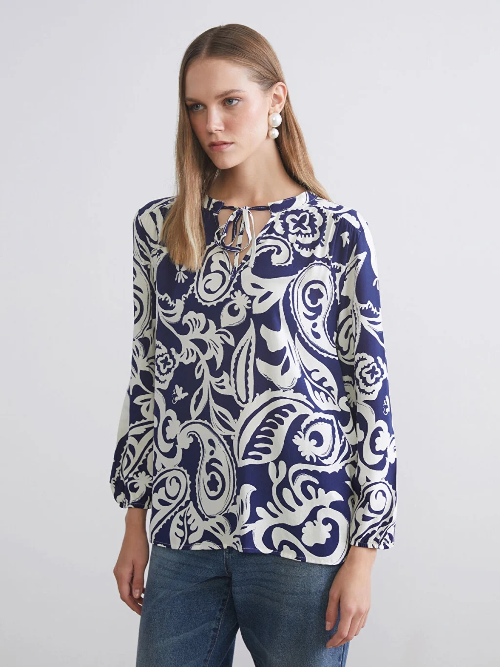 Desenli viskon kumaştan üretilen kadın bluz, V yaka kesimli hakim yakalıdır. Önü düğme kapamalıdır ve üç çeyrek boy kolları lastik manşetlidir.