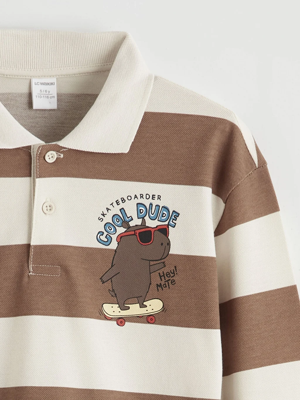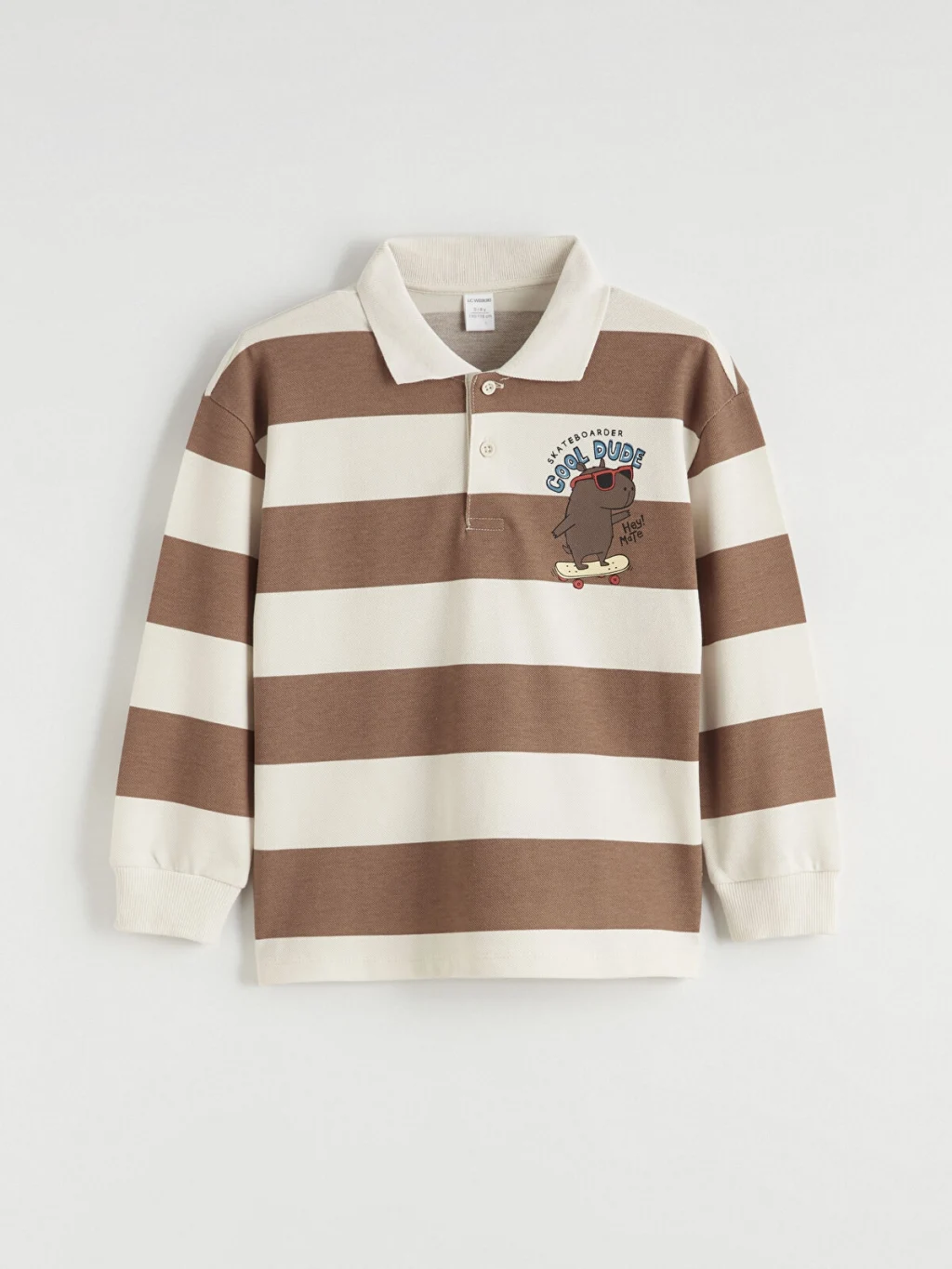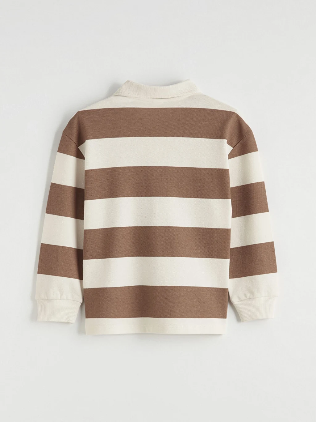 Polo yakalı ve uzun kollu erkek çocuk tişört, %100 pamuklu pike kumaştan üretilmiştir. Bol kalıplı ürün, düğme kapamalı ve çizgili desene sahiptir.