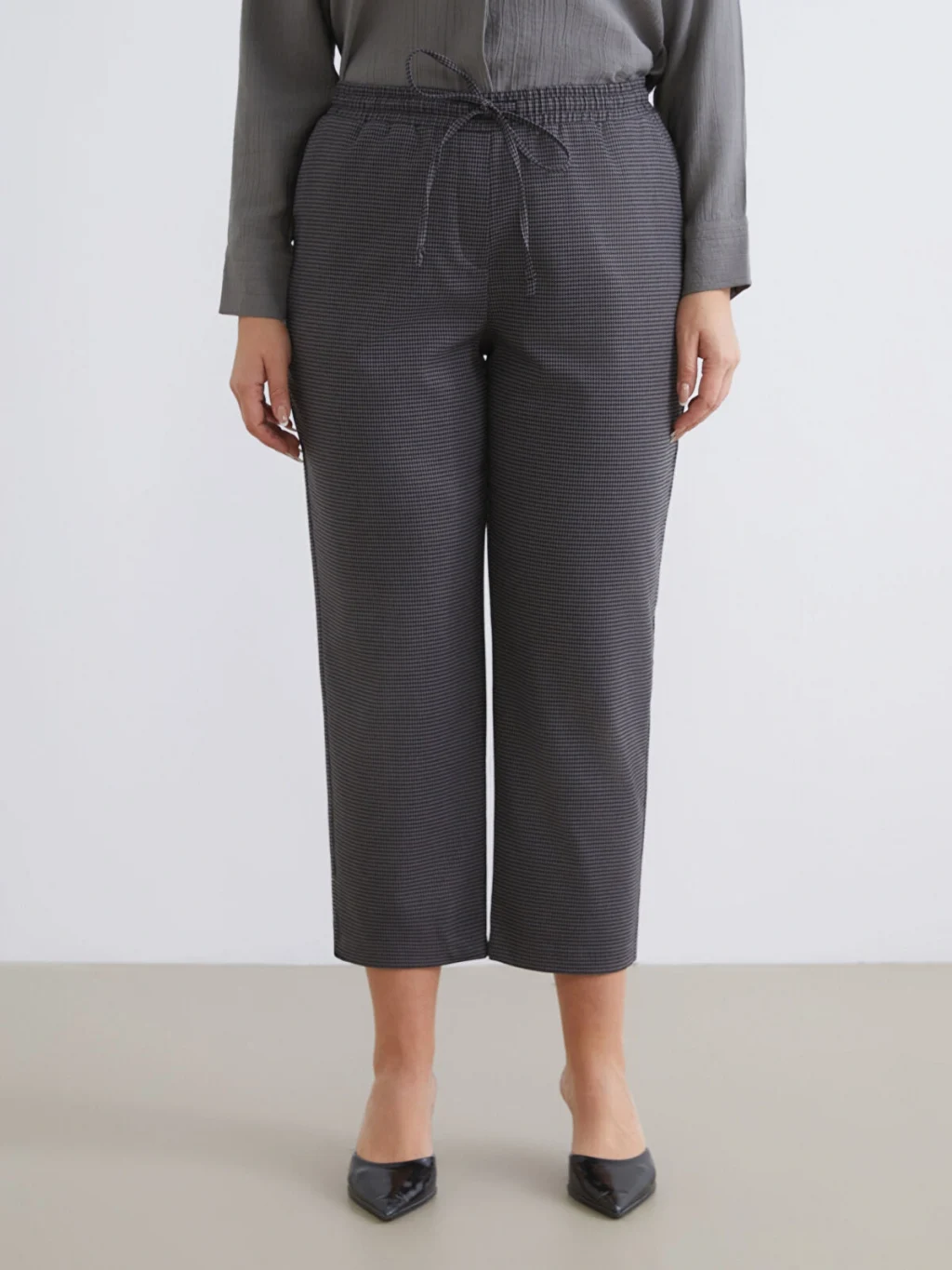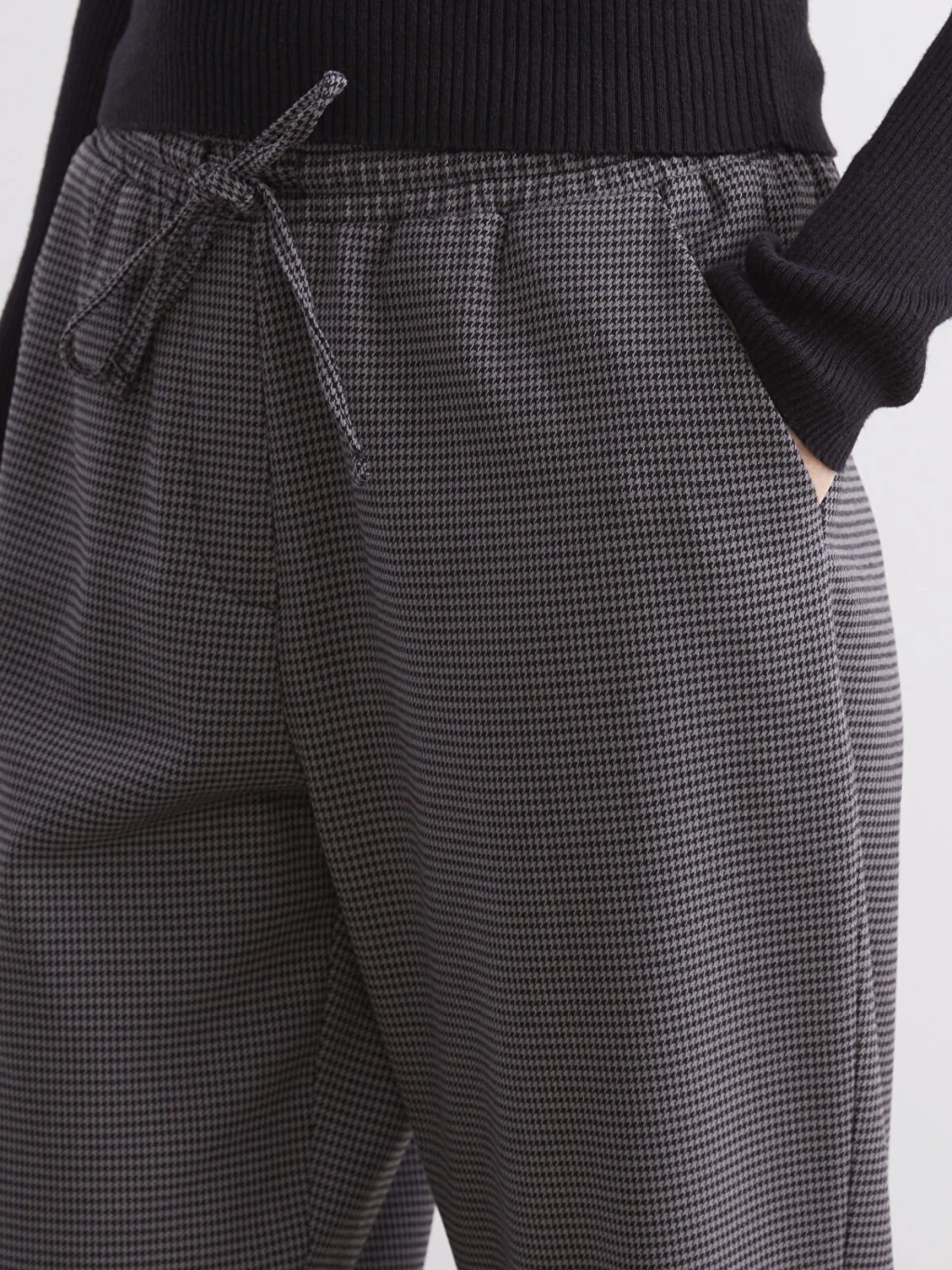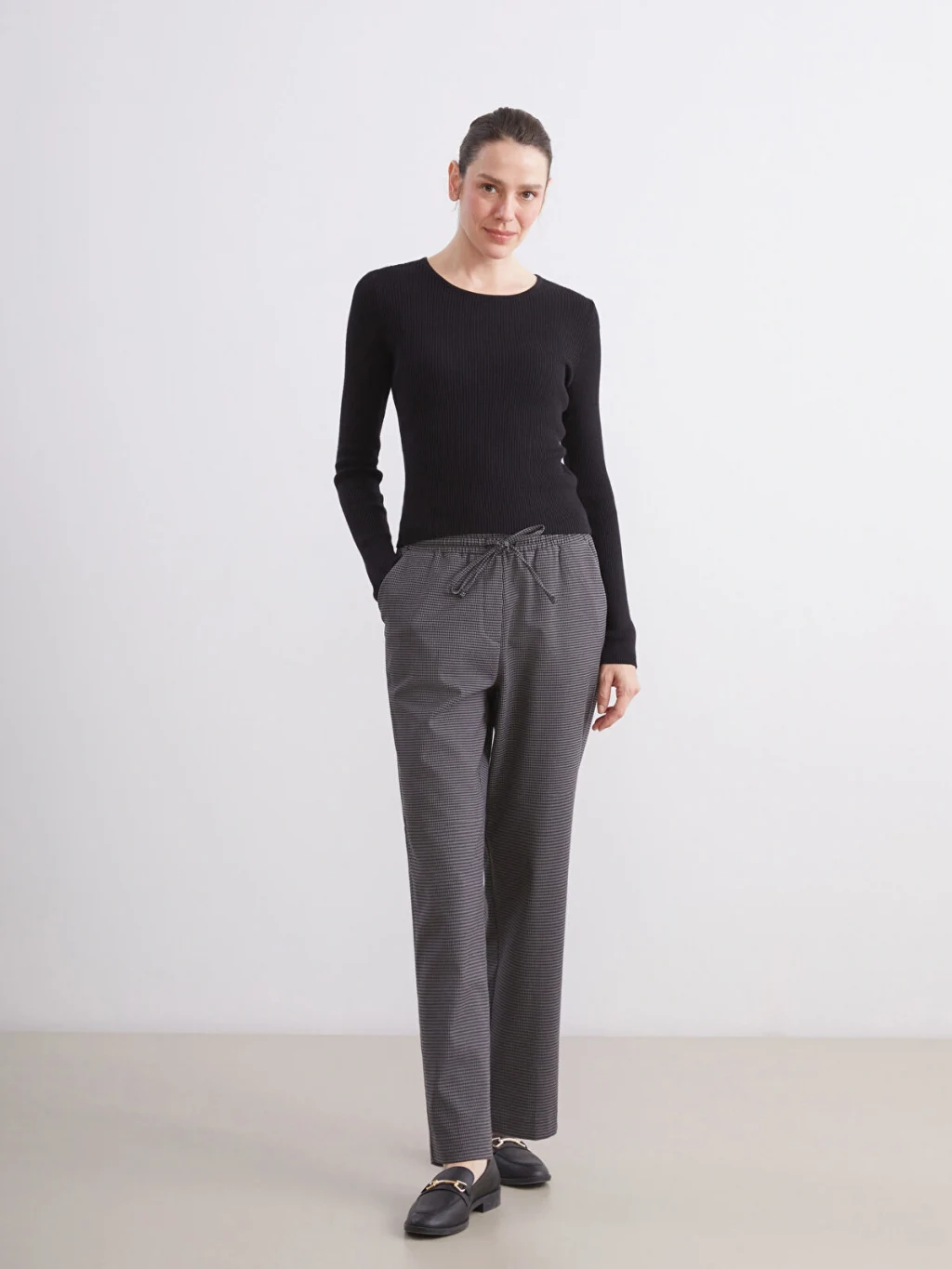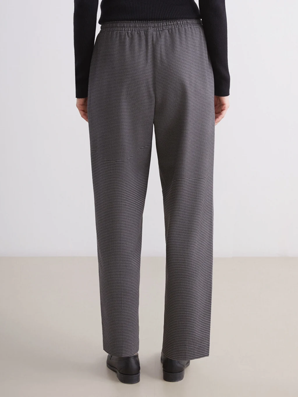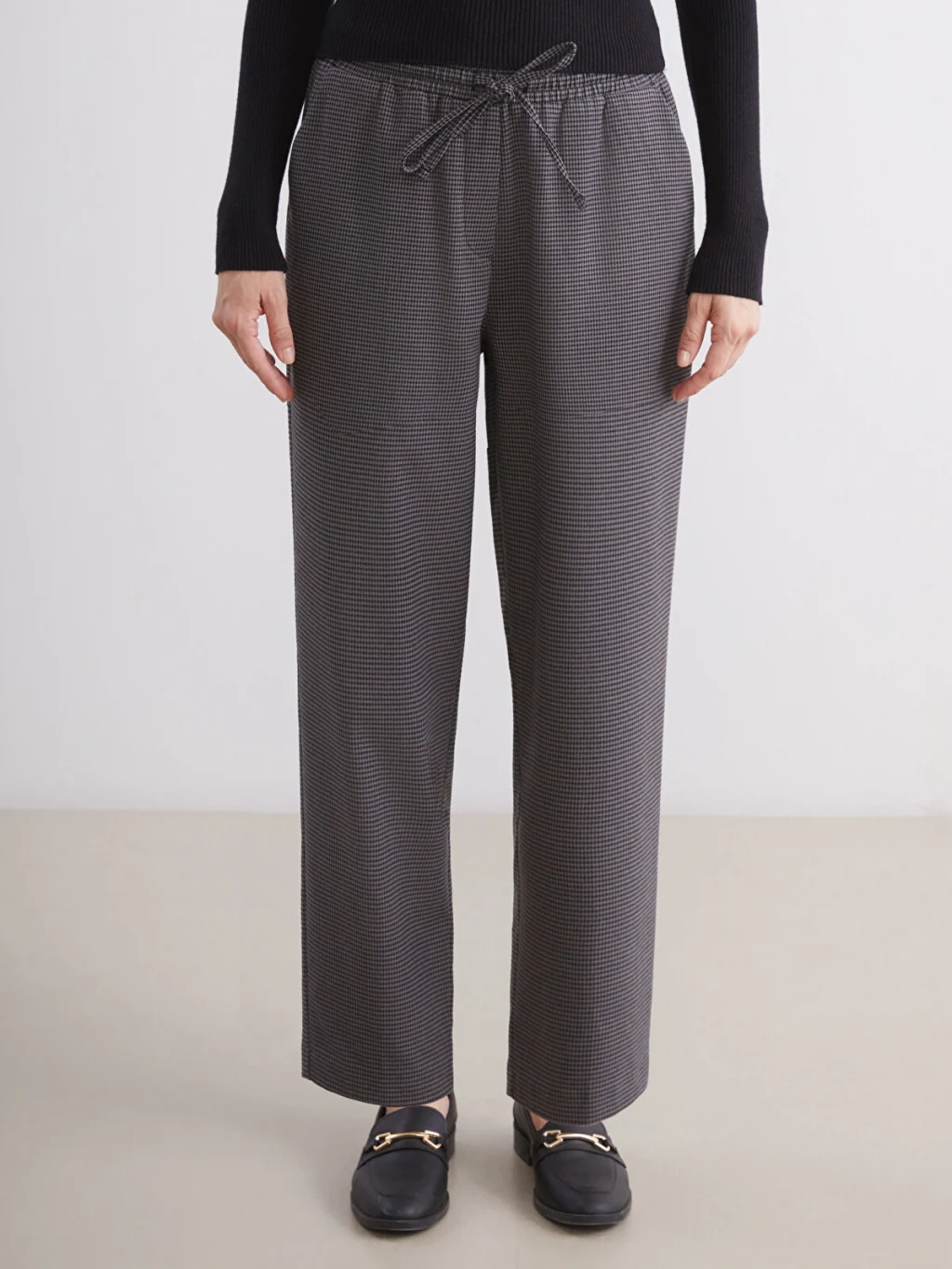 Beli lastikli balıksırtı desenli kadın pantolon, poliviskon kumaştan üretilmiştir. İki yandan cepli ve beli bağcıklı tasarıma sahiptir.