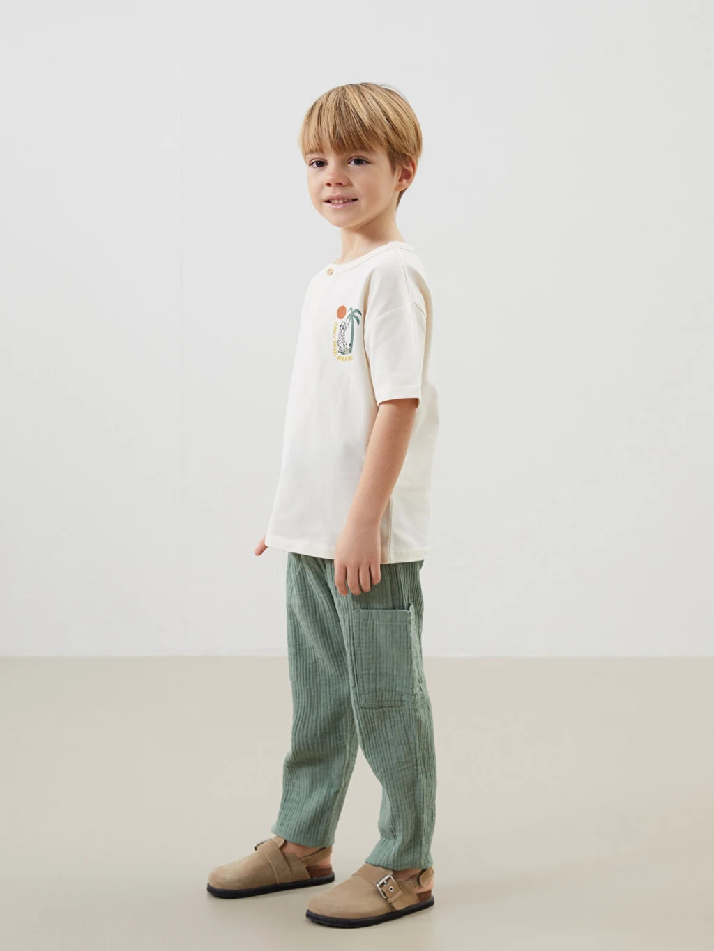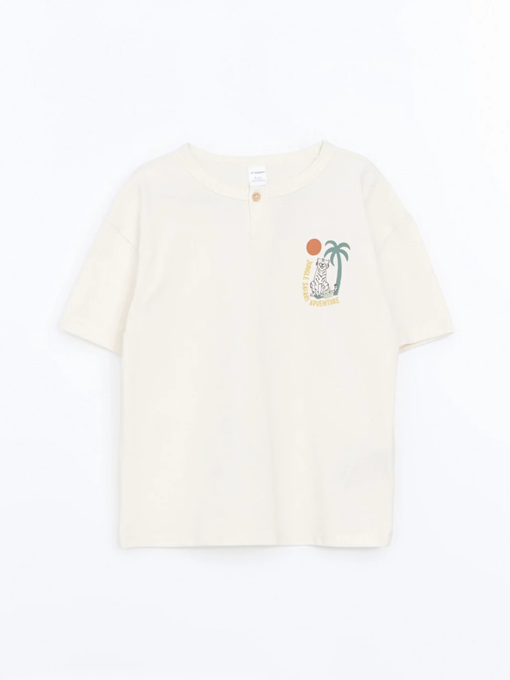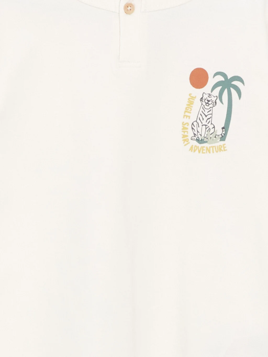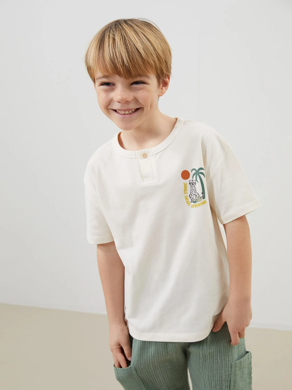 Kısa kollu, bisiklet yakalı ve düğme kapamalı erkek çocuk tişört, %100 pamuklu pike kumaştan üretilmiştir. Ön yüzü baskılıdır.