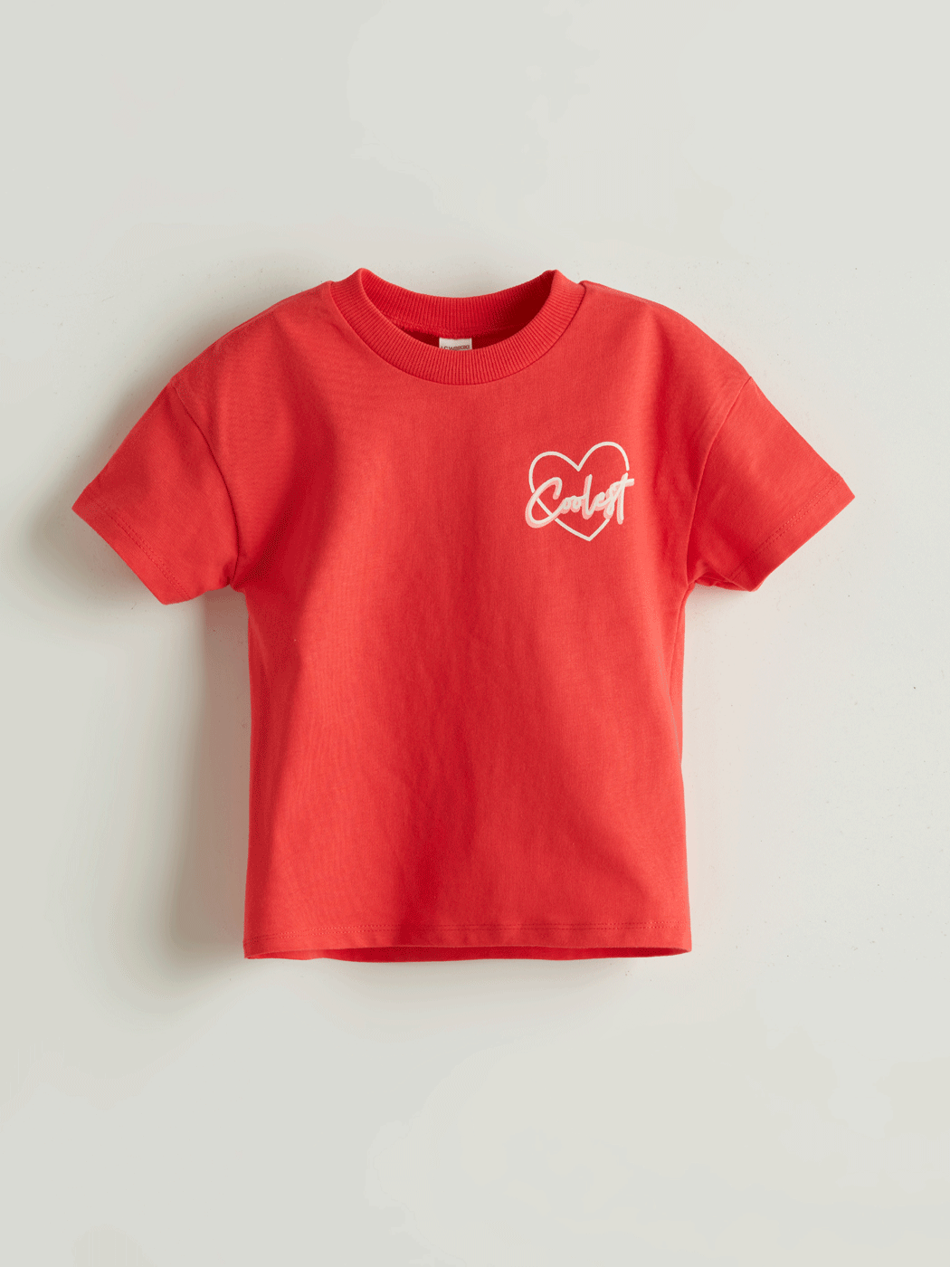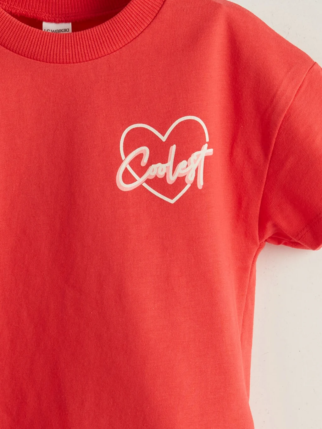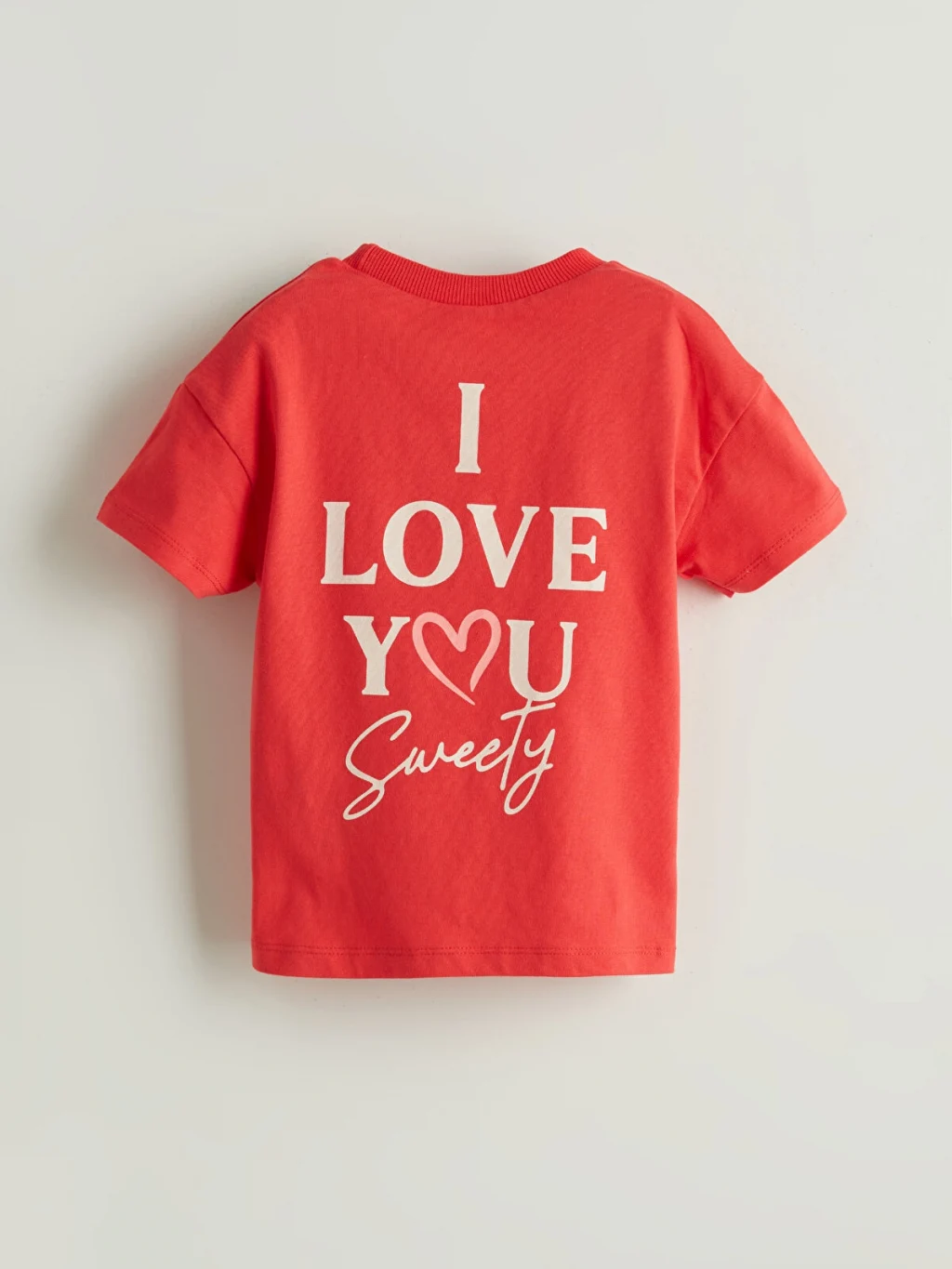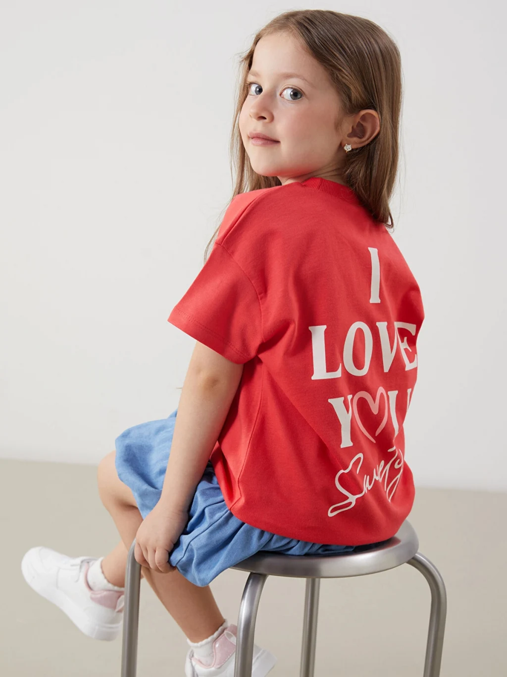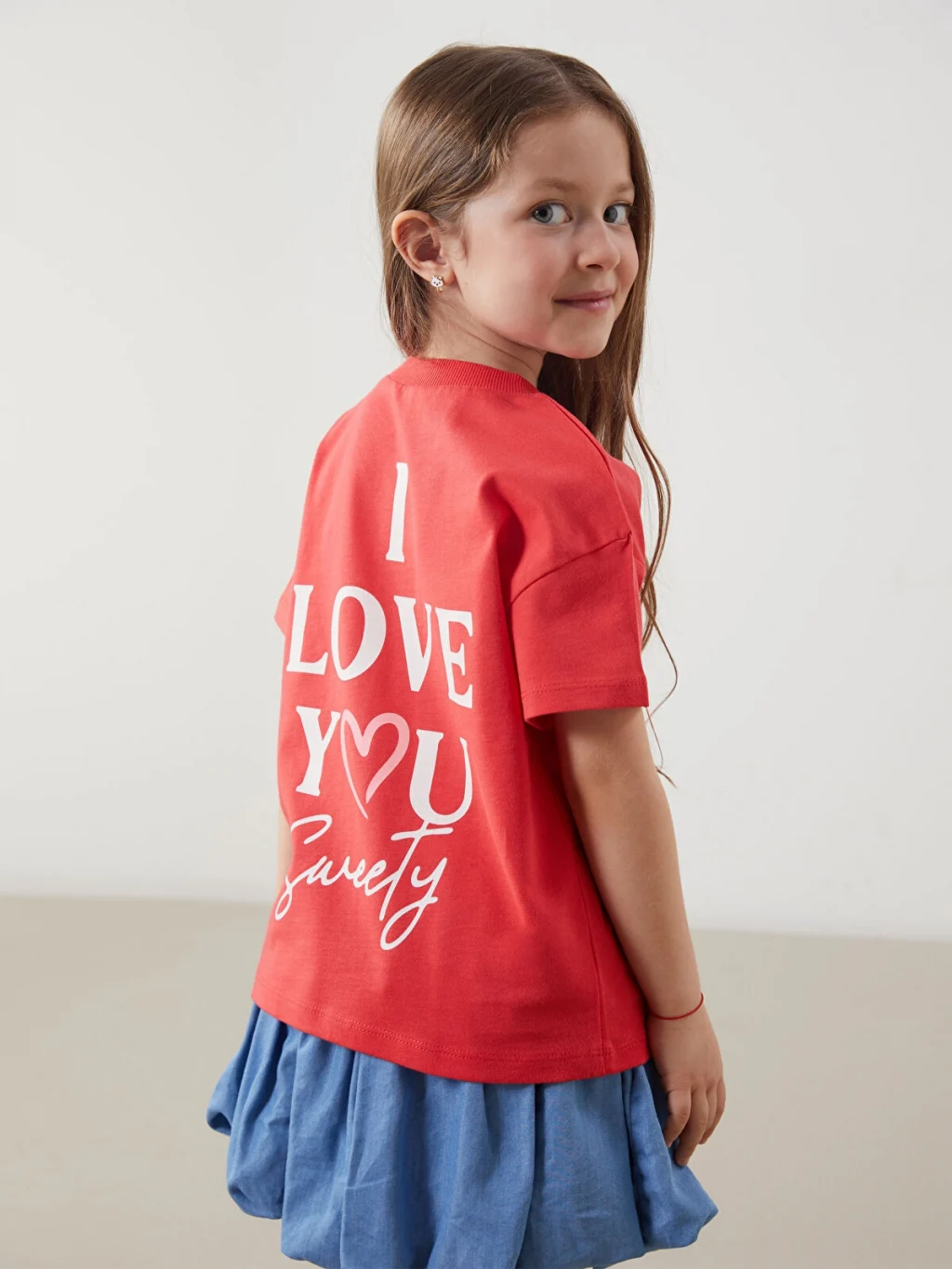 Bisiklet yaka, kısa kollu kız çocuk tişört, %100 pamuklu penye kumaştan üretilmiştir. Sırtı slogan baskılıdır.