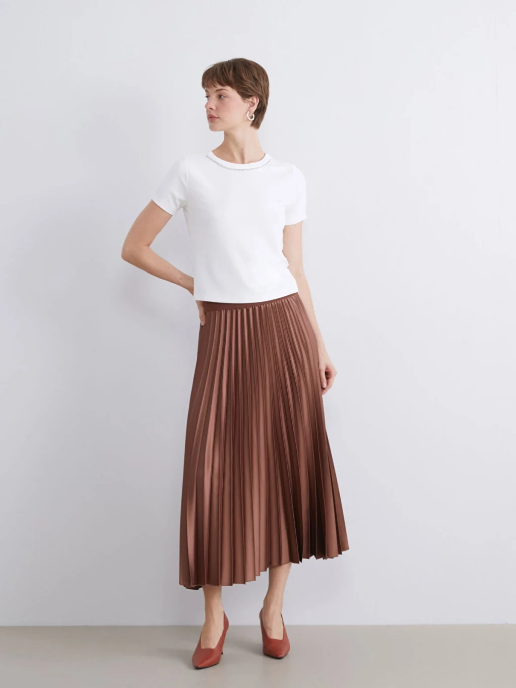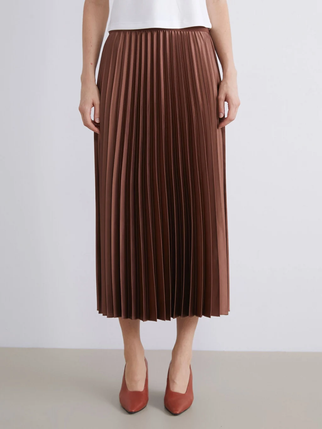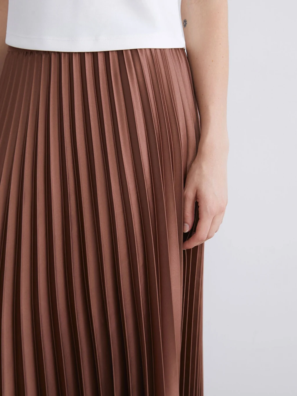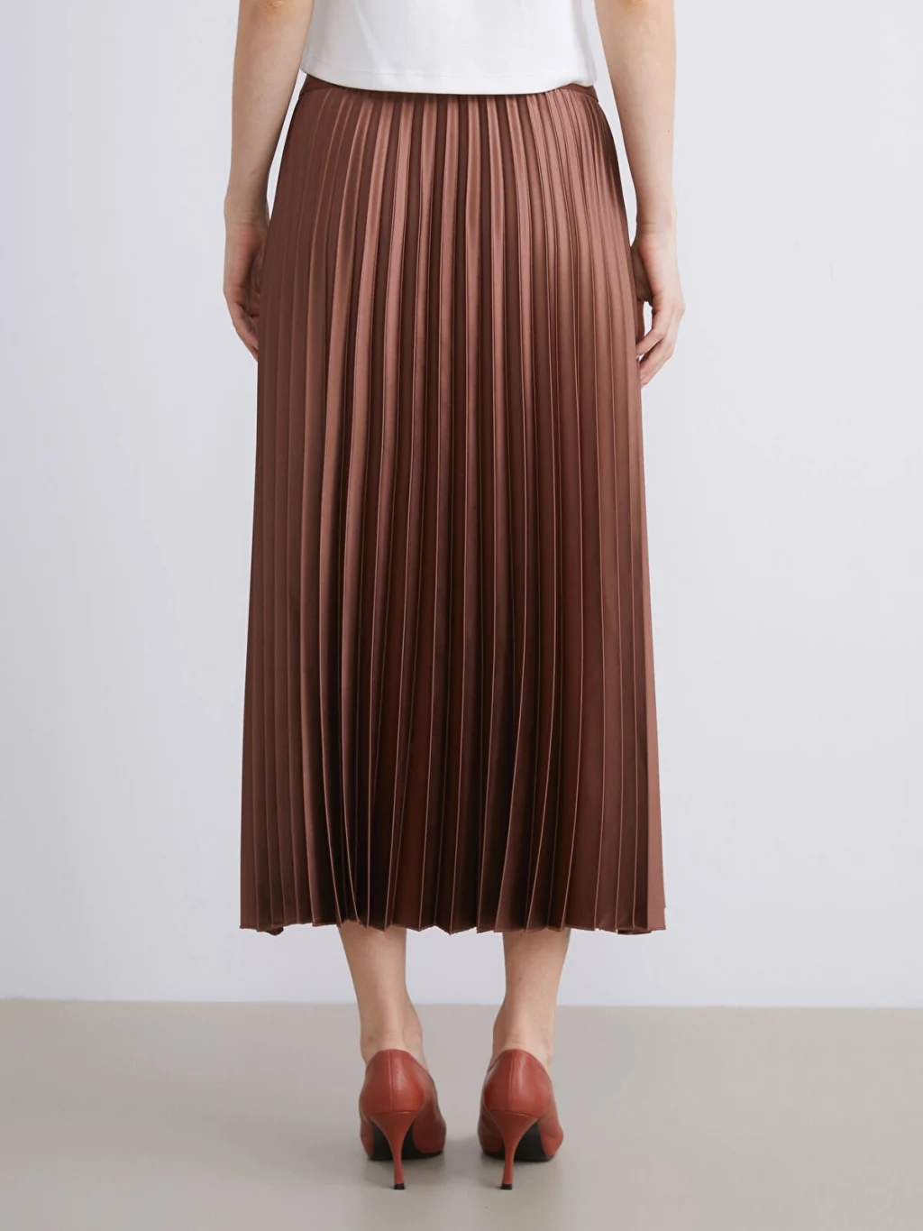 Beli lastikli ve piliseli kadın etek, saten kumaştan üretilmiştir. Astarsız olan model, midi boy kesime sahiptir.
