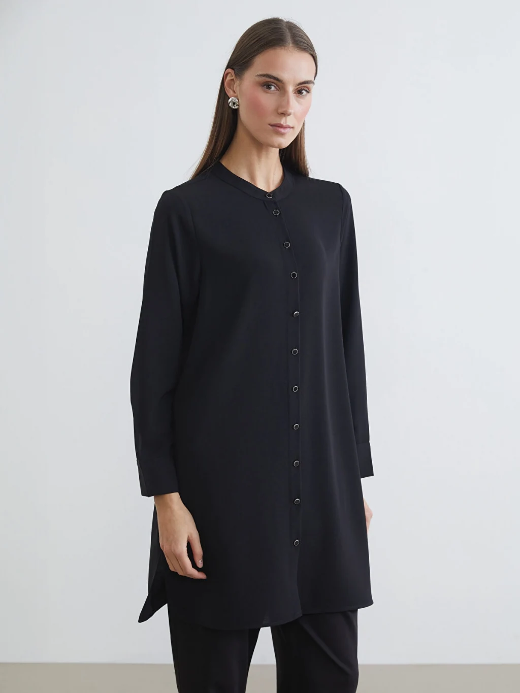 Hakim yakalı ve uzun kollu kadın gömlek tunik, önden boydan boya düğme kapamalıdır. Manşetleri düğmelidir.