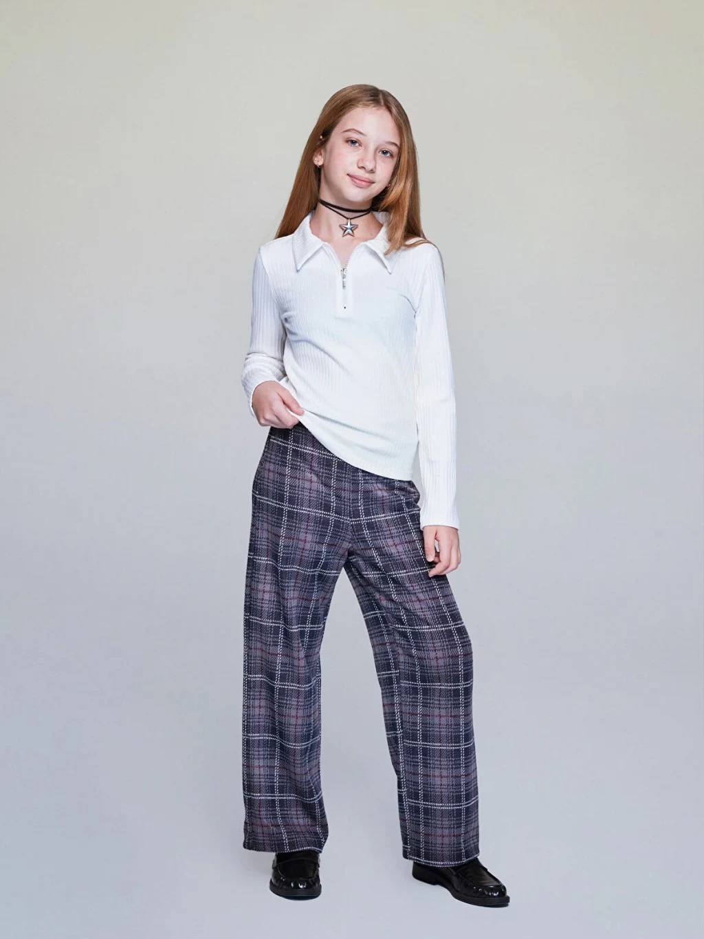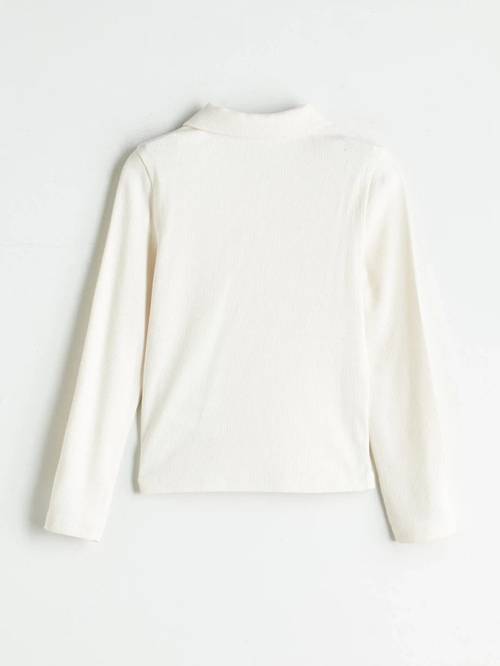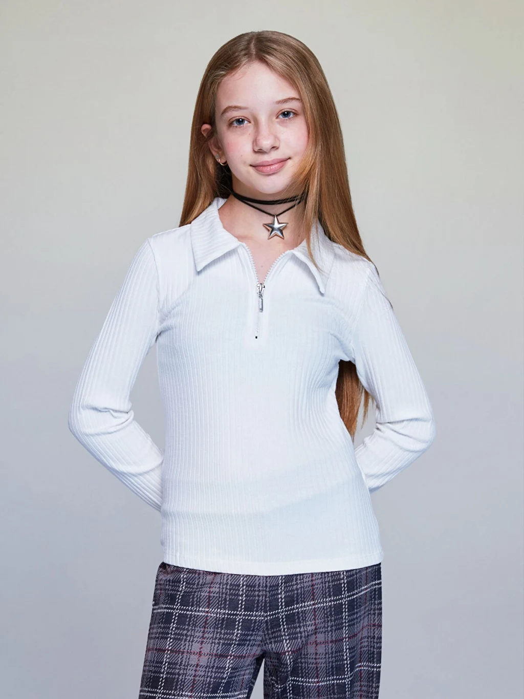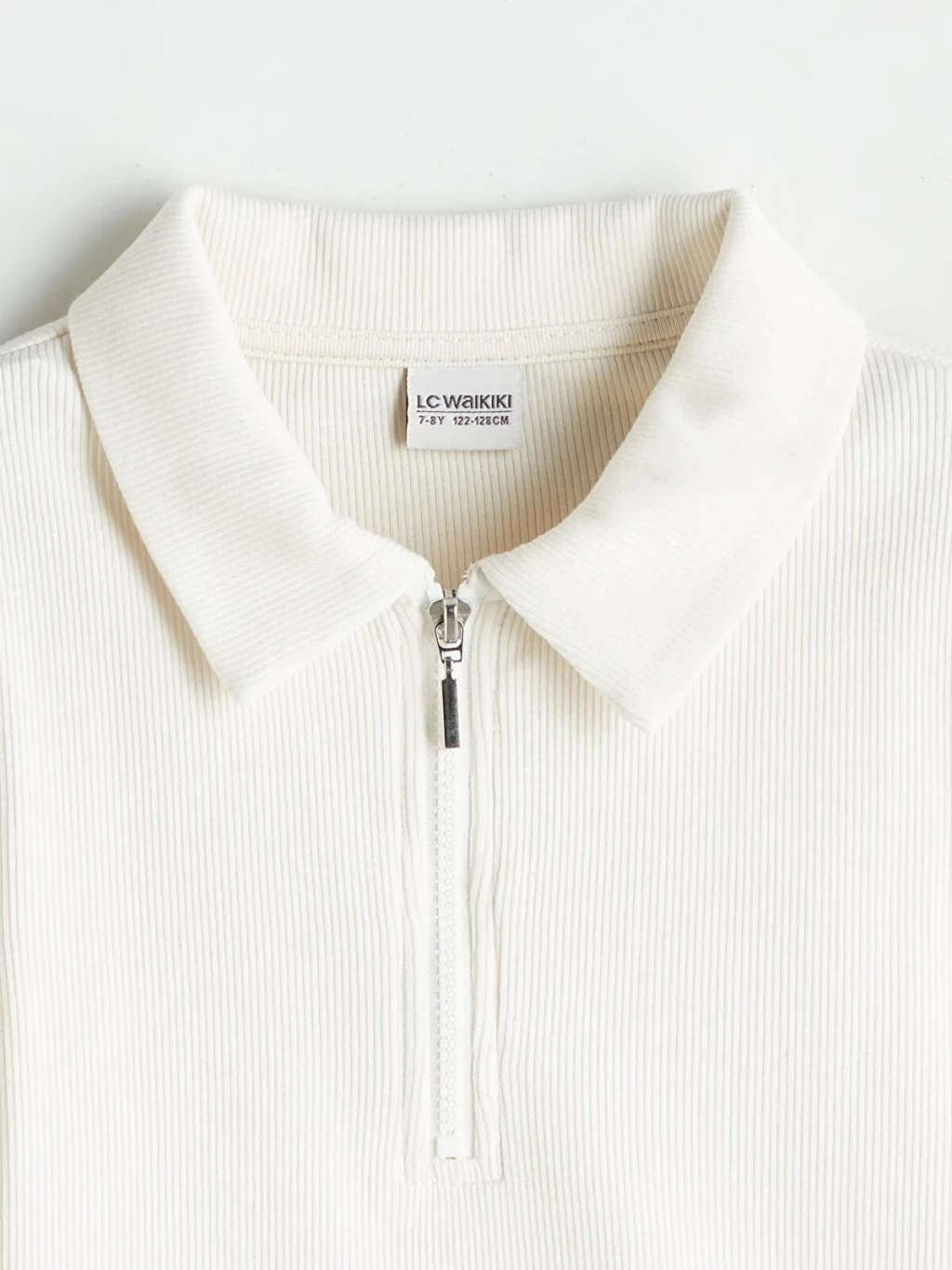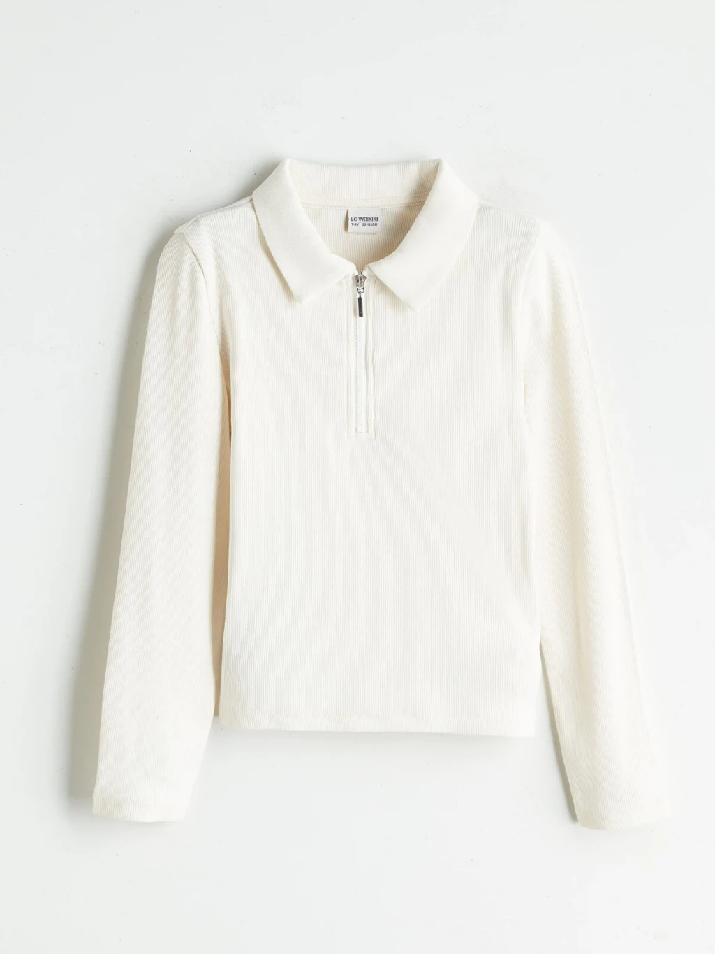 Polo yakalı ve uzun kollu kız çocuk tişört, dar kalıp kaşkorse kumaştan üretilmiştir. Önü yarım fermuar kapamalıdır.
