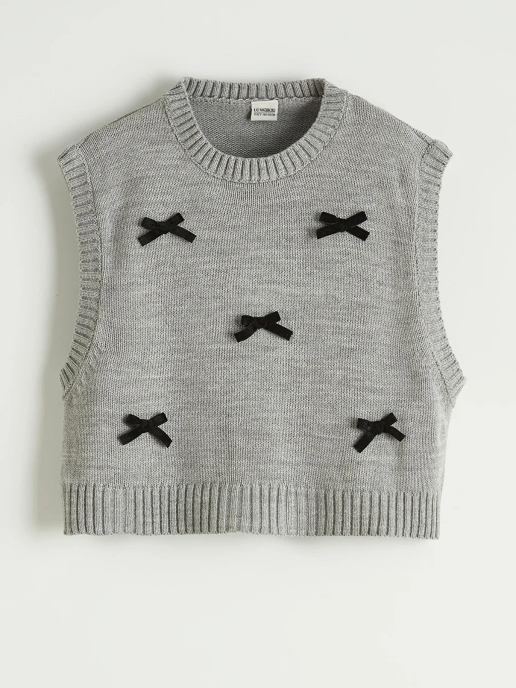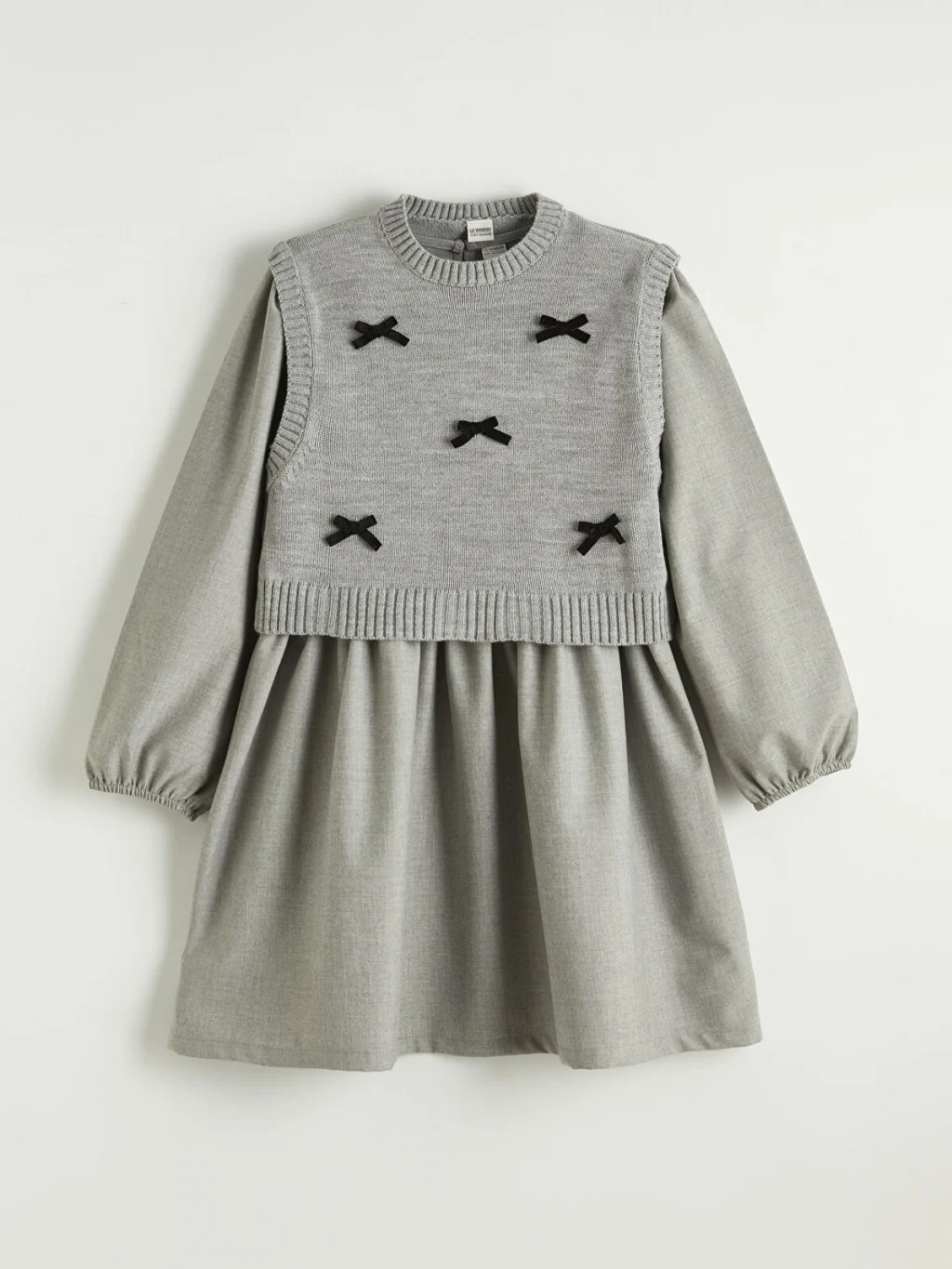 Triko süveterli elbise takımı, bisiklet yaka ve uzun kollu tasarıma sahiptir. Elbise arkadan düğme kapamalı, süveter ise fiyonk detaylıdır.