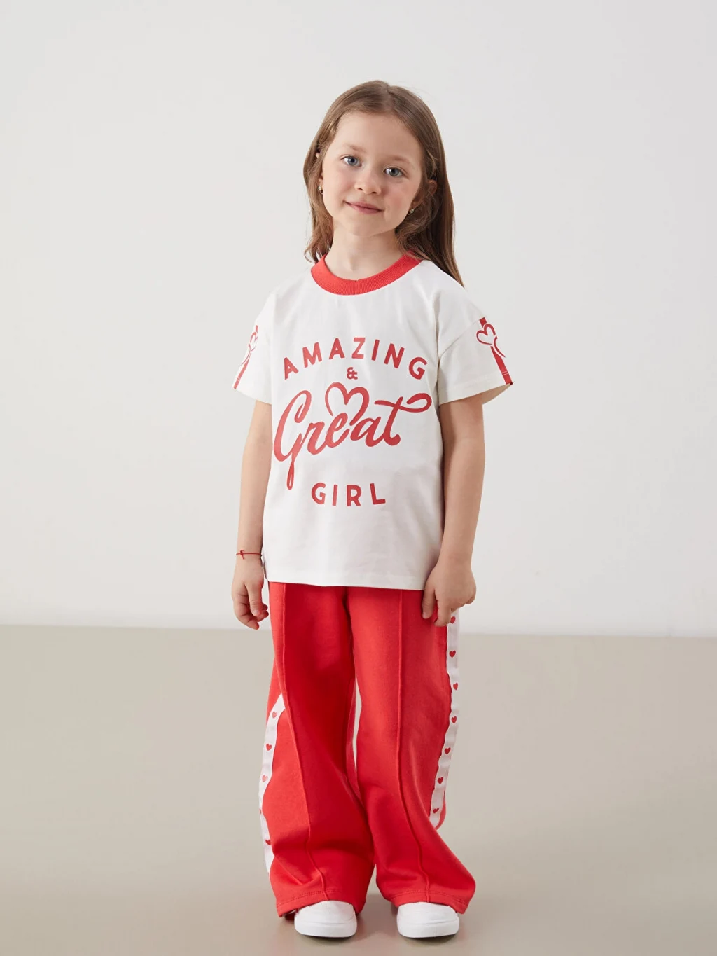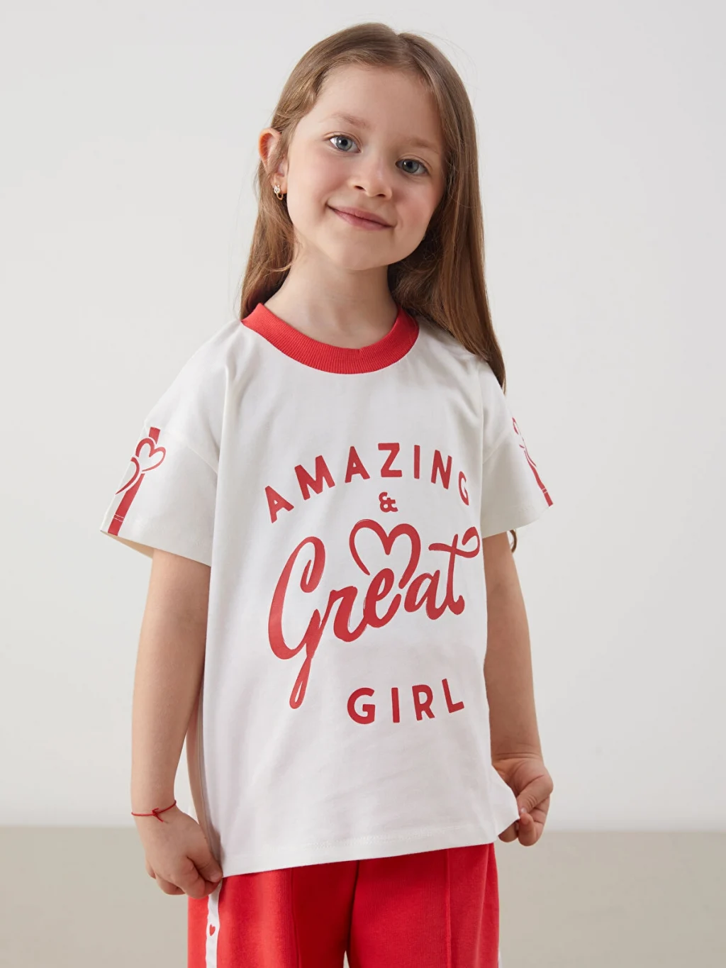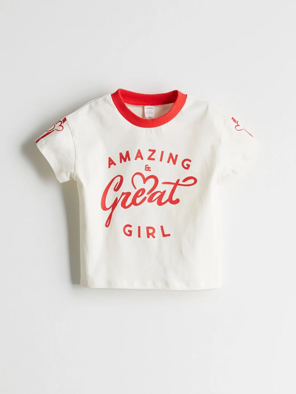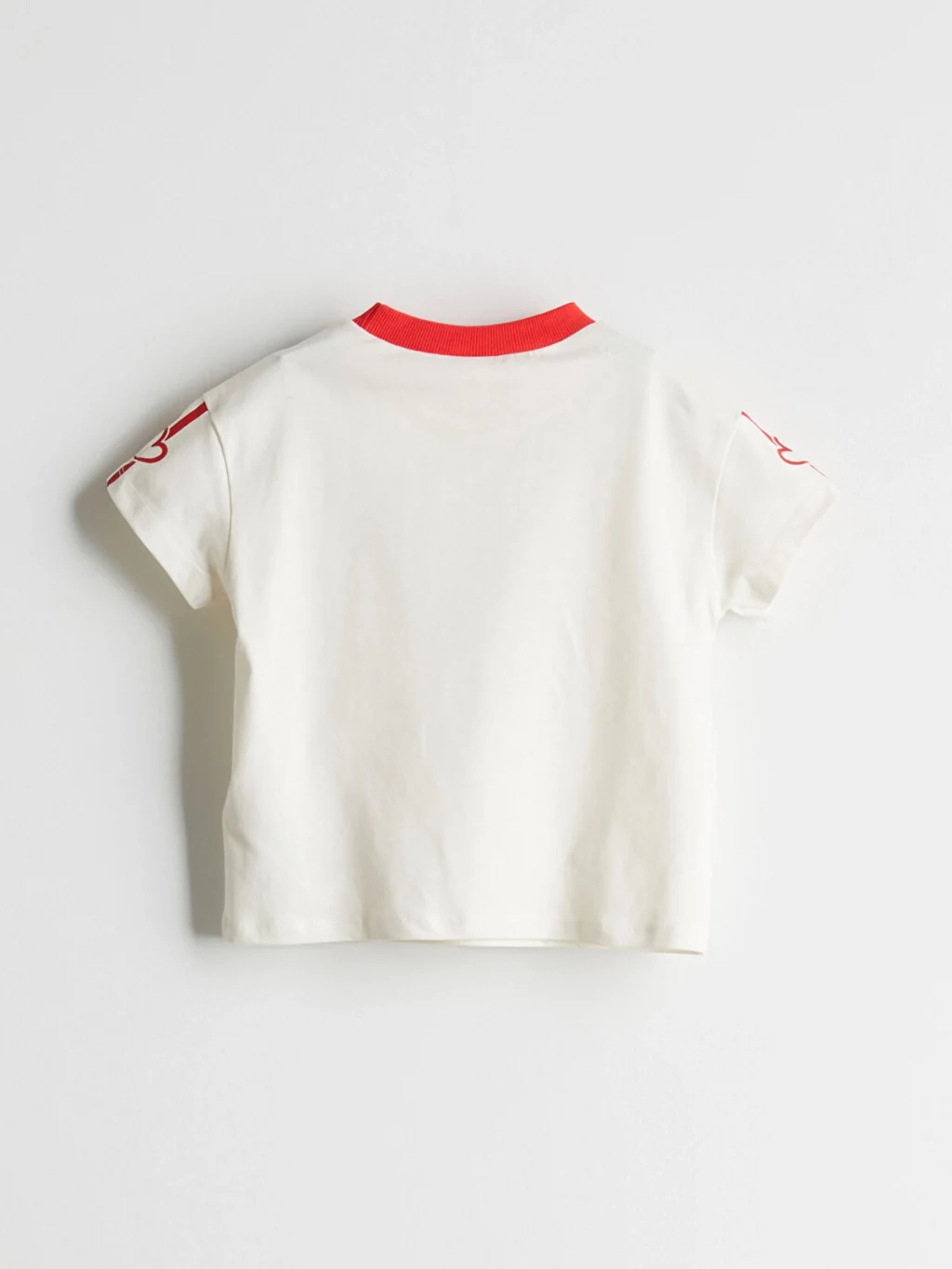 Kontrast renkli bisiklet yakalı, kısa kollu kız çocuk tişört. %100 pamuk penye kumaştan üretilmiştir, önü yazılı ve kolları desenlidir.