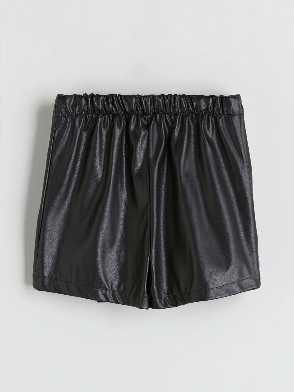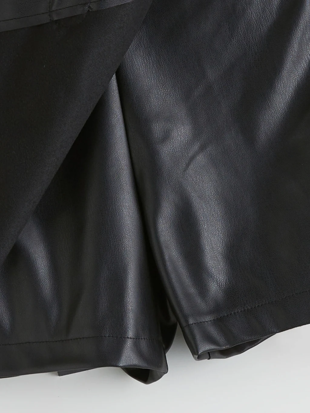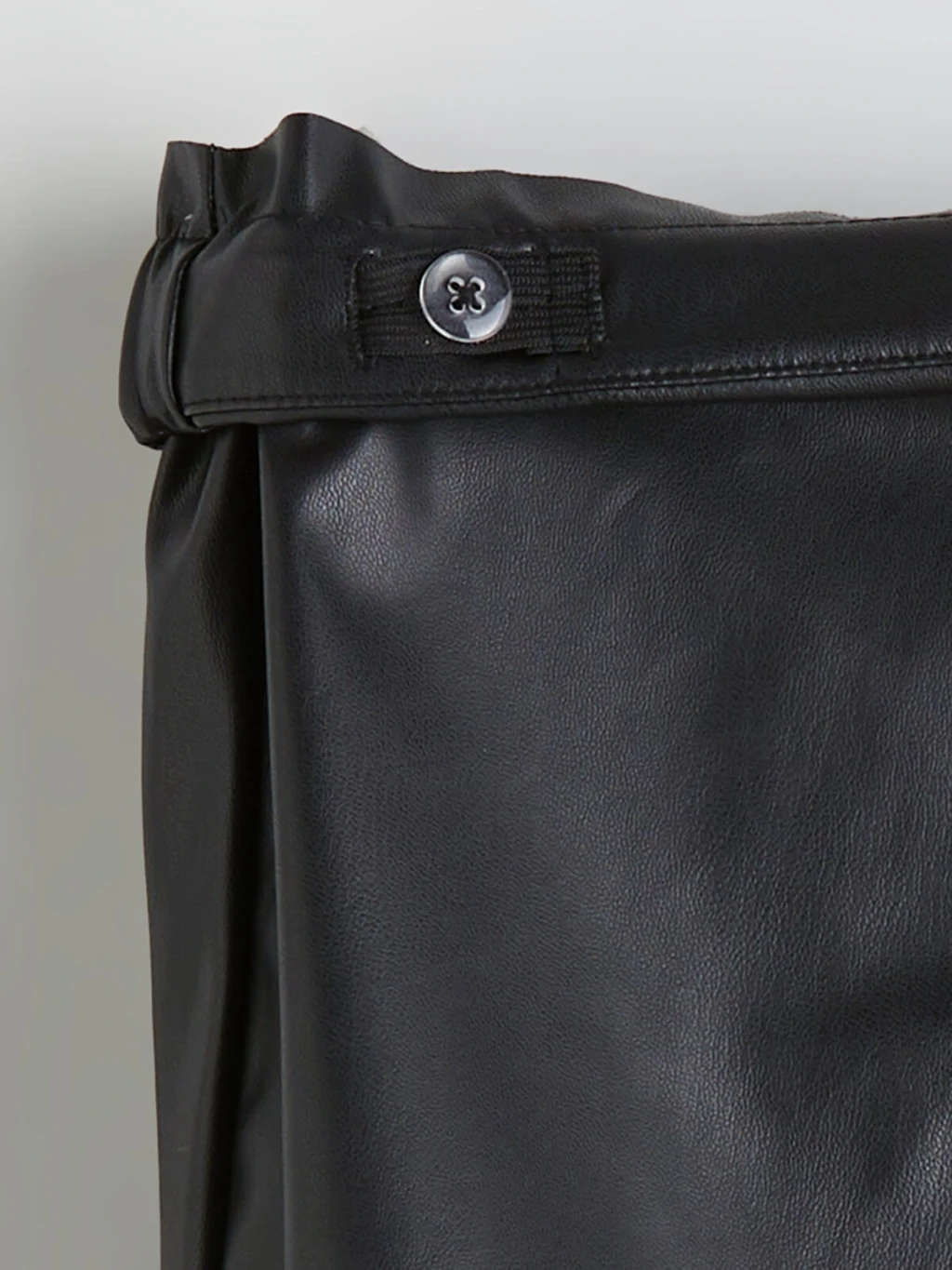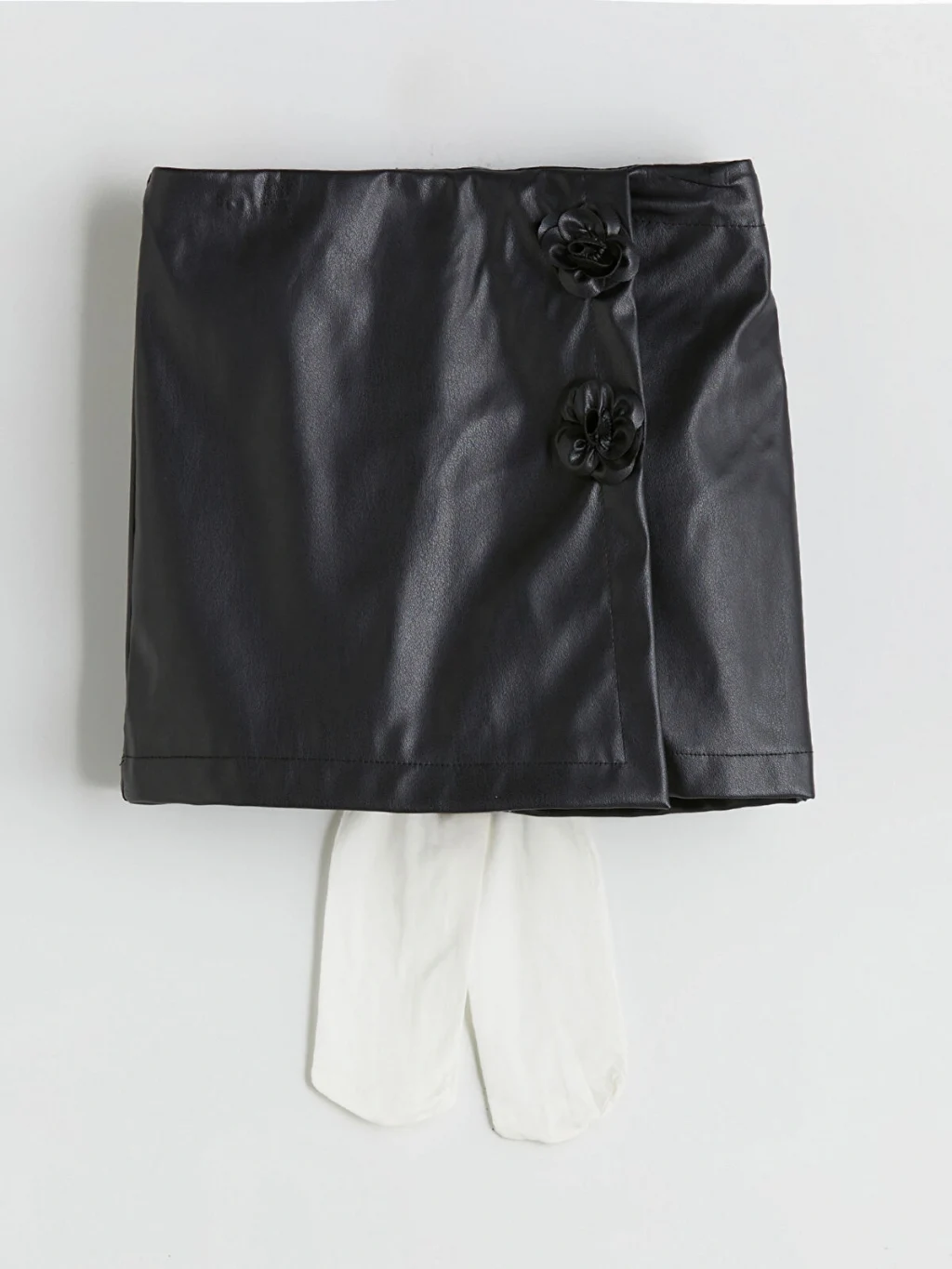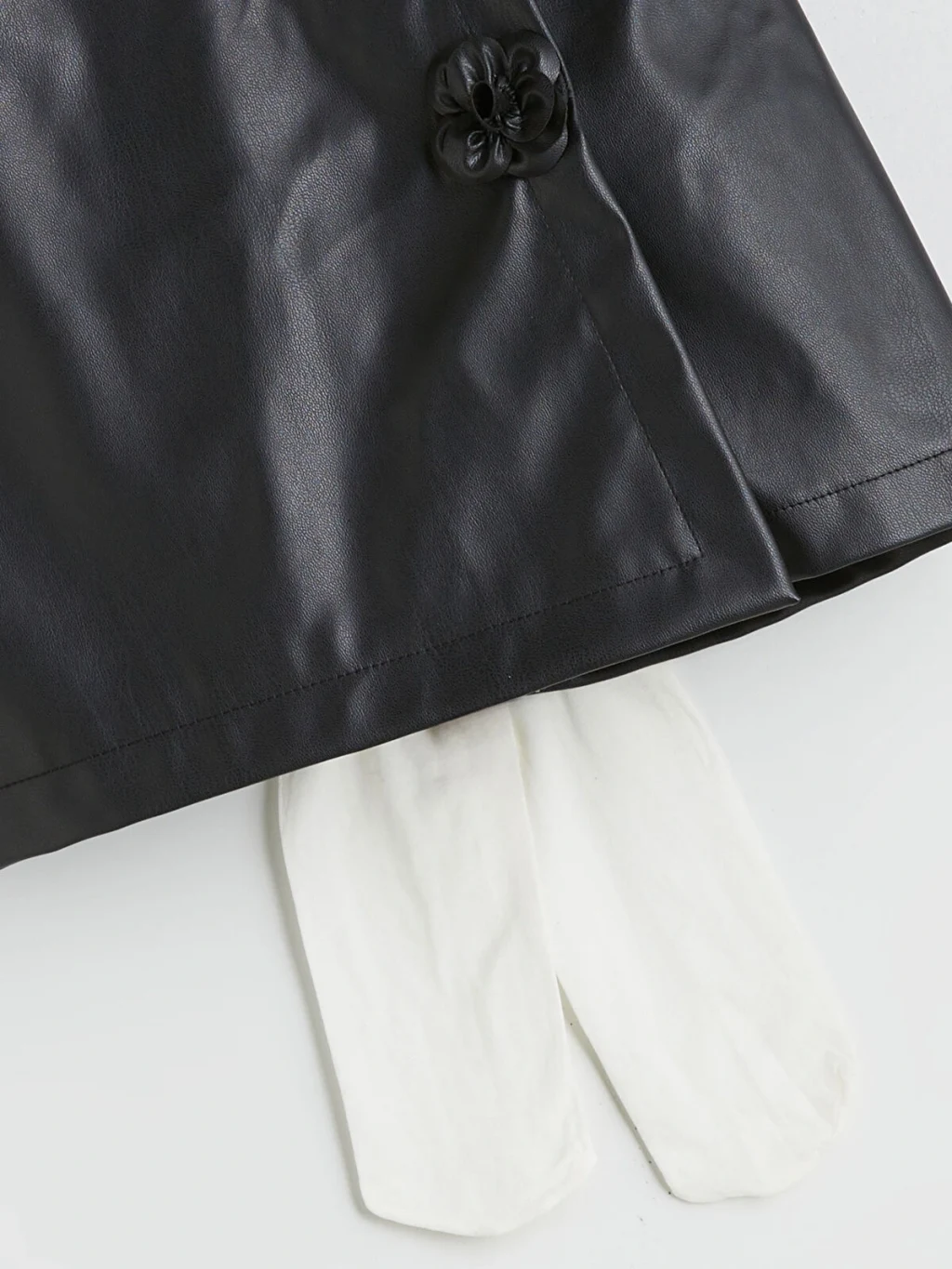 Anvelop kesimli kız çocuk etek, suni deri kumaştan üretilmiştir. Ön kısmında çiçek şeklinde dekoratif düğme detayı bulunur.