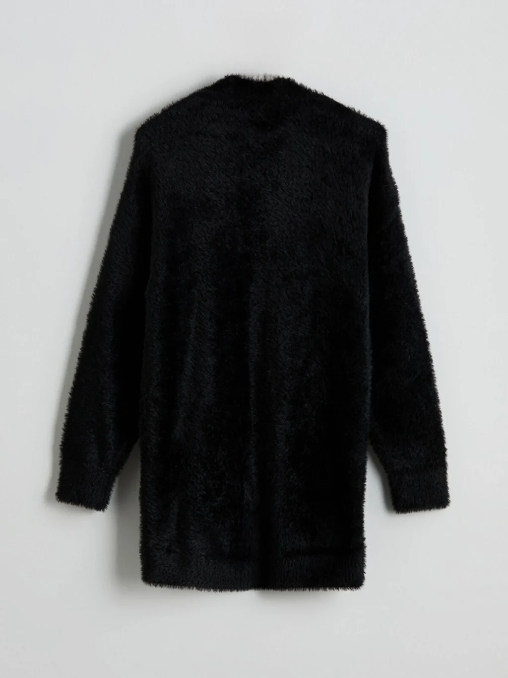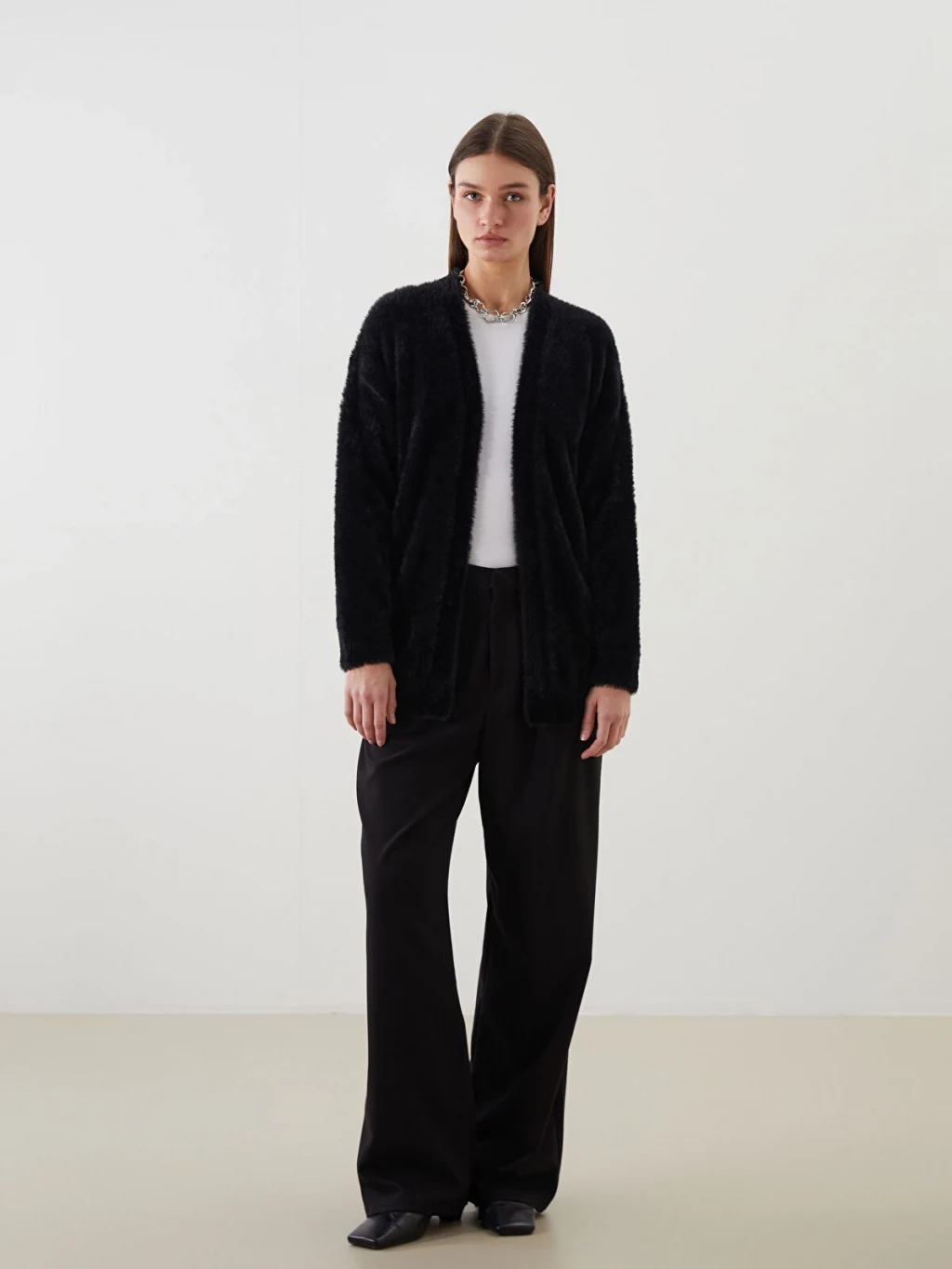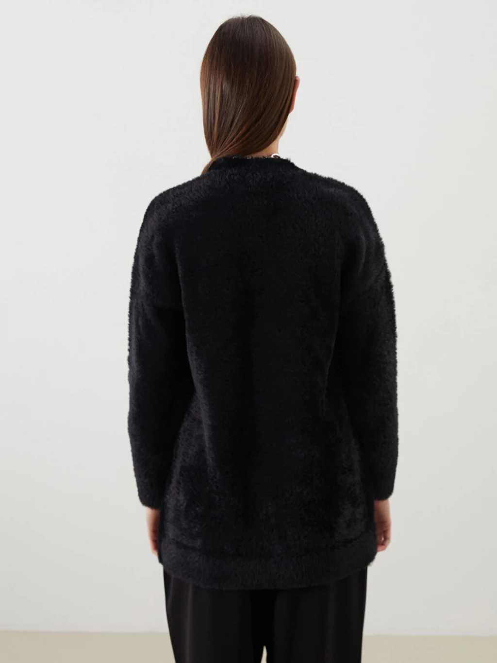 Şal yaka düz uzun kollu kadın hırka, pelüş triko kumaştan üretilmiştir.