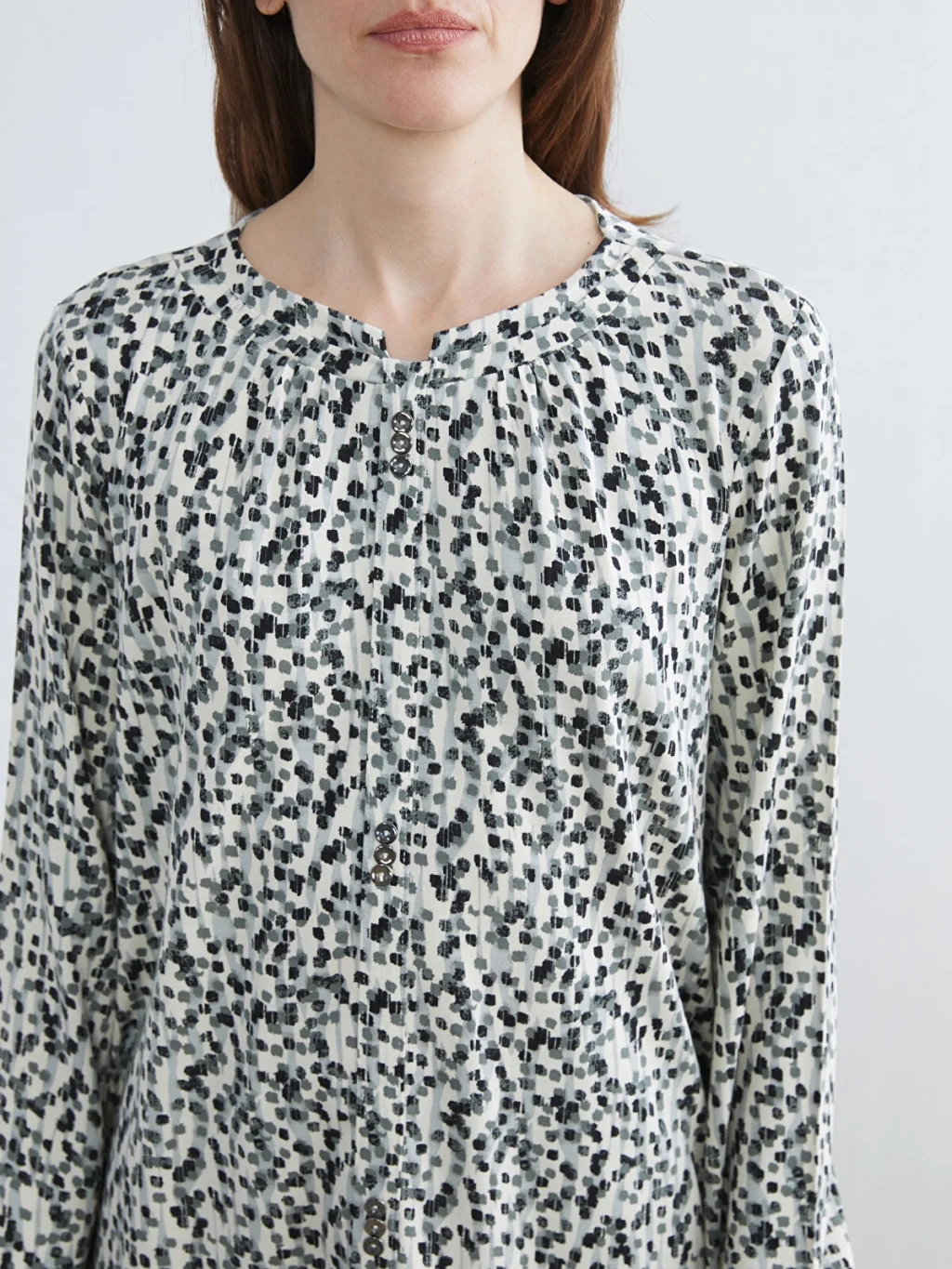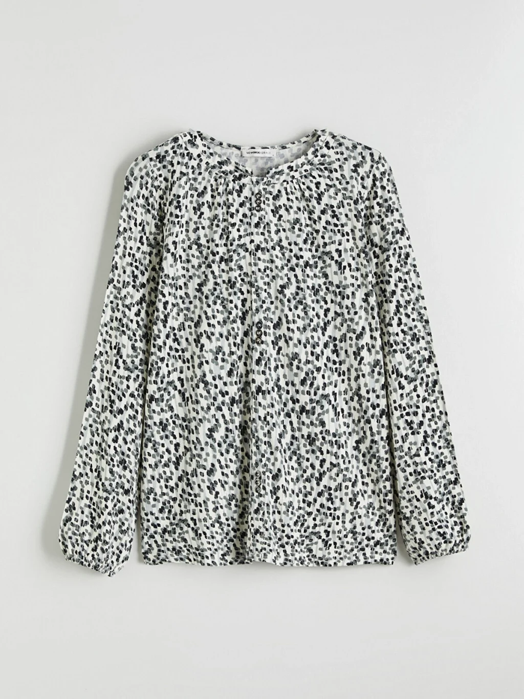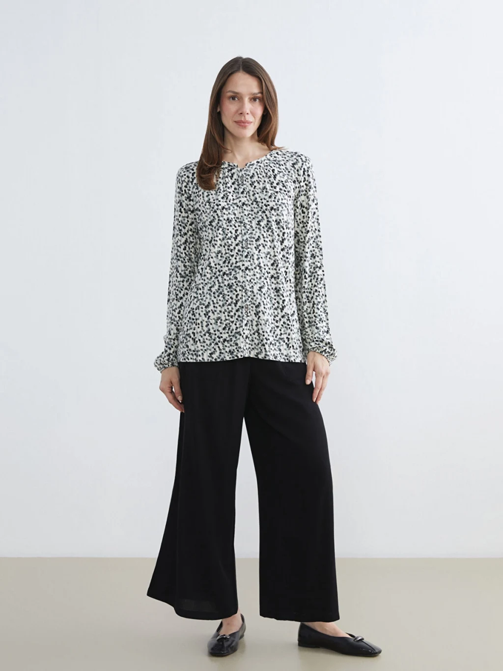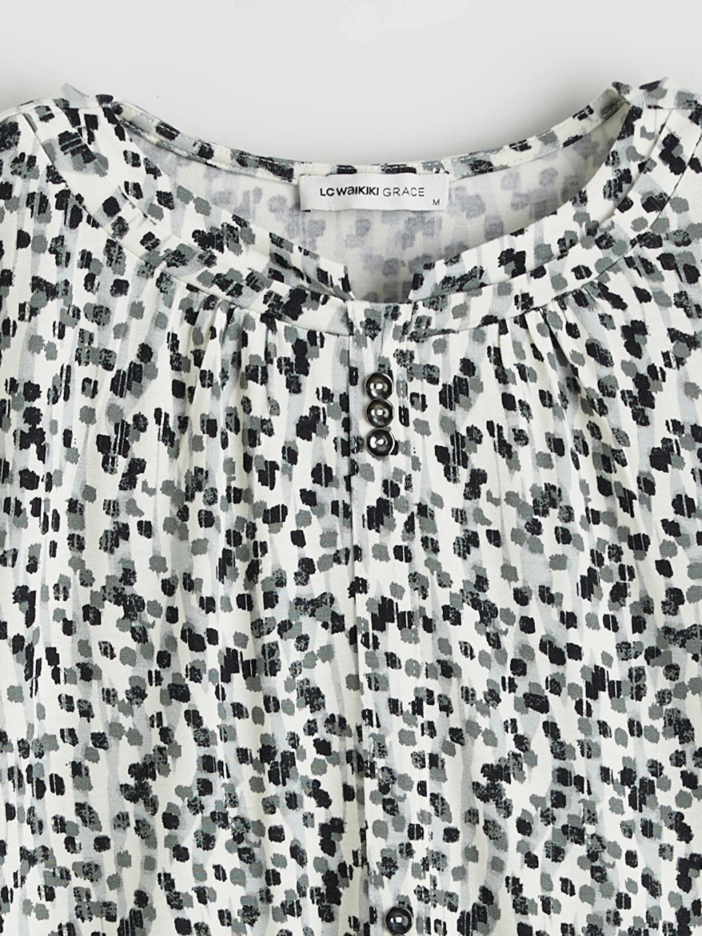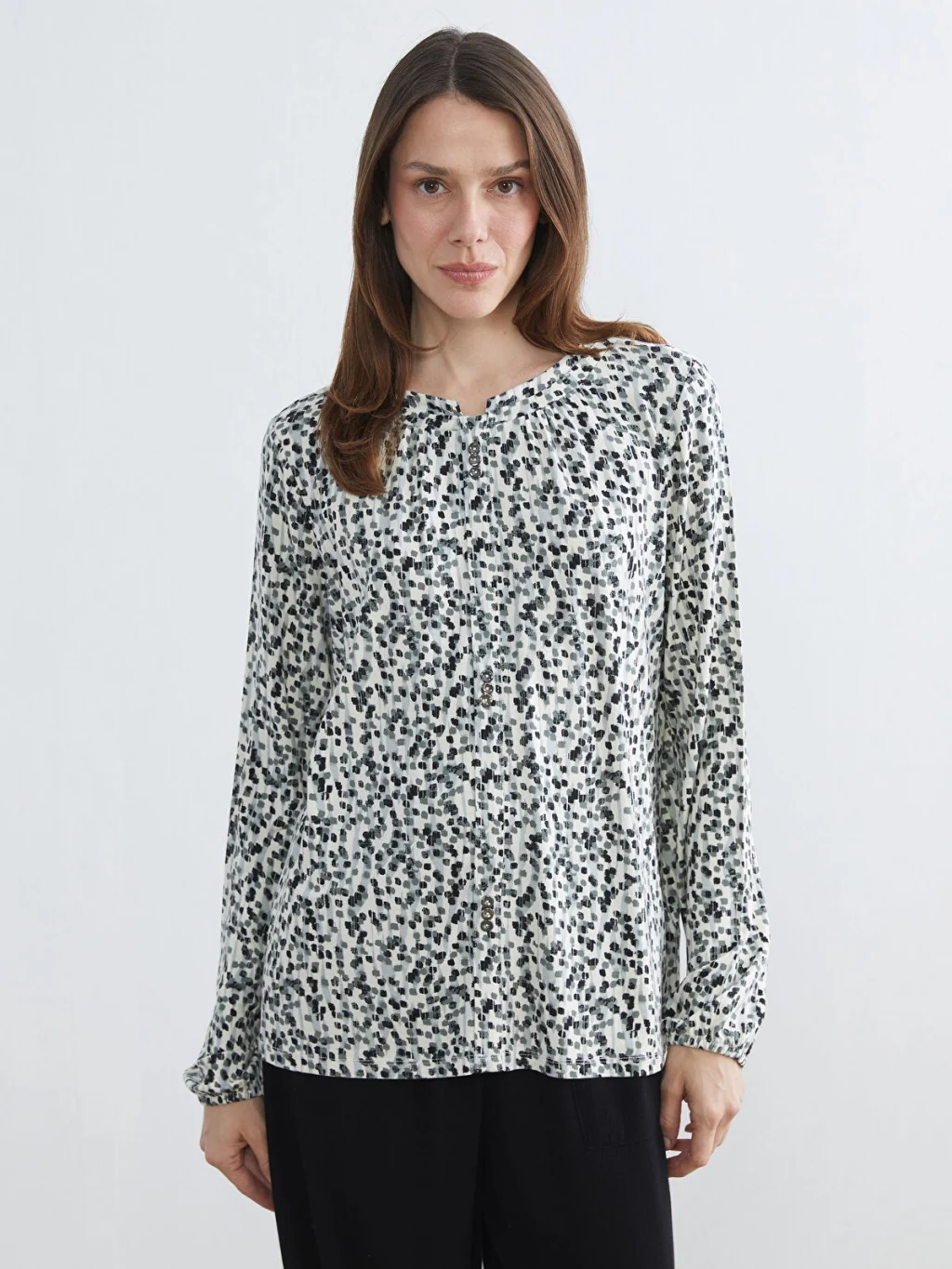 Standart kalıp, desenli kadın tişört, bisiklet yakalı ve uzun kolludur. Yaka kısmında büzgü detayı bulunur, kol uçları lastiklidir.