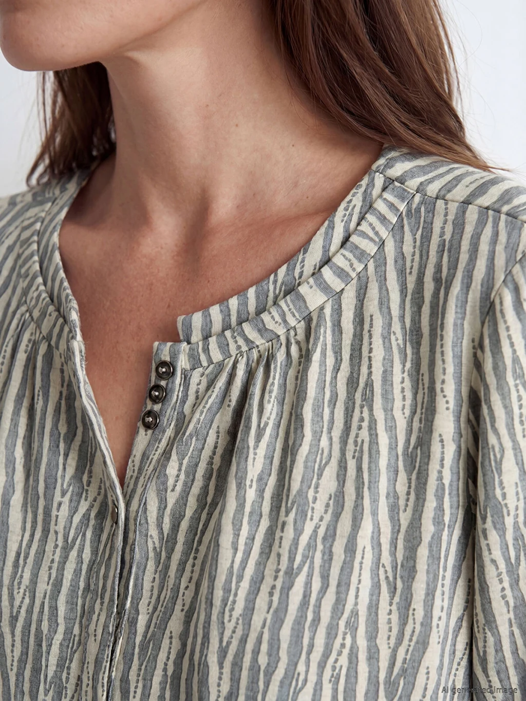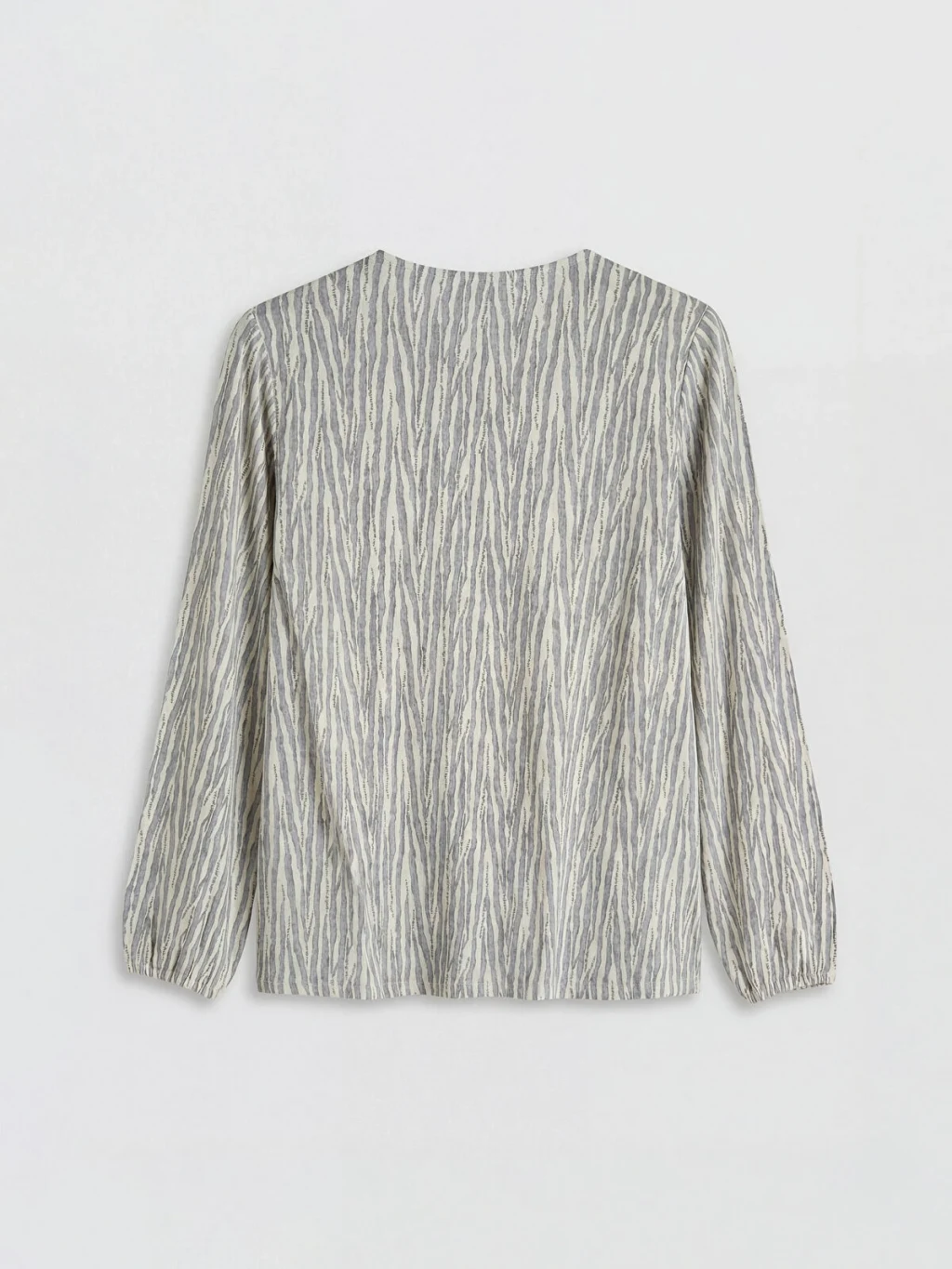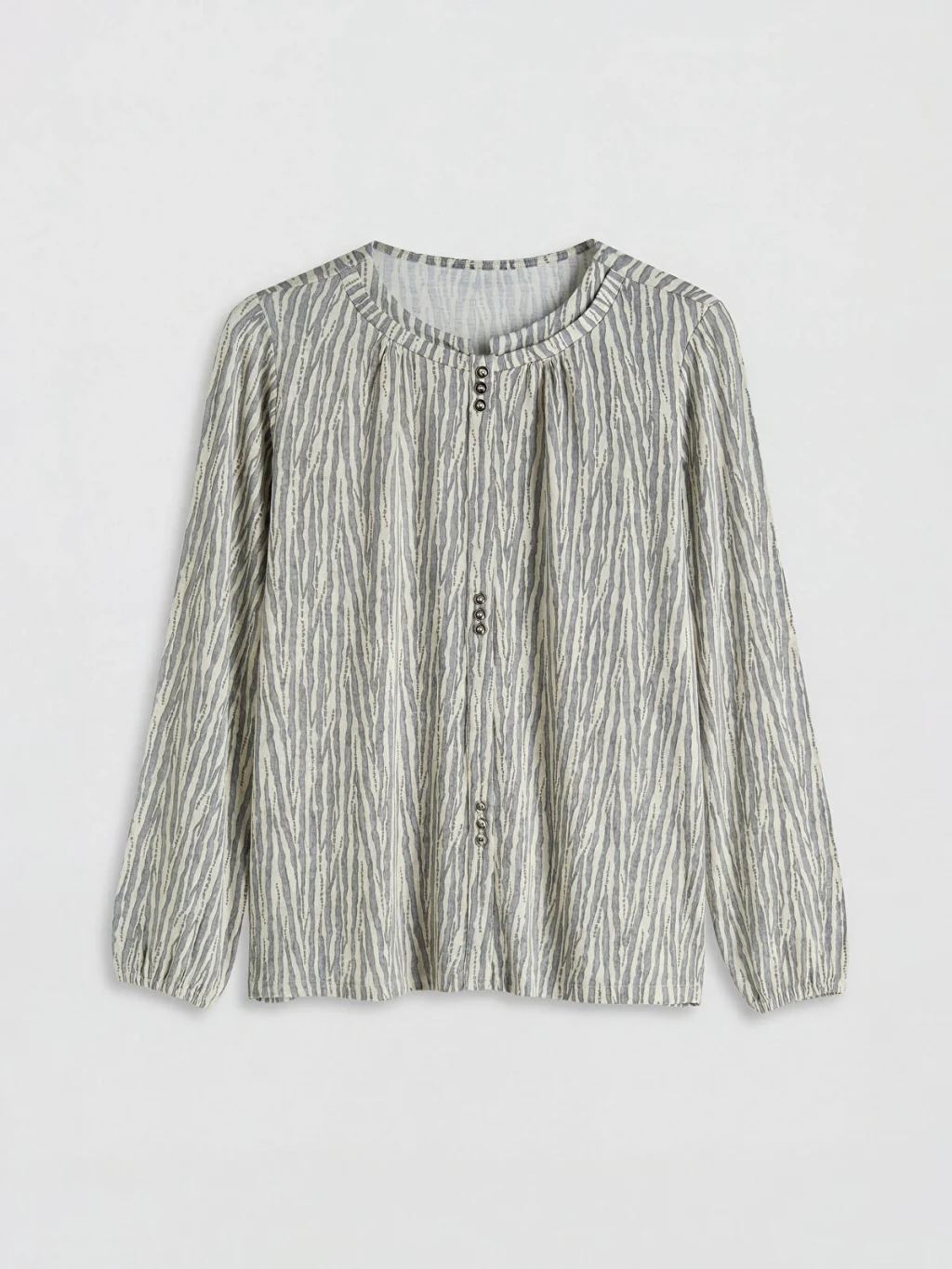 Bisiklet yaka, uzun kollu kadın bluz, desenli kumaştan üretilmiştir. Yaka kısmında büzgü detayları ve düğme kapaması bulunur.