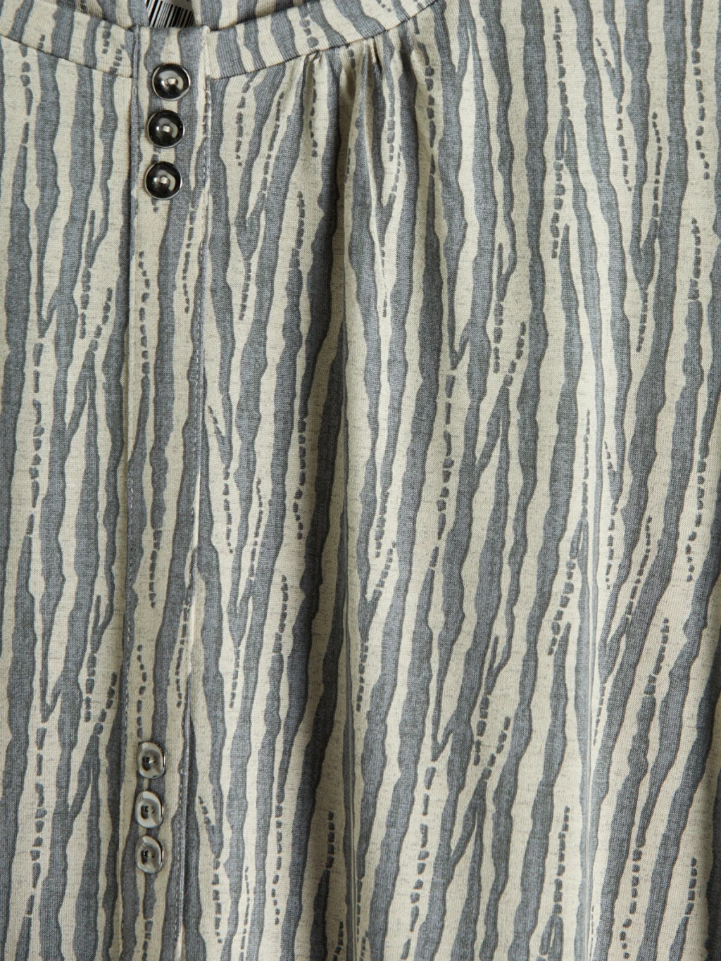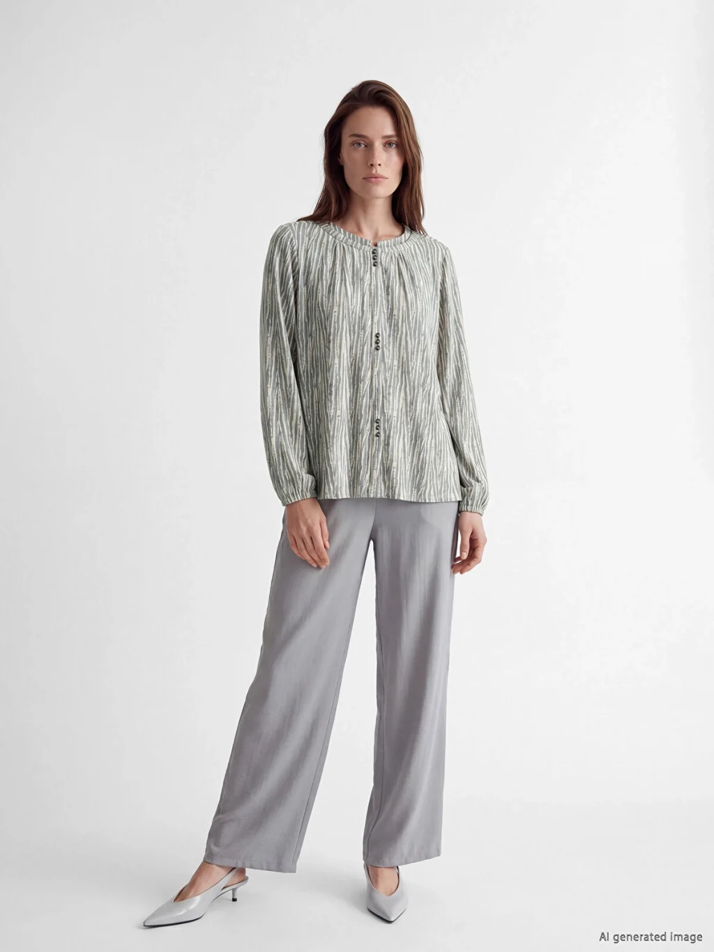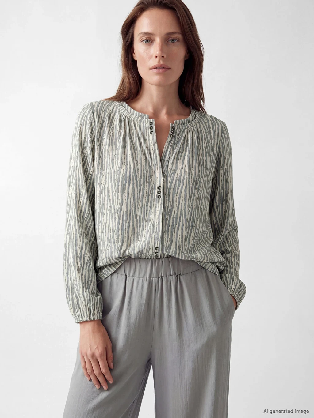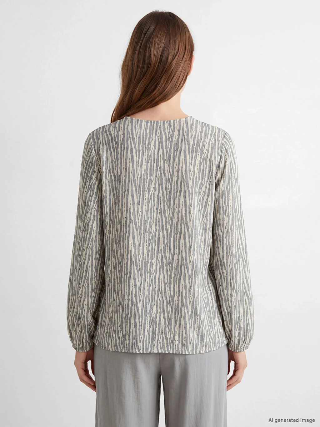 Bisiklet yaka, uzun kollu kadın bluz, desenli kumaştan üretilmiştir. Yaka kısmında büzgü detayları ve düğme kapaması bulunur.