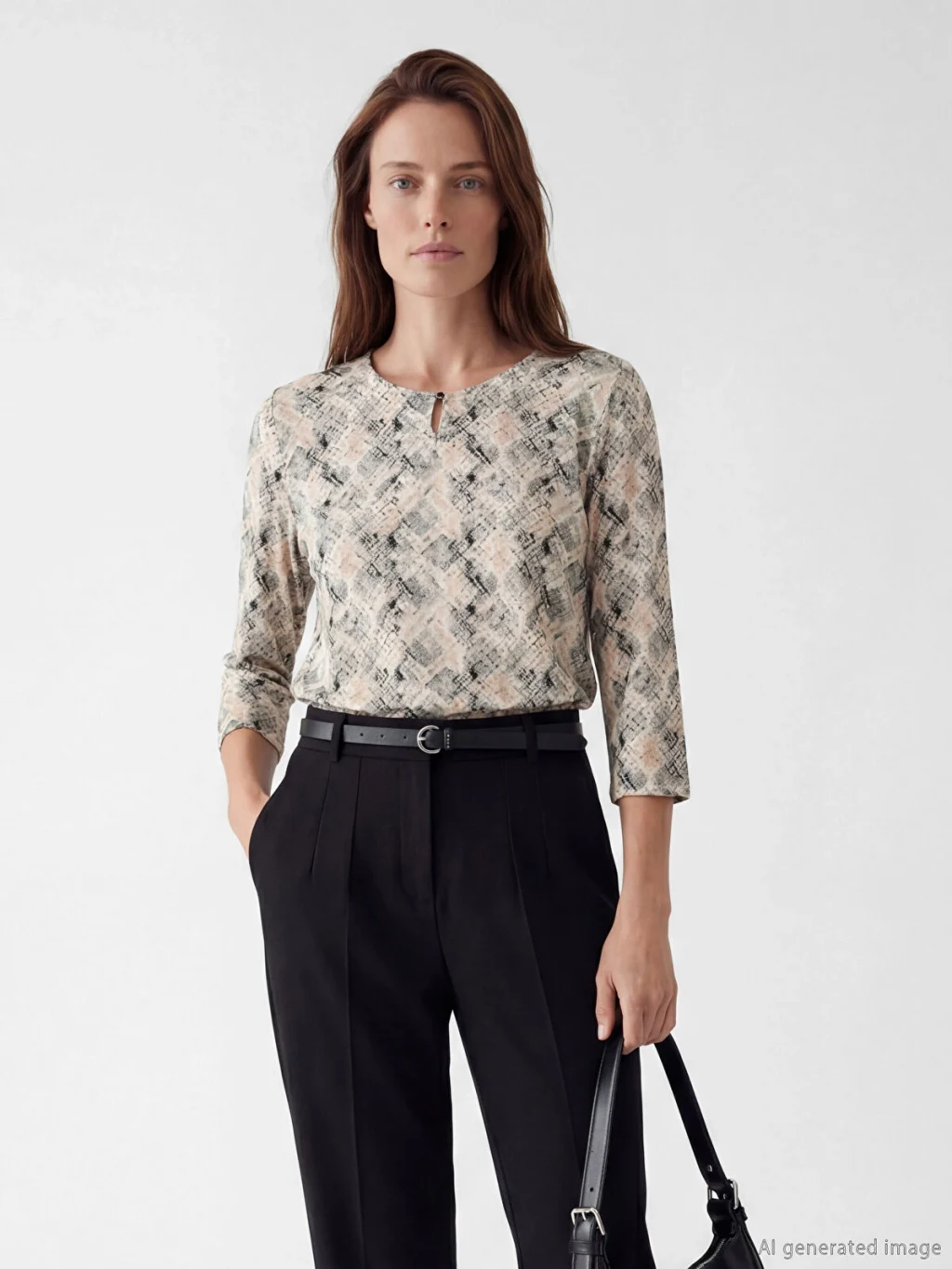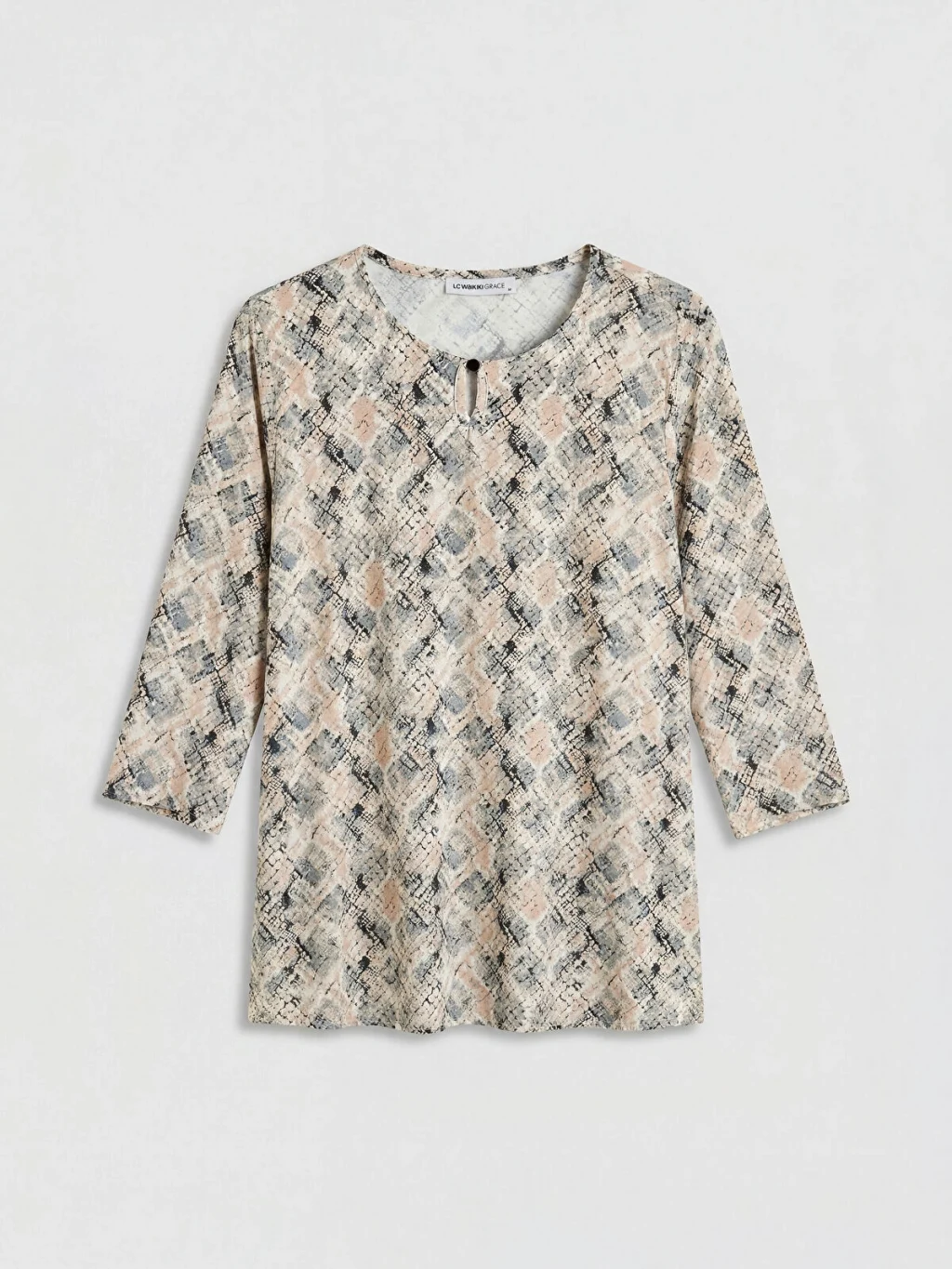 Bisiklet yakalı ve truvakar kollu kadın bluz, yaka kısmında bulunan yırtmaç ve düğme detayına sahiptir.