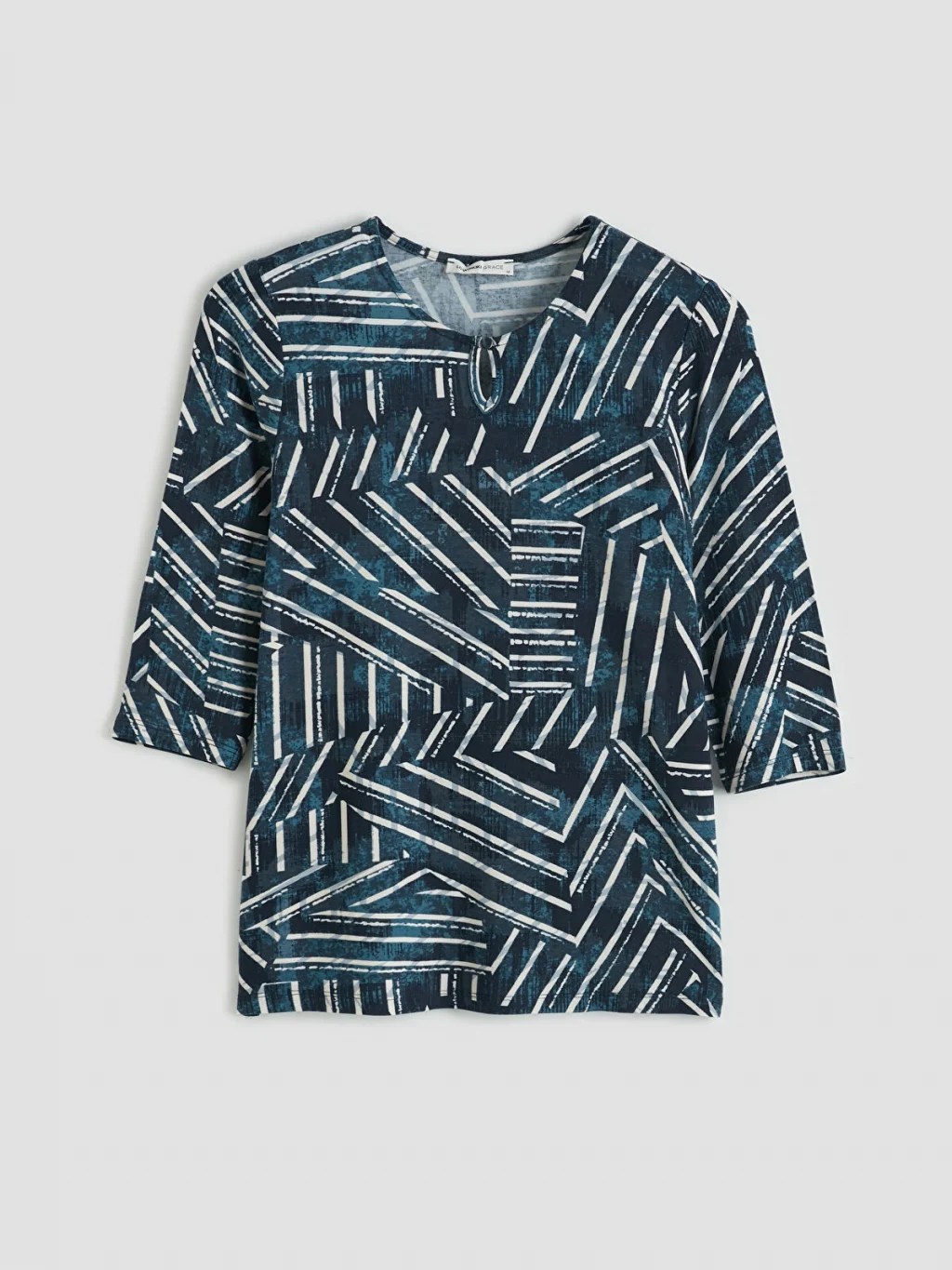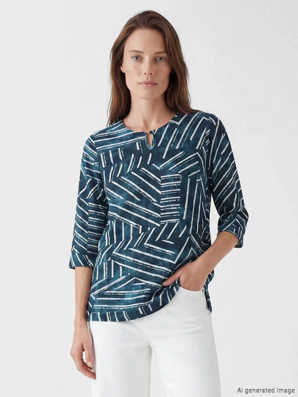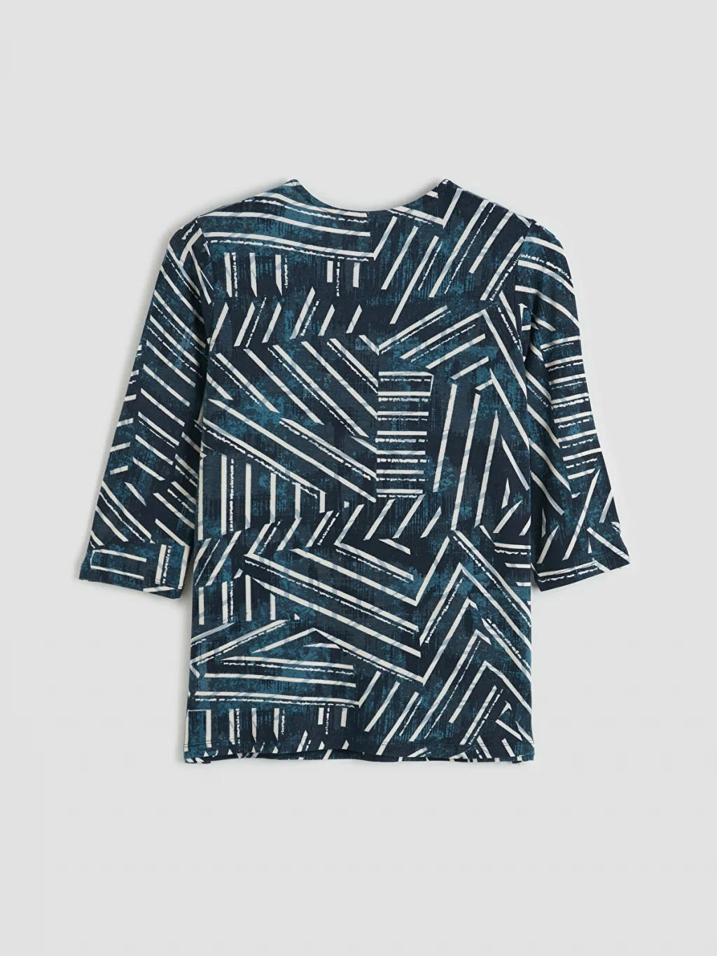 Bisiklet yakalı ve truvakar kollu kadın bluz, yaka kısmında bulunan yırtmaç ve düğme detayına sahiptir.