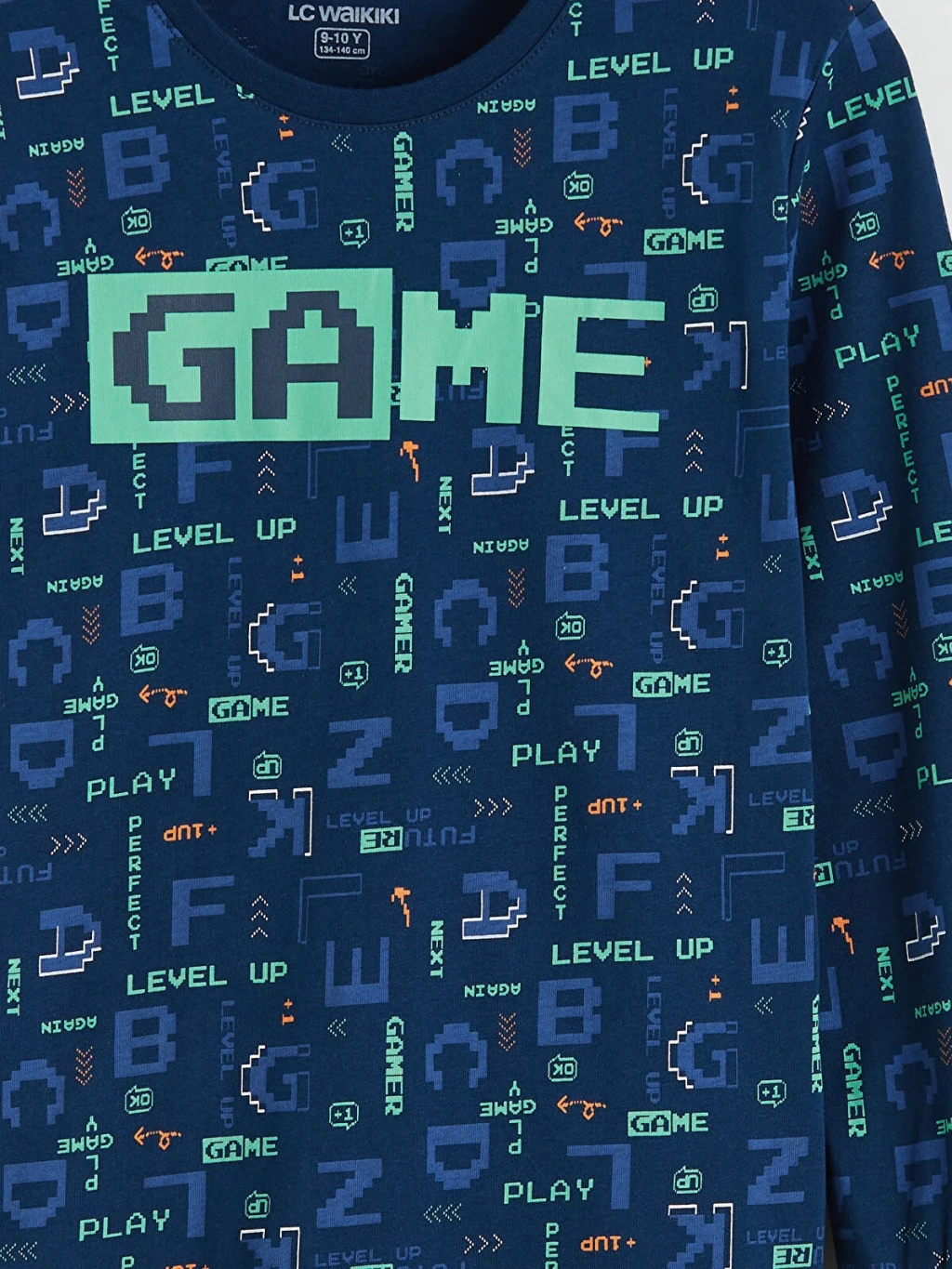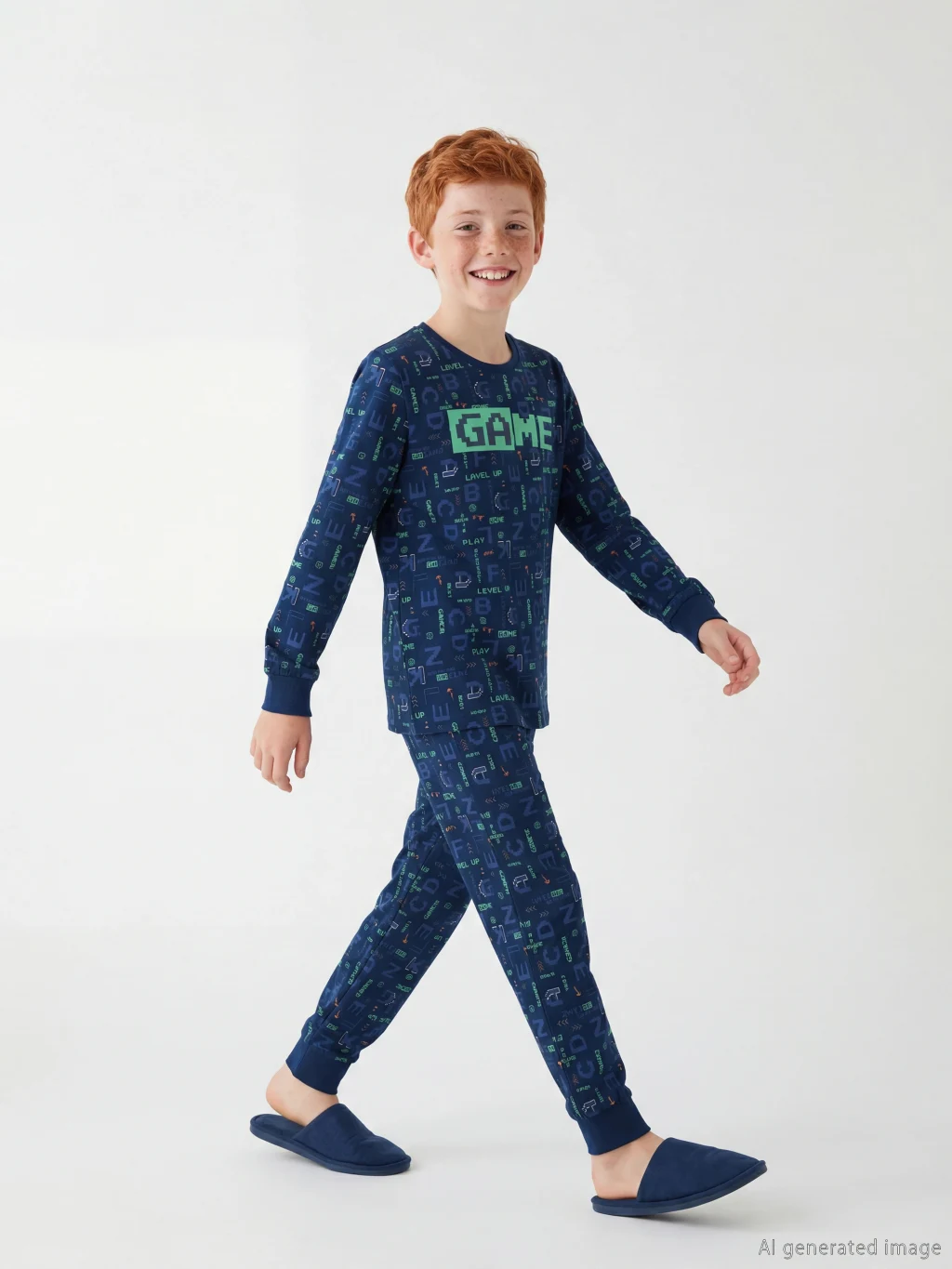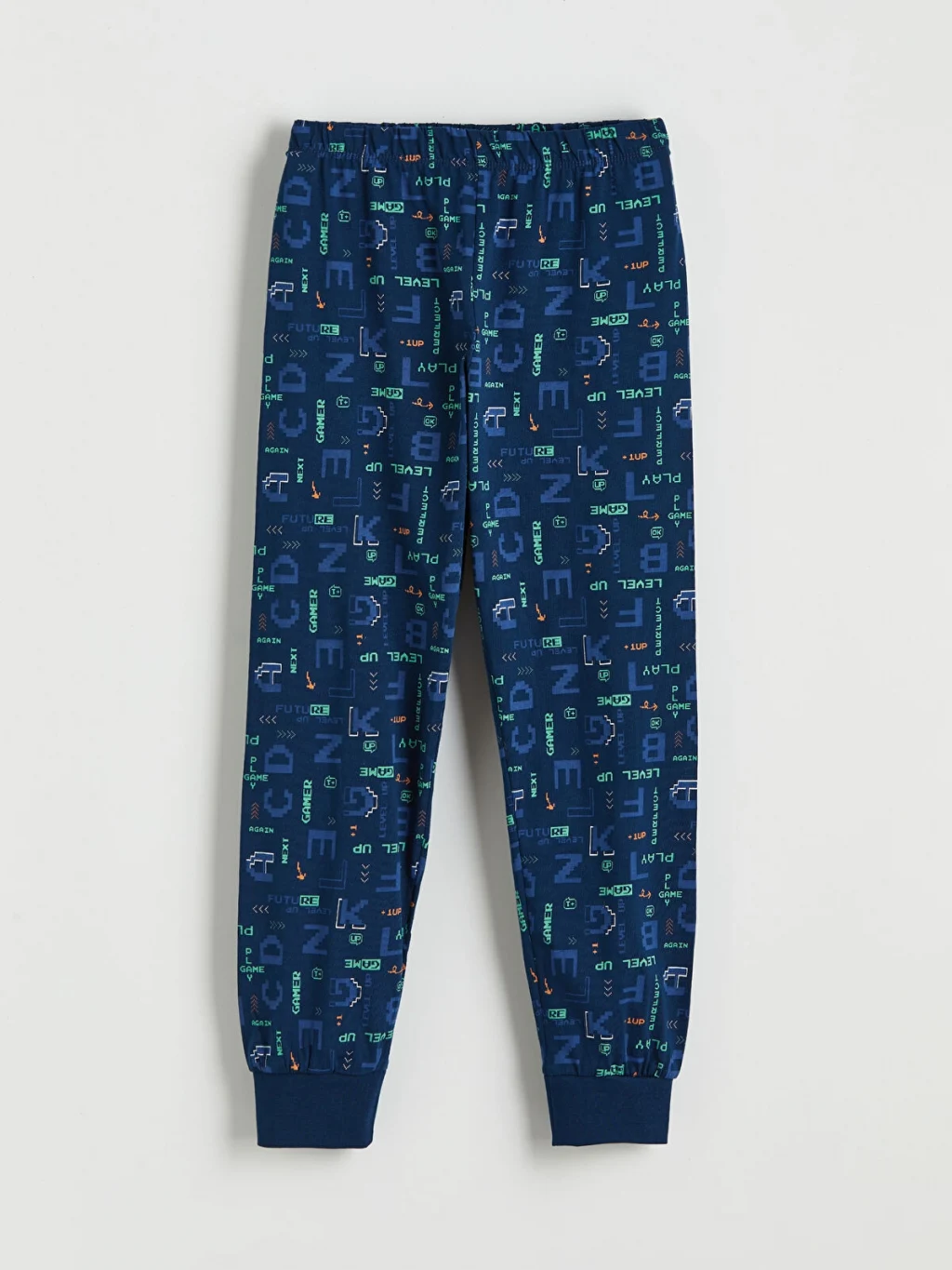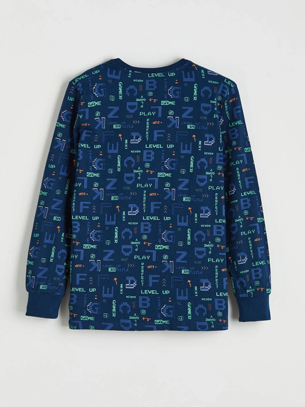 Pamuklu penye kumaştan üretilmiş erkek çocuk pijama takımı, bisiklet yaka, uzun kollu üst ve paçaları ribanalı alttan oluşur.