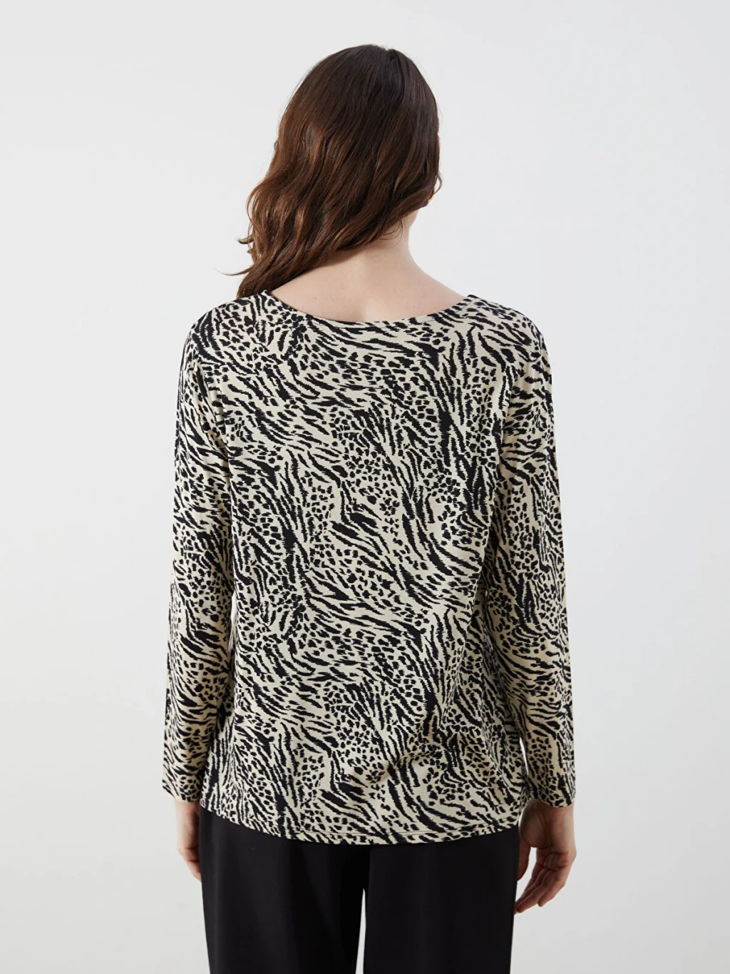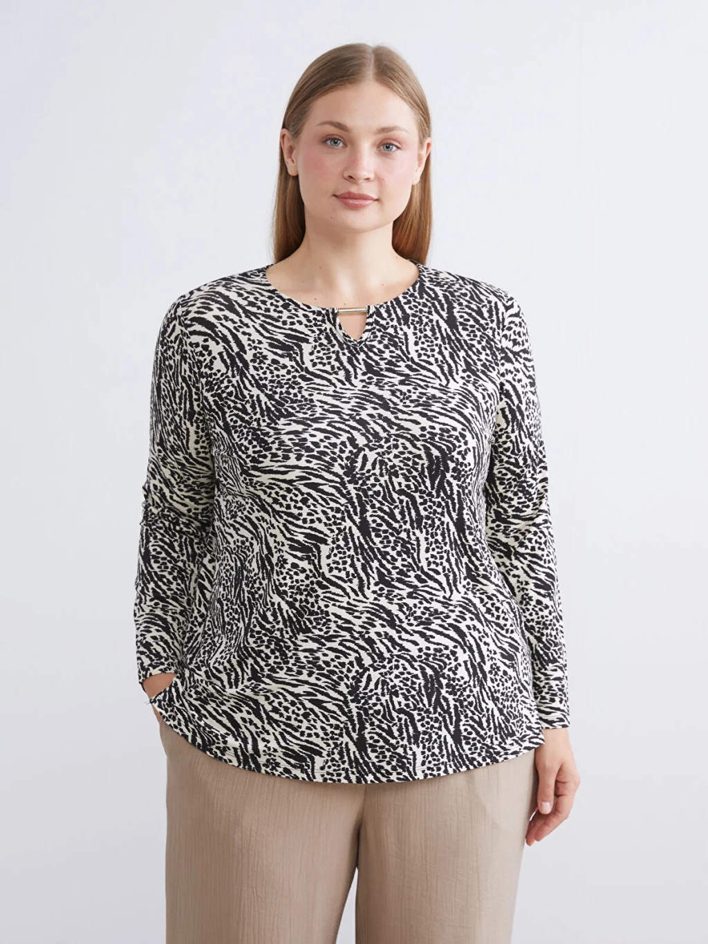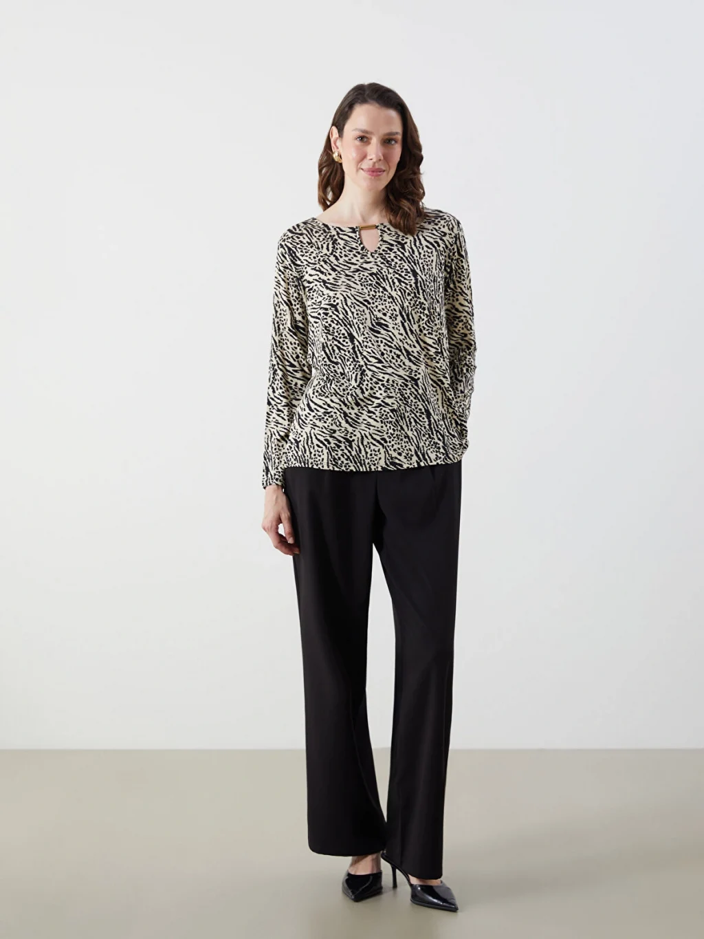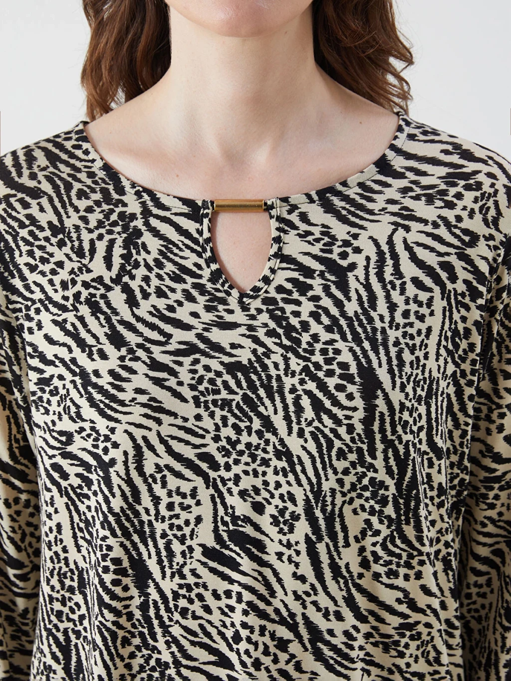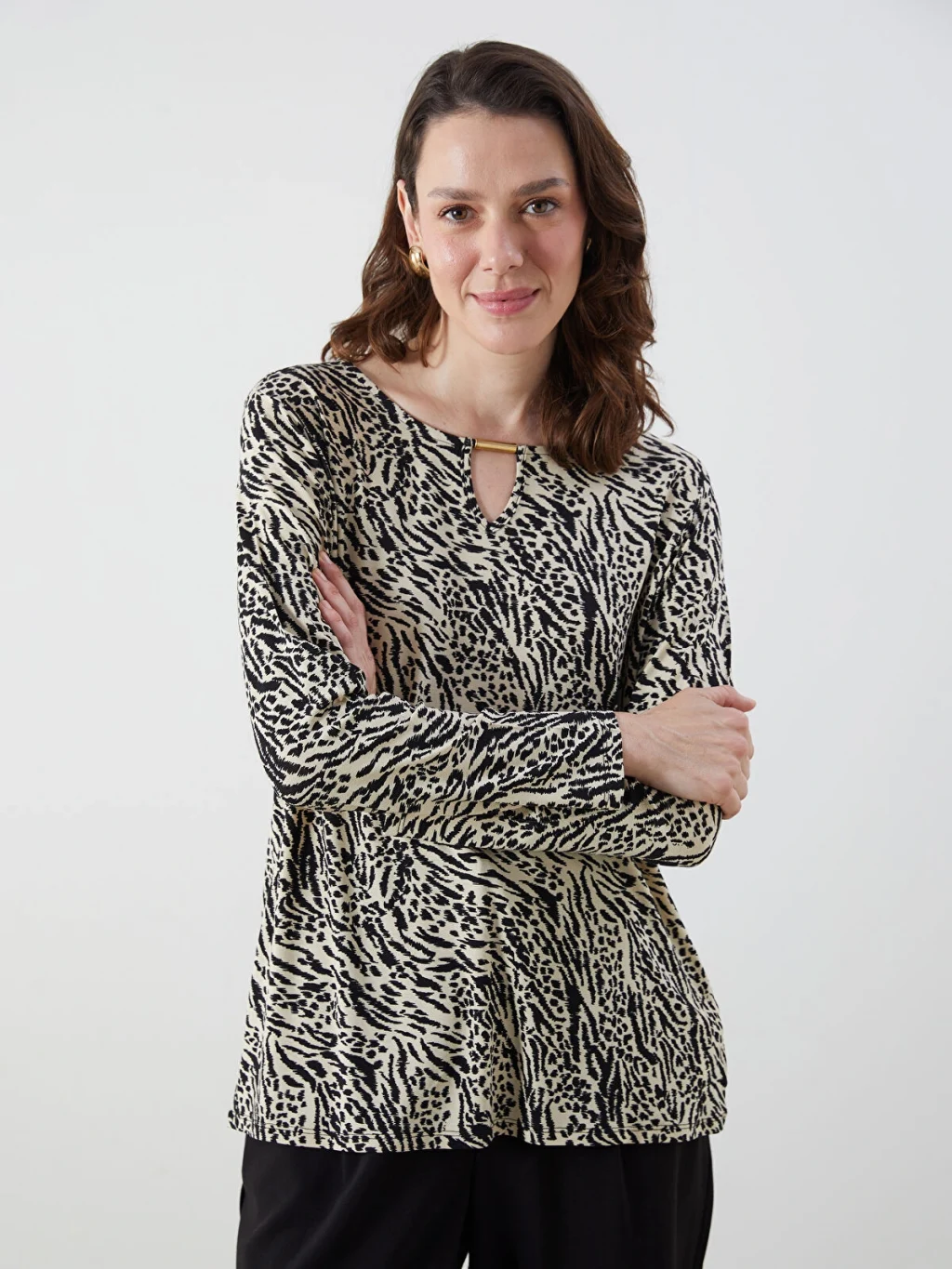 Bisiklet yaka desenli bluz, süprem kumaştan üretilmiştir. Hafif ve nefes alabilen yapısı ile gün boyu konfor sunar. Yakasında metalik aplike bulunur.
