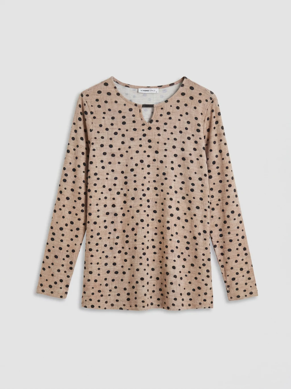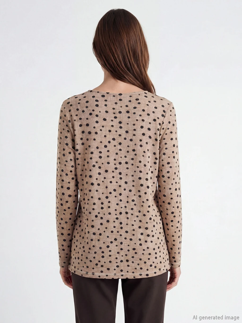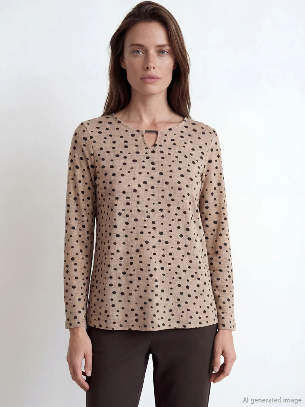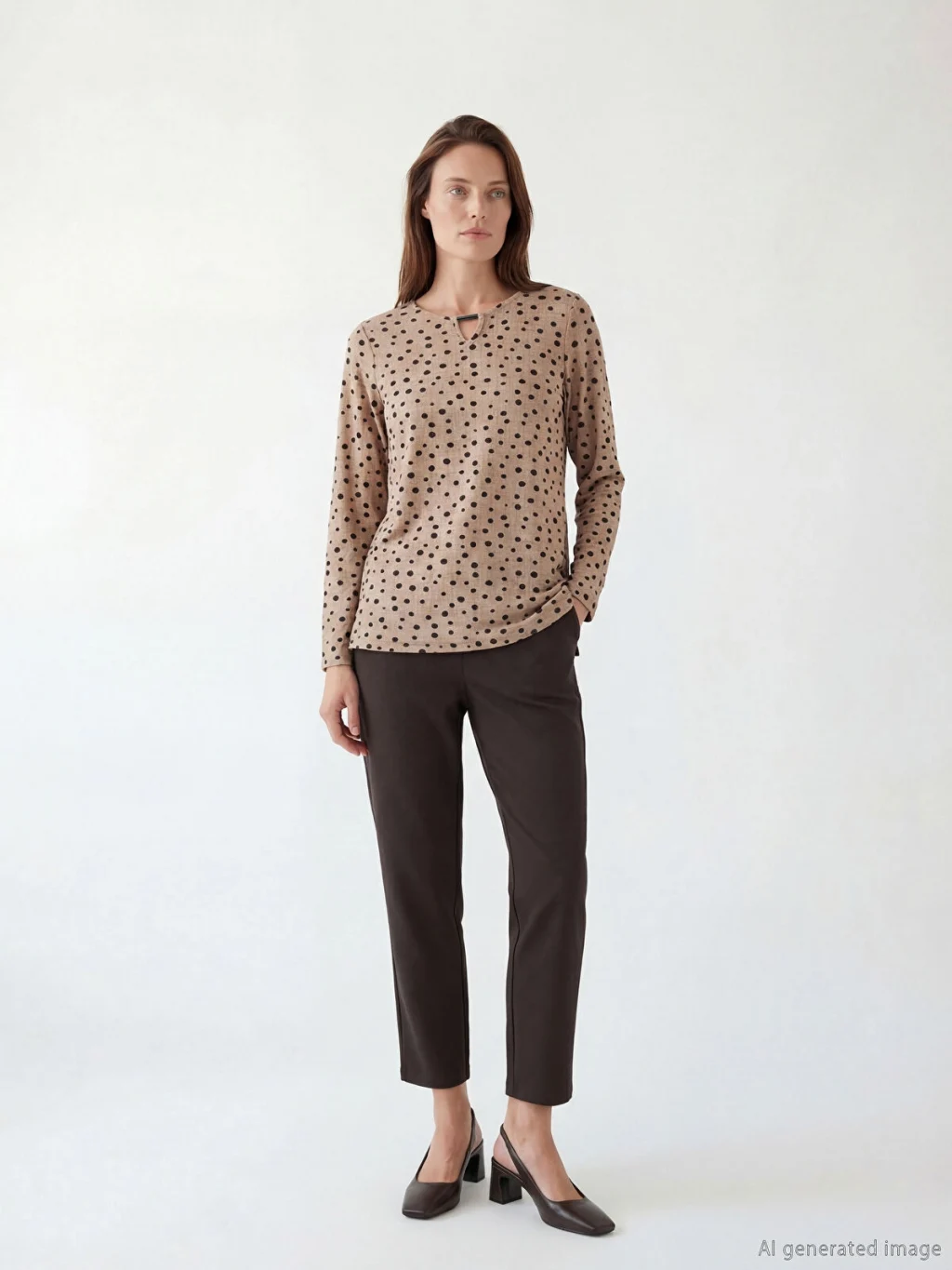 Puantiyeli kadın bluz, standart kalıplıdır. Bisiklet yaka modelinin ön kısmında yırtmaç detayı bulunur ve uzun kolludur.