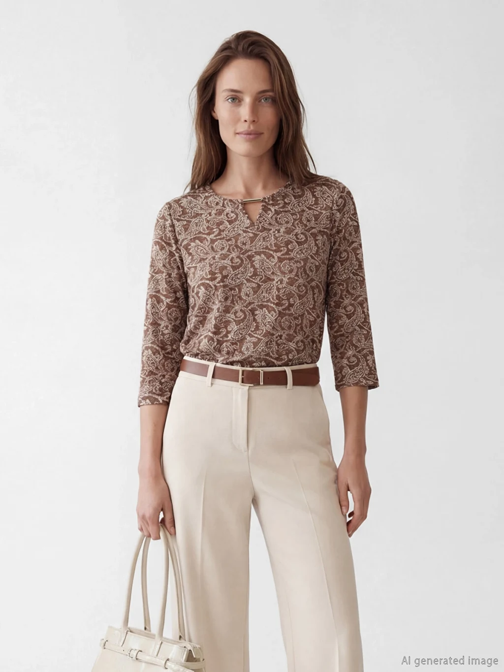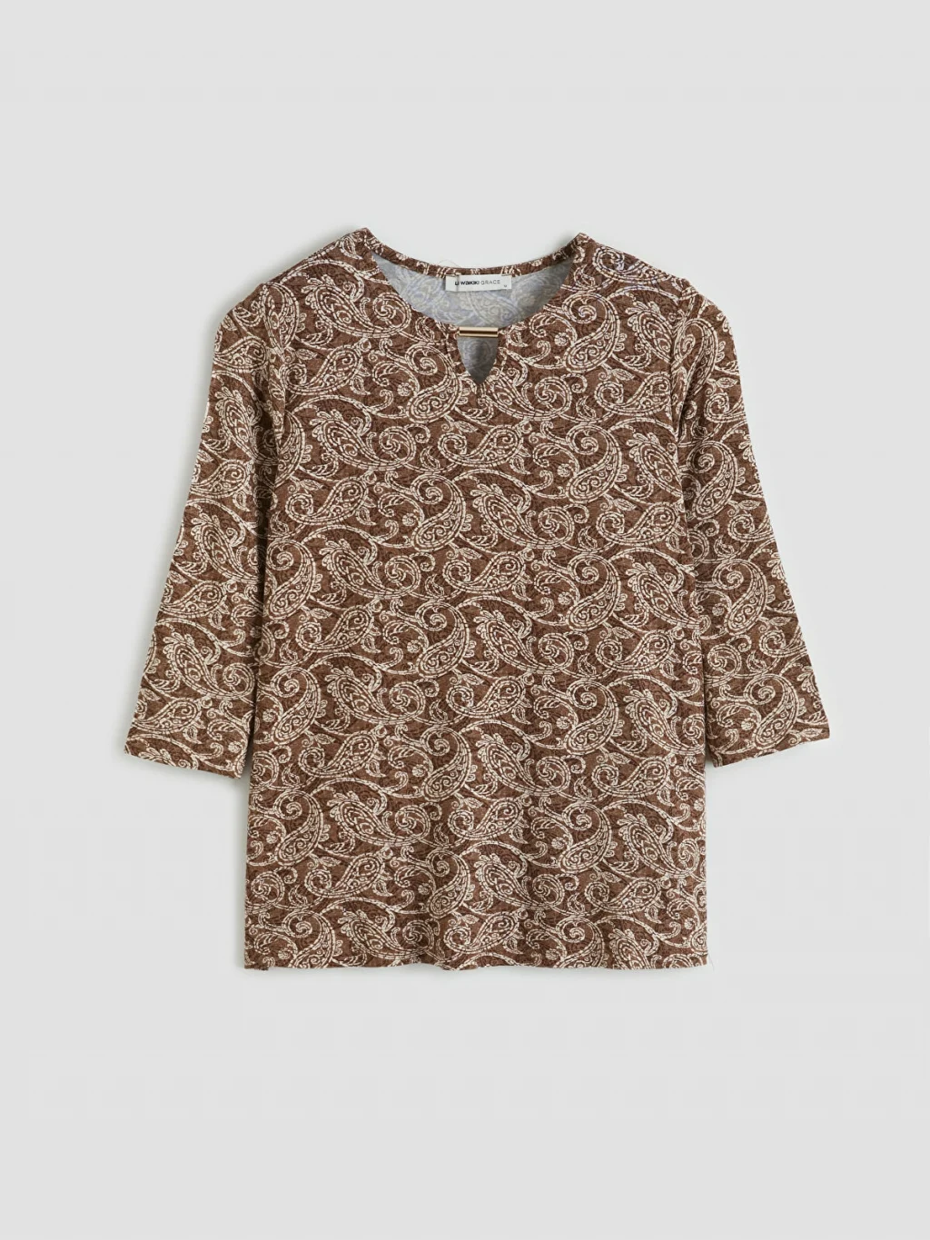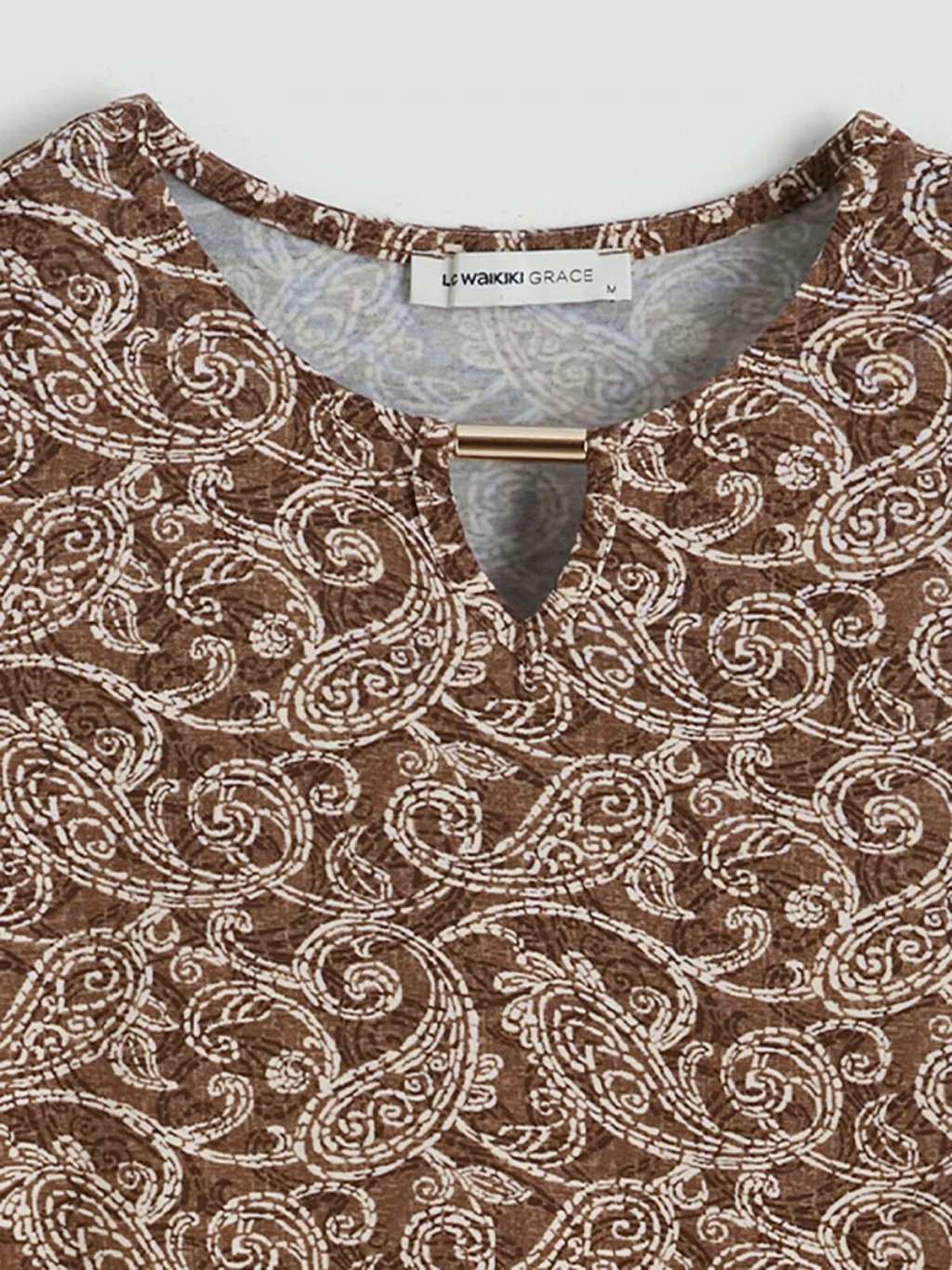 Standart kalıp kadın bluz, bisiklet yakalı ve truvakar kolludur. Tamamı desenli kumaşa sahiptir ve yaka kısmında metal aksesuar detayı bulunur.