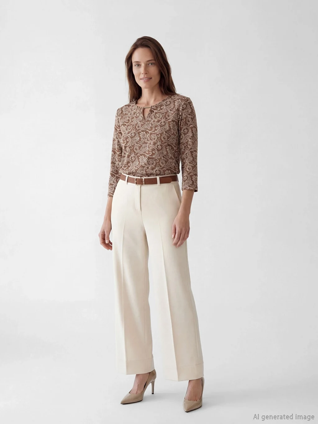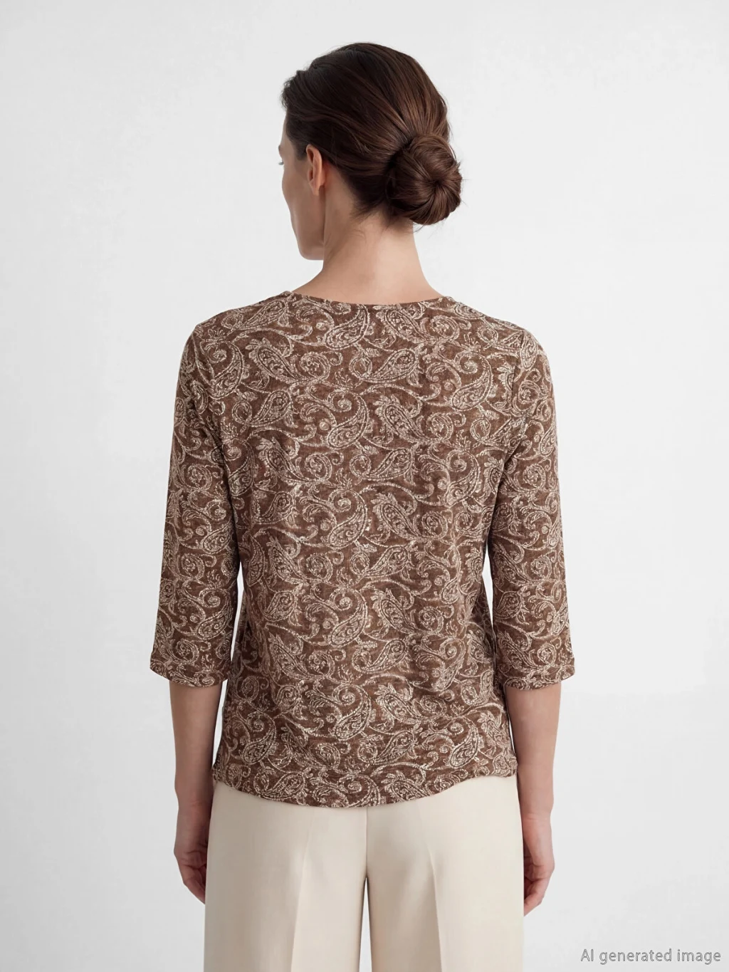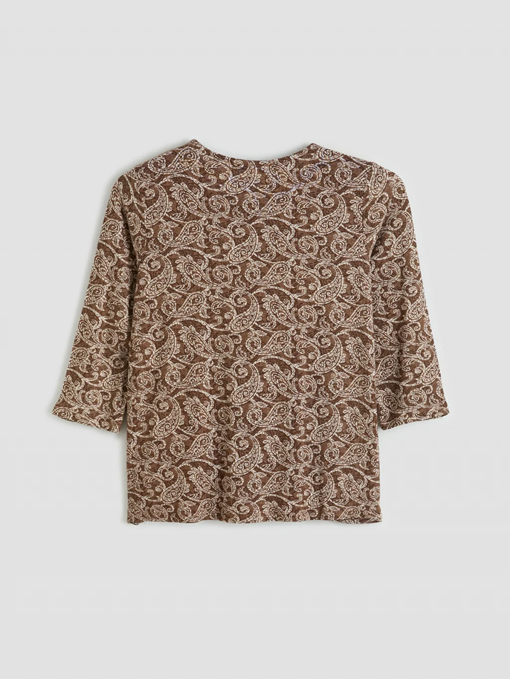 Standart kalıp kadın bluz, bisiklet yakalı ve truvakar kolludur. Tamamı desenli kumaşa sahiptir ve yaka kısmında metal aksesuar detayı bulunur.