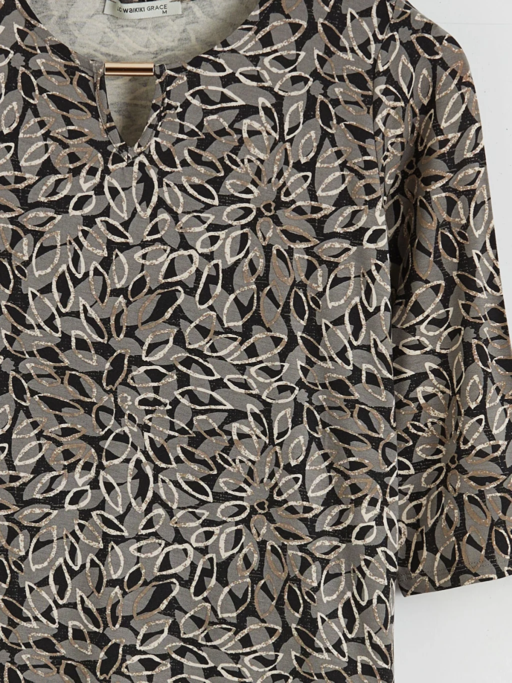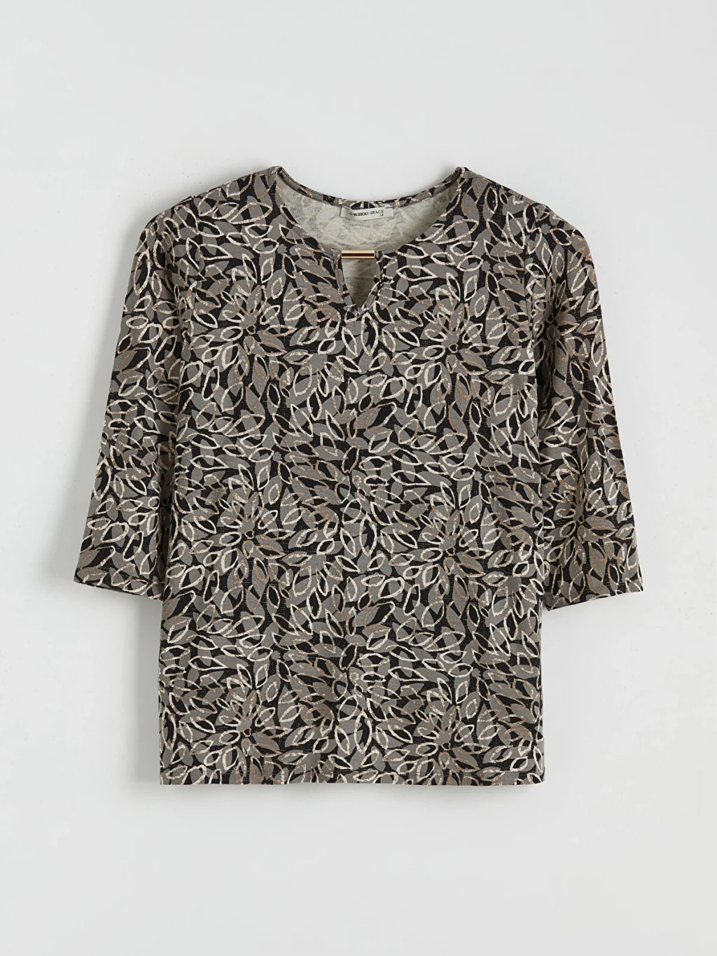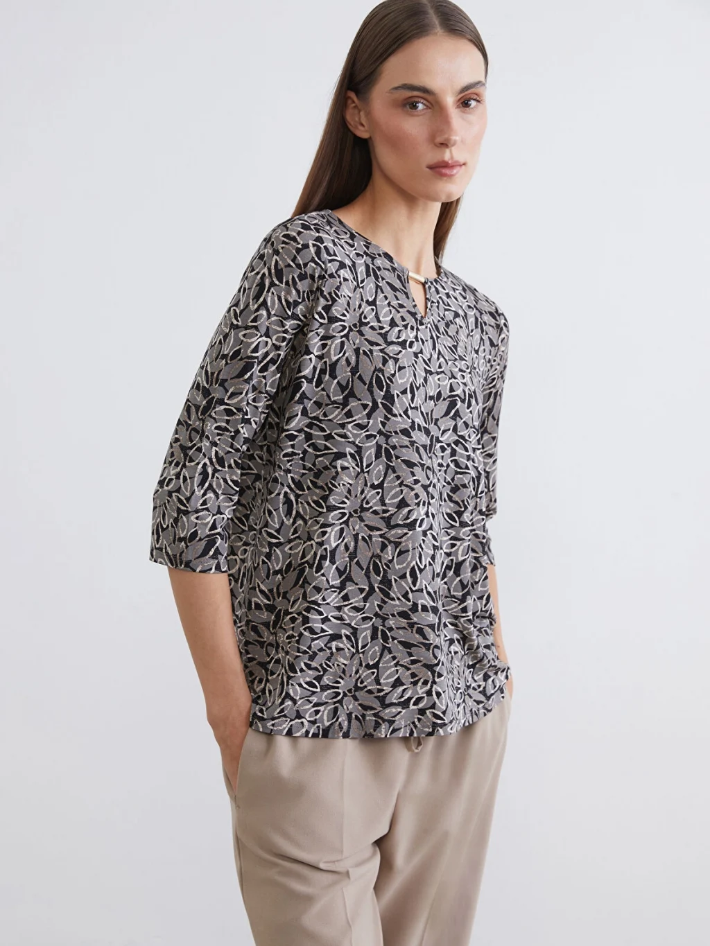 Bisiklet yaka bluz, esnek viskoz elyaftan üretilmiştir. Desenli detaylarıyla tarzınızı yansıtmanıza olanak tanır.