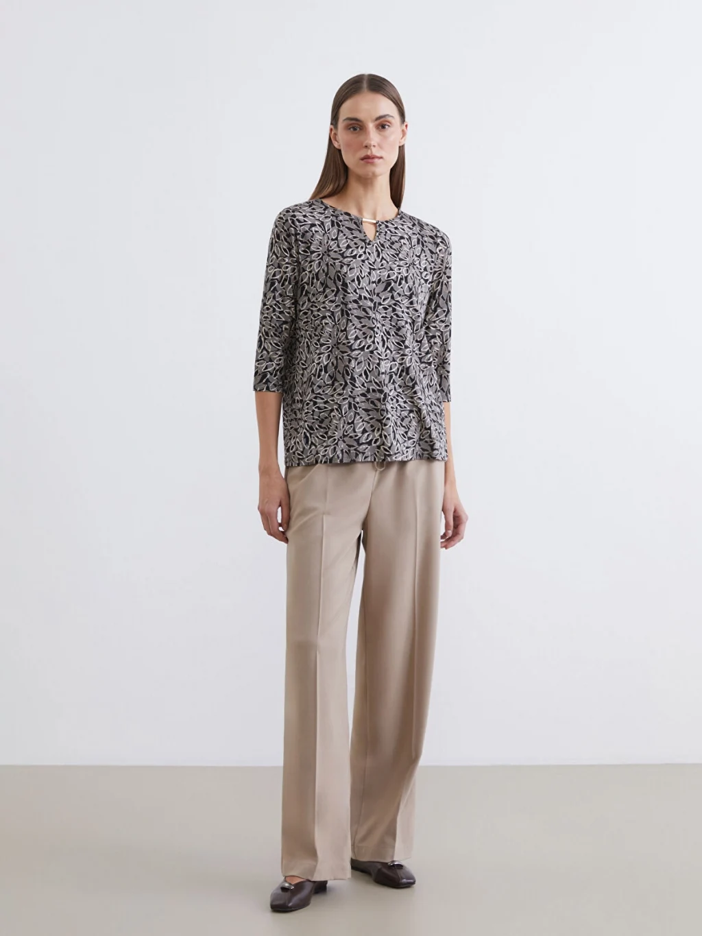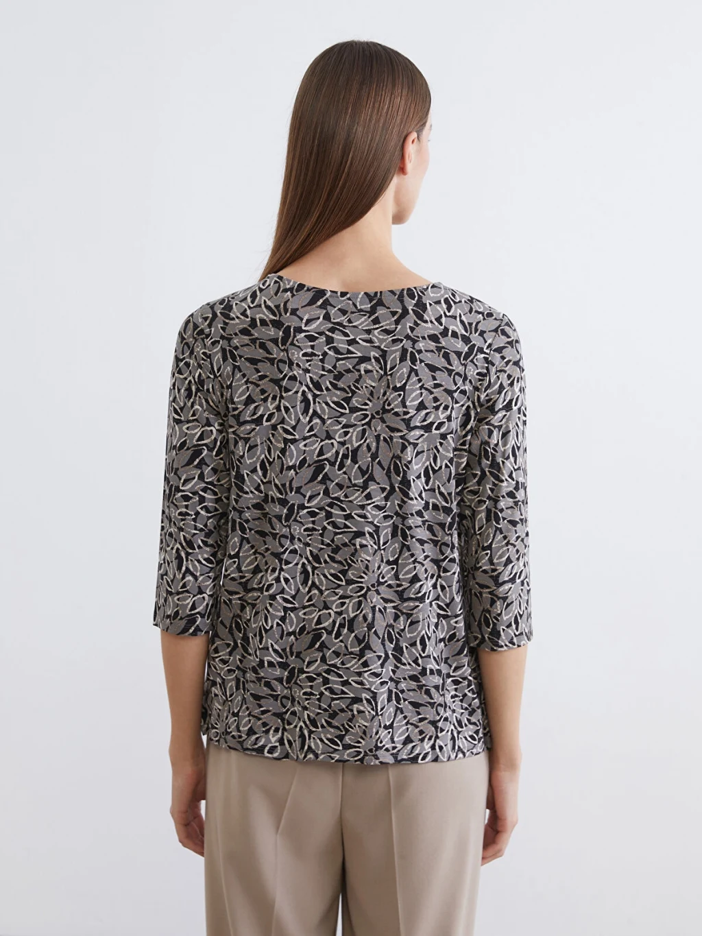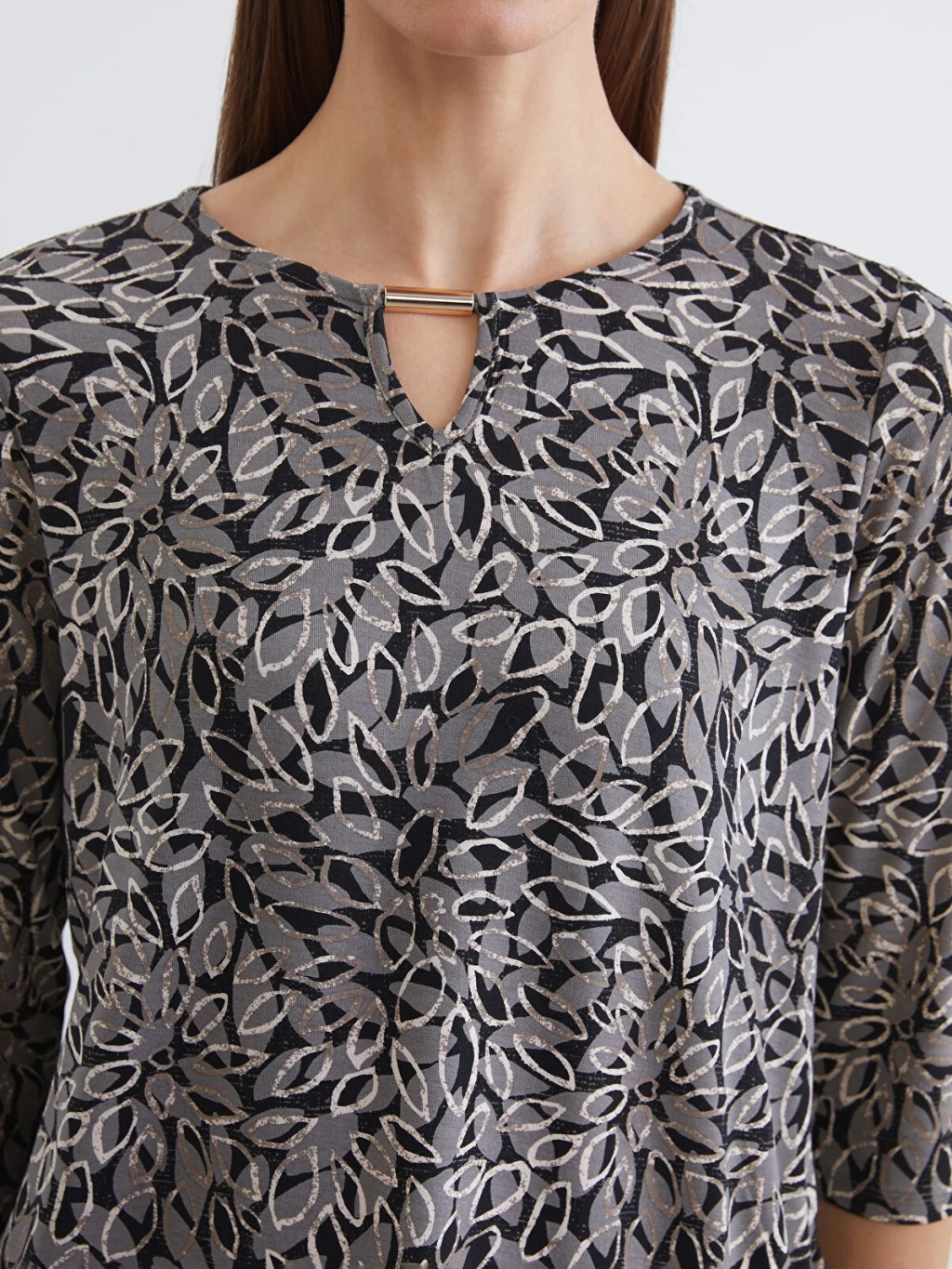 Bisiklet yaka bluz, esnek viskoz elyaftan üretilmiştir. Desenli detaylarıyla tarzınızı yansıtmanıza olanak tanır.