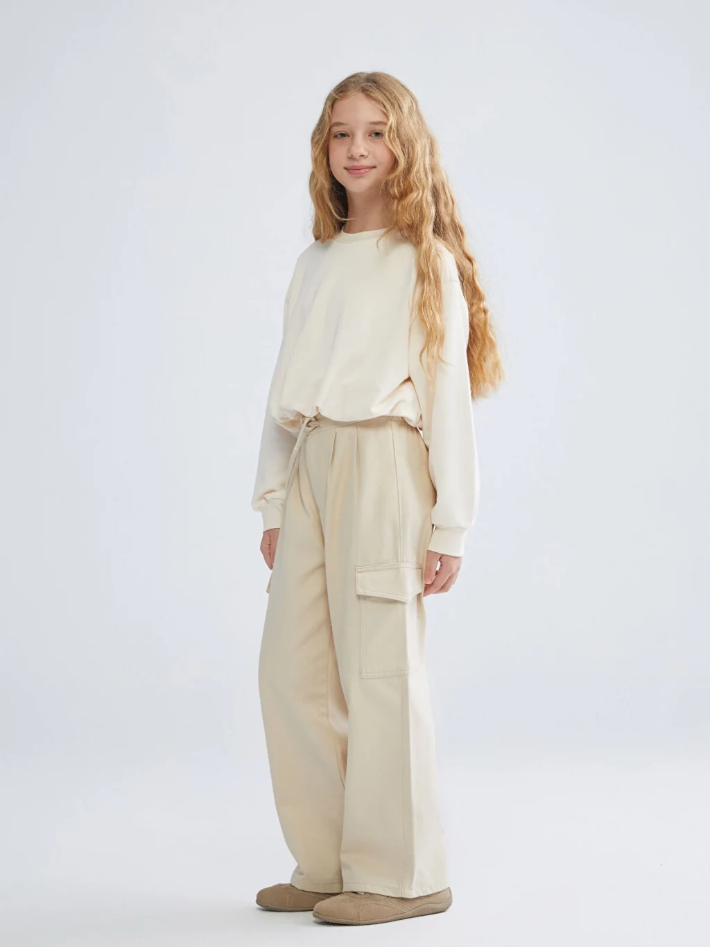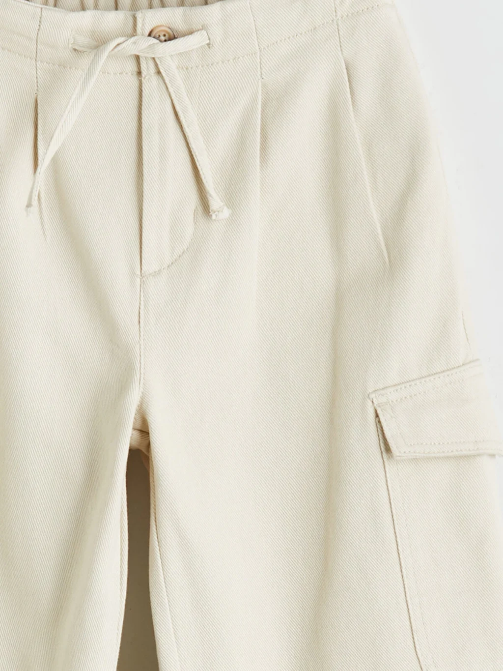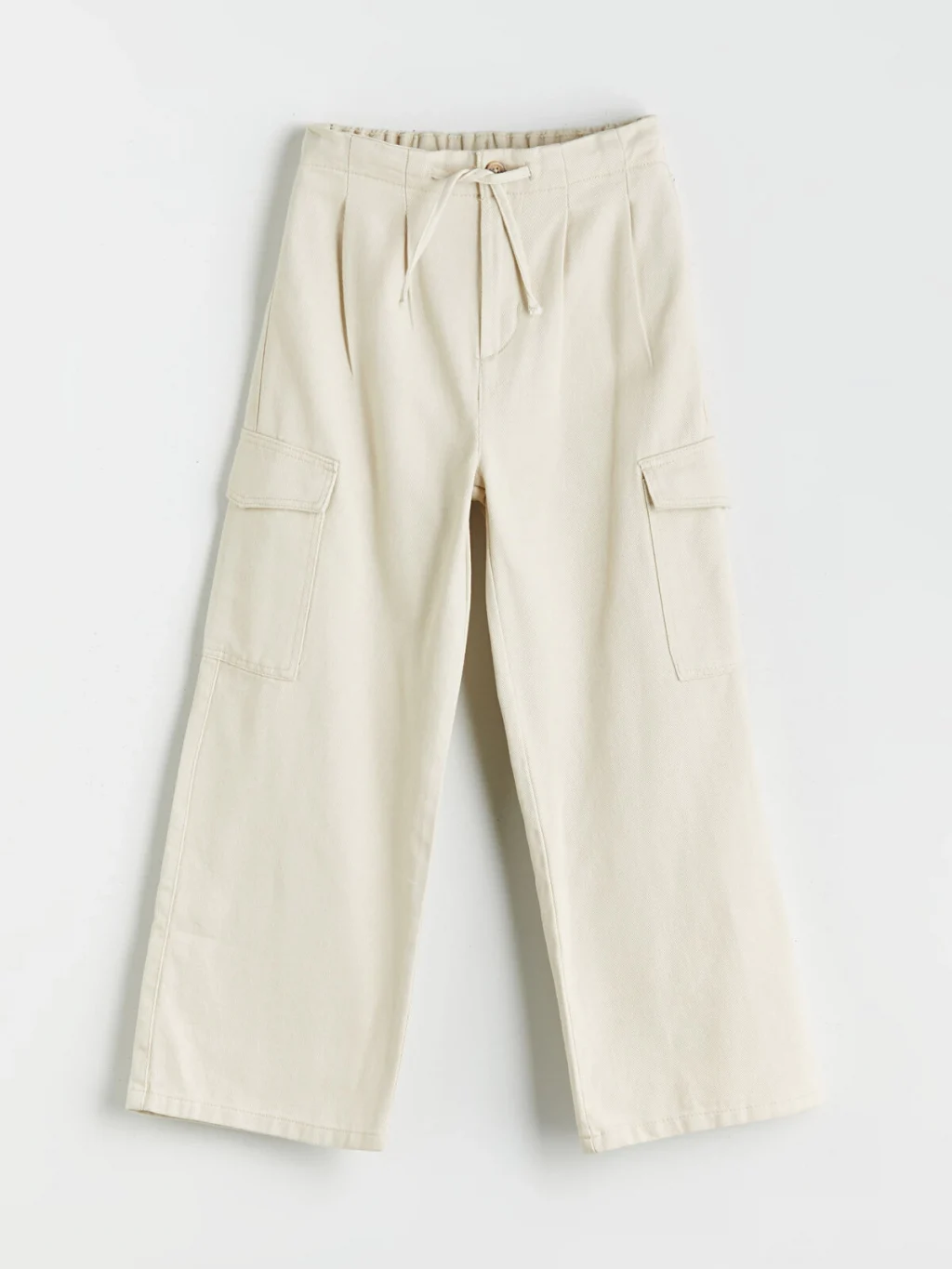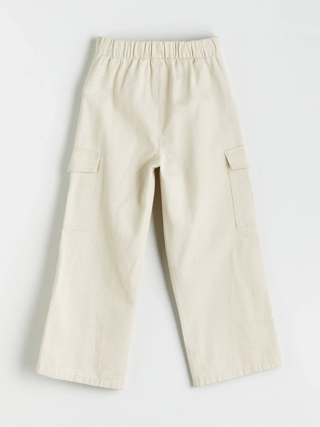 Gabardin kumaştan üretilen kız çocuk pantolon, bol kalıplıdır. Beli lastikli ve bağcıklıdır, önü pileli ve yanları kargo ceplidir.