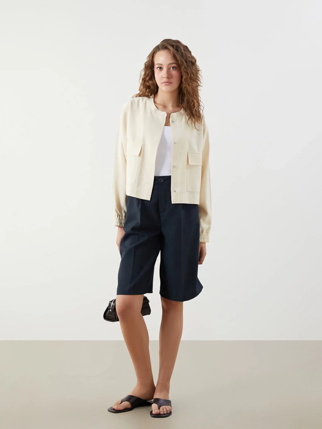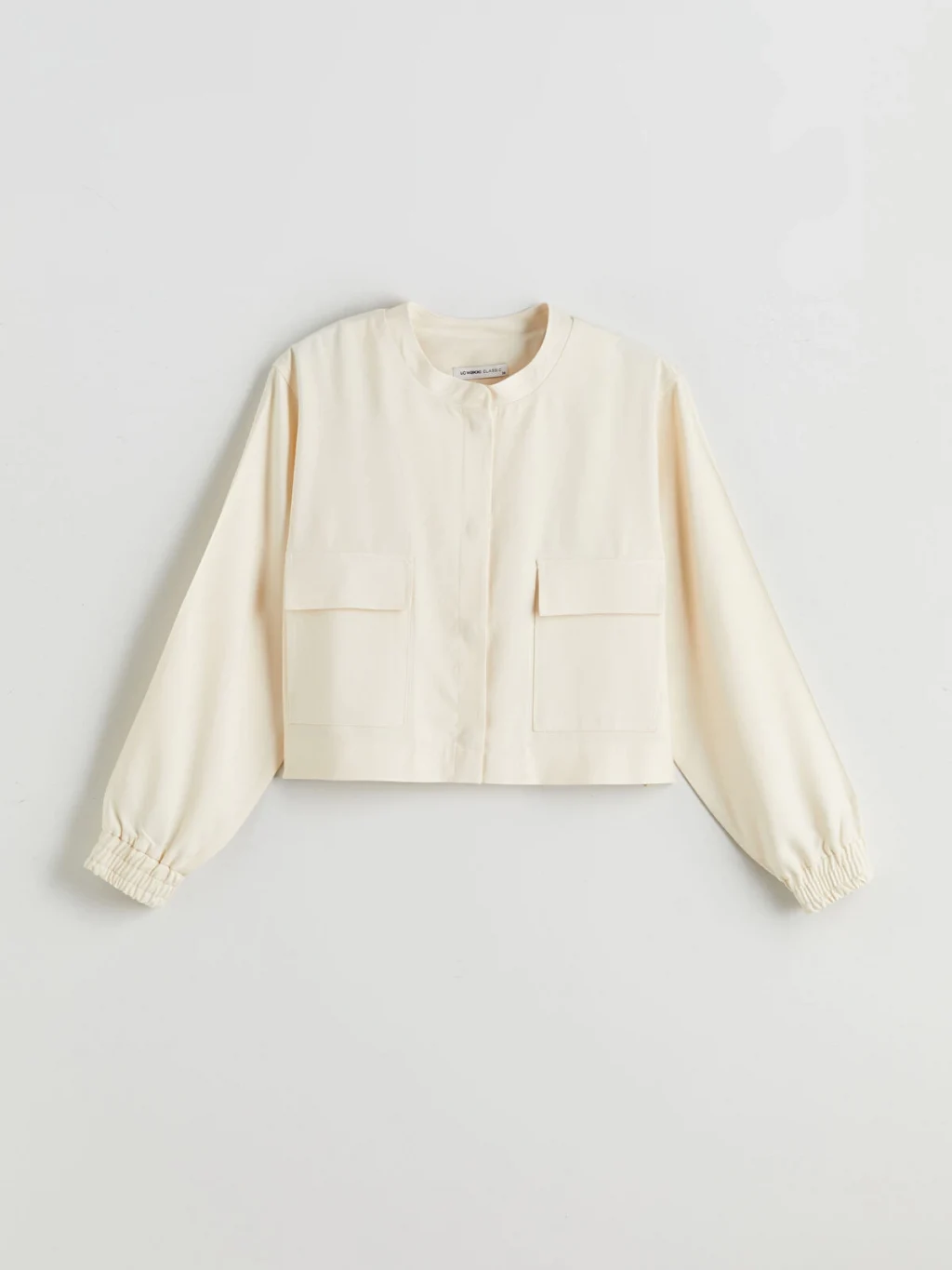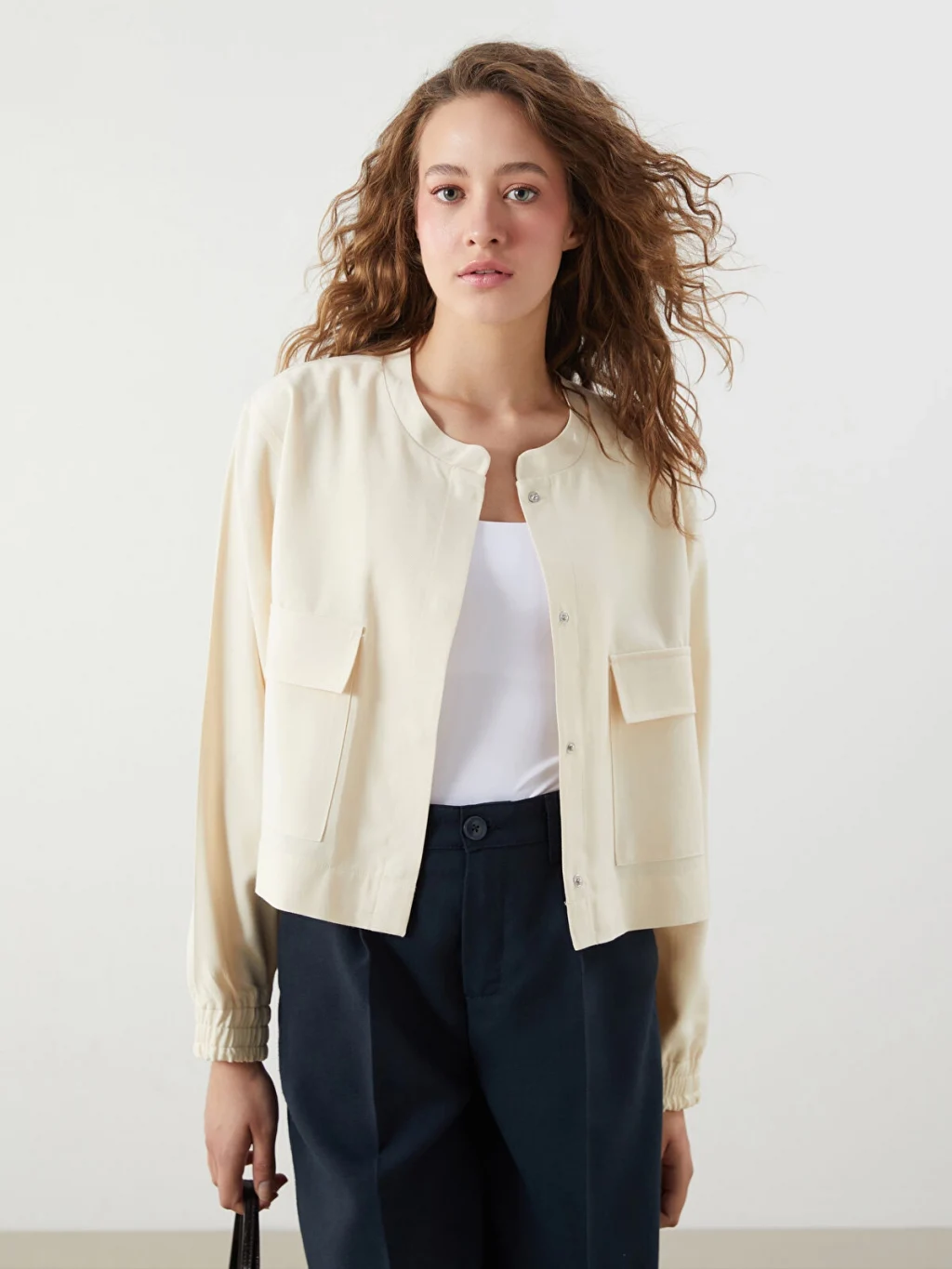 Bisiklet yaka kadın ceket, gabardin kumaştan üretilmiştir. Gizli düğme kapamalı ve iki yandan kapaklı cepli tasarıma sahiptir.