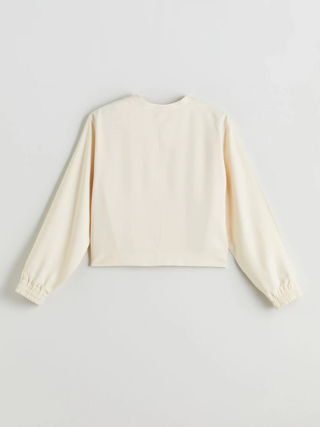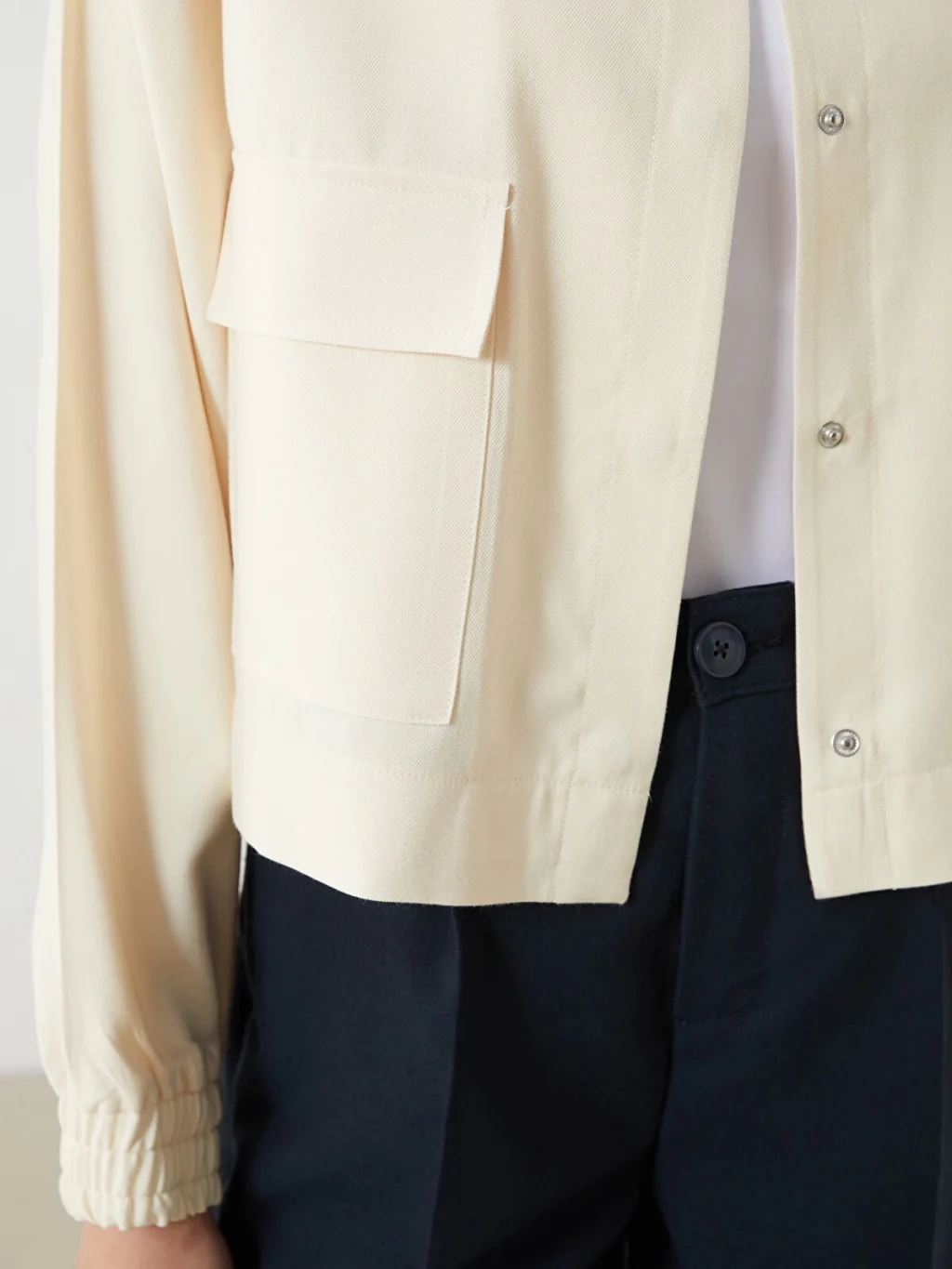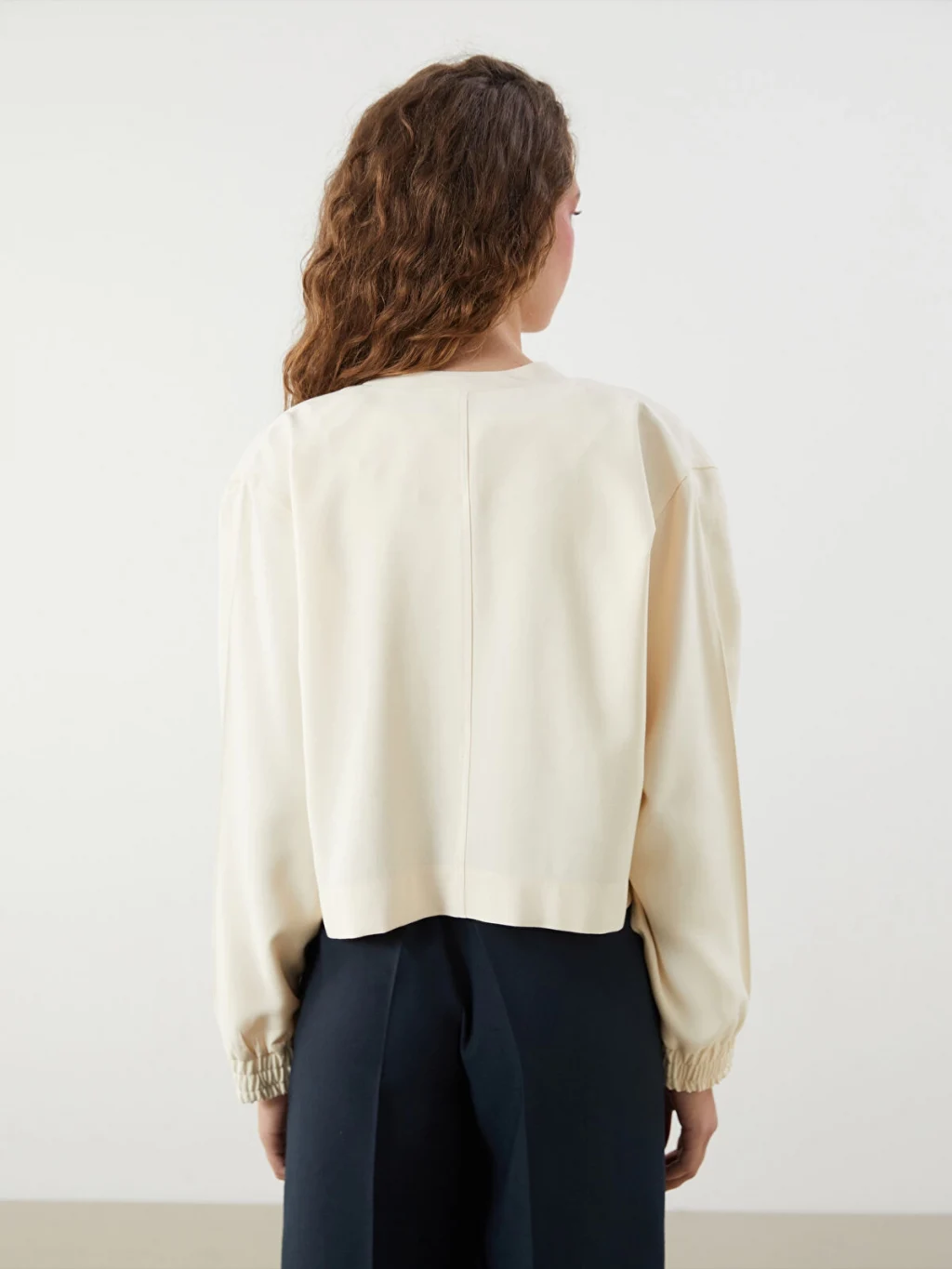 Bisiklet yaka kadın ceket, gabardin kumaştan üretilmiştir. Gizli düğme kapamalı ve iki yandan kapaklı cepli tasarıma sahiptir.